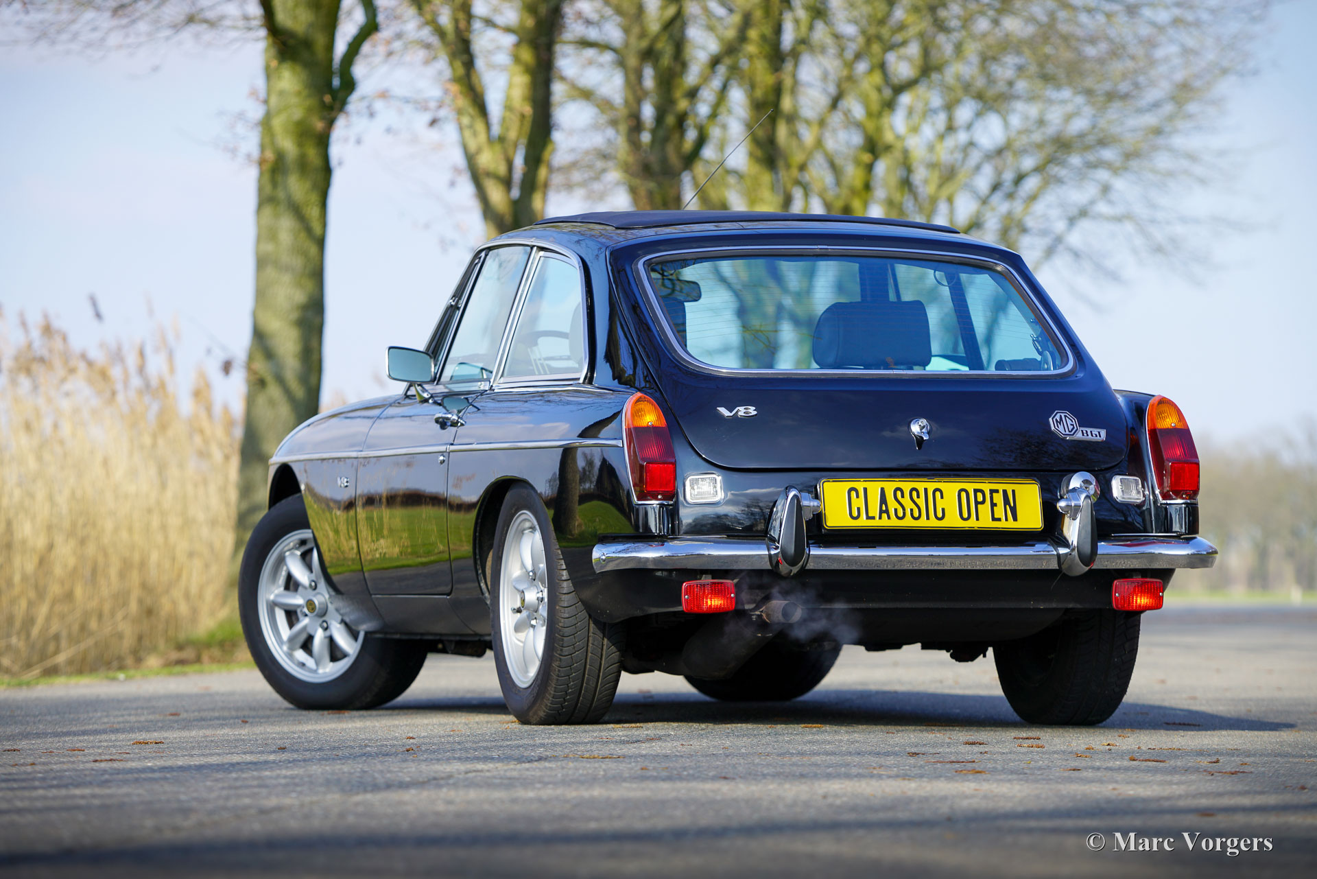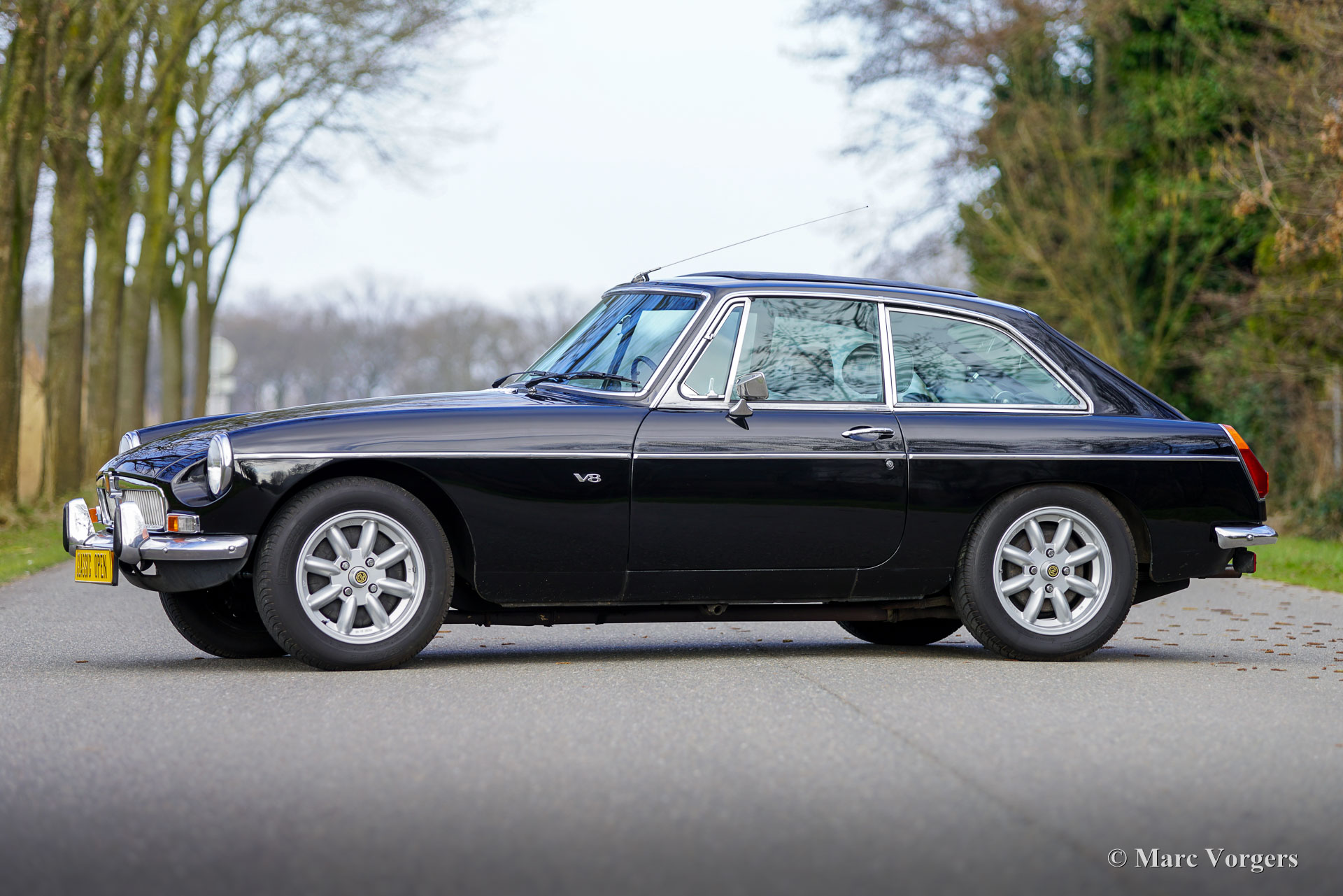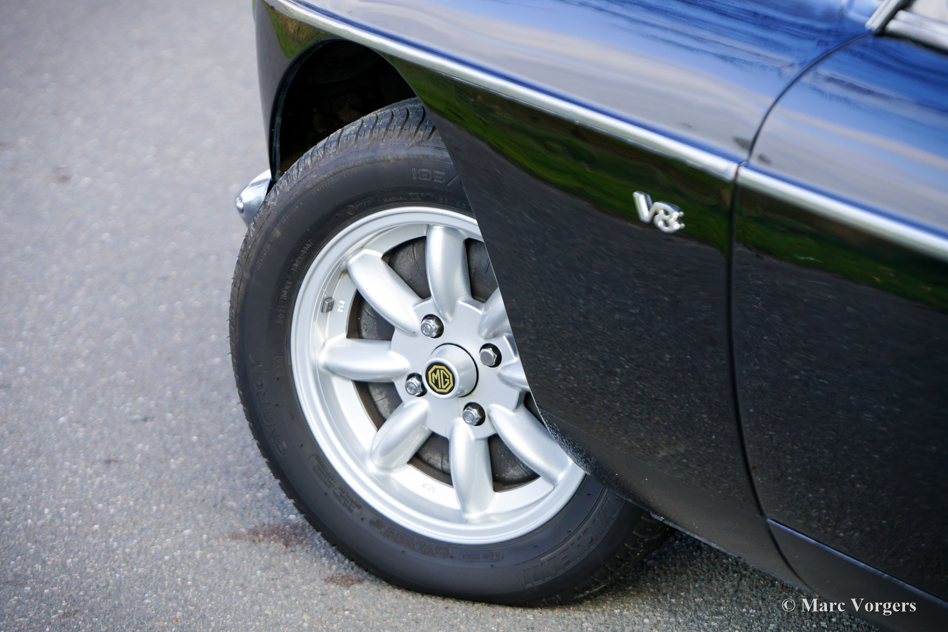 The MG B was the first MG (Morris Garage) built of unitary construction bodywork. The MG B GT V8 was built between 1973 and 1976. In 1970, Ken Costello, a garage owner, installed a Rover 3500 V8 engine in an MG B. MG took over the idea, though engine capacity of the Rover V8 in the MG did not produce 180 hp. at 5500 rpm. but 140 hp. at 5000 rpm. Influenced by the American rules on safety, later models were equipped with synthetic rubber bumpers. Many of the later, built from 1974 until 1976, "rubber-bumper" models are now converted into "chrome-bumper" models. The car shown in these pictures is a original chrome bumper car fitted with the original MG B GT V8 rims.