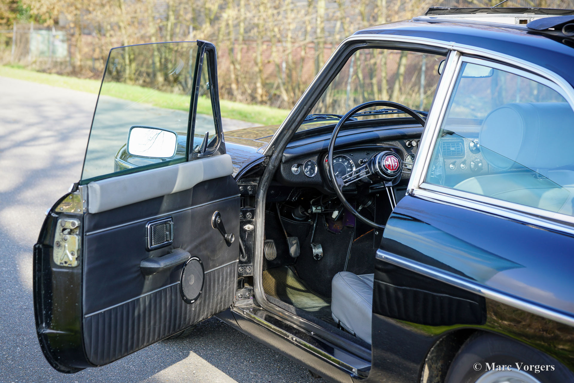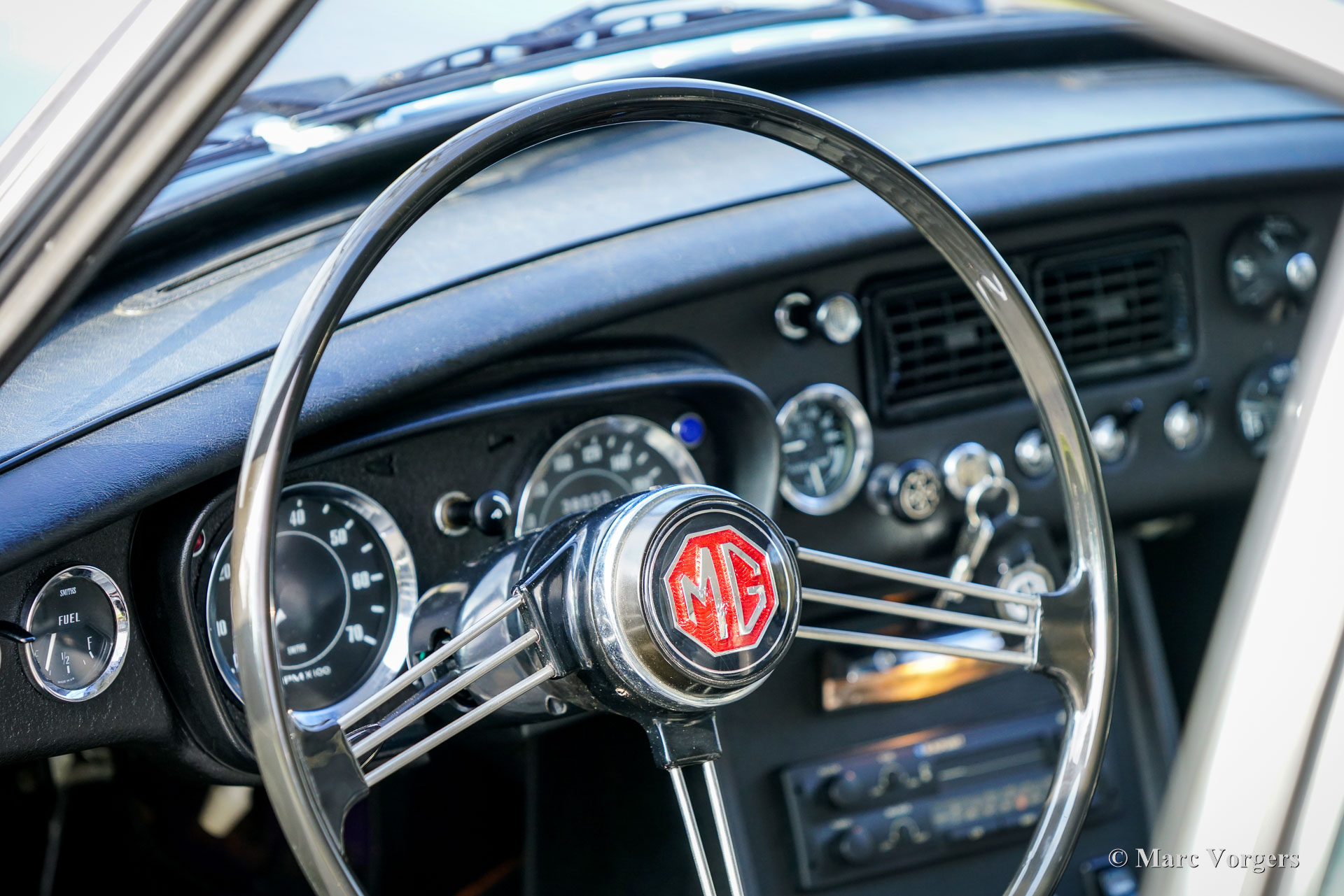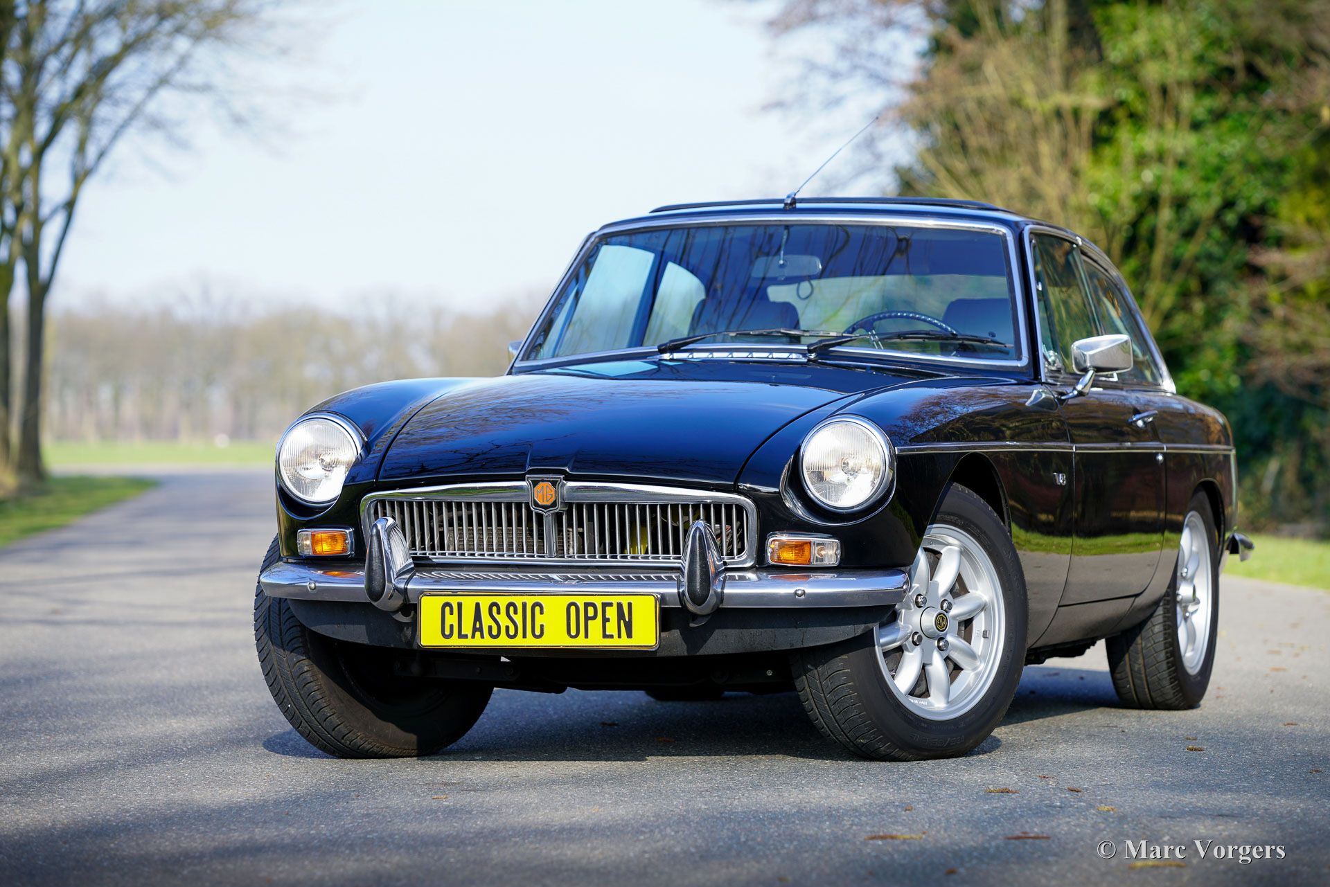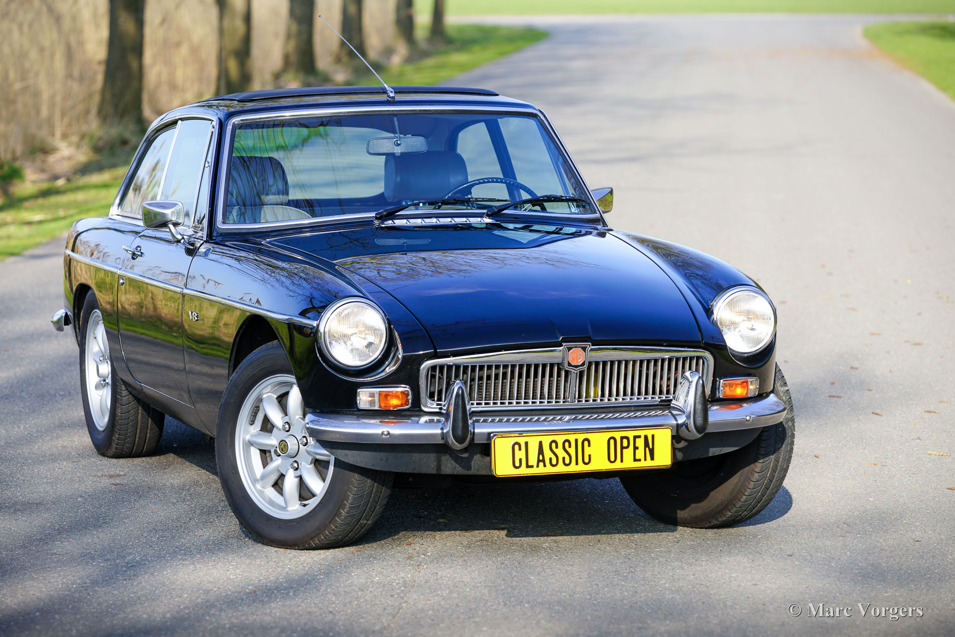 The MG B was the first MG (Morris Garage) built of unitary construction bodywork. The MG B GT V8 was built between 1973 and 1976. In 1970, Ken Costello, a garage owner, installed a Rover 3500 V8 engine in an MG B. MG took over the idea, though engine capacity of the Rover V8 in the MG did not produce 180 hp. at 5500 rpm. but 140 hp. at 5000 rpm. Influenced by the American rules on safety, later models were equipped with synthetic rubber bumpers. Many of the later, built from 1974 until 1976, "rubber-bumper" models are now converted into "chrome-bumper" models. The car shown in these pictures is a original chrome bumper car fitted with the original MG B GT V8 rims.