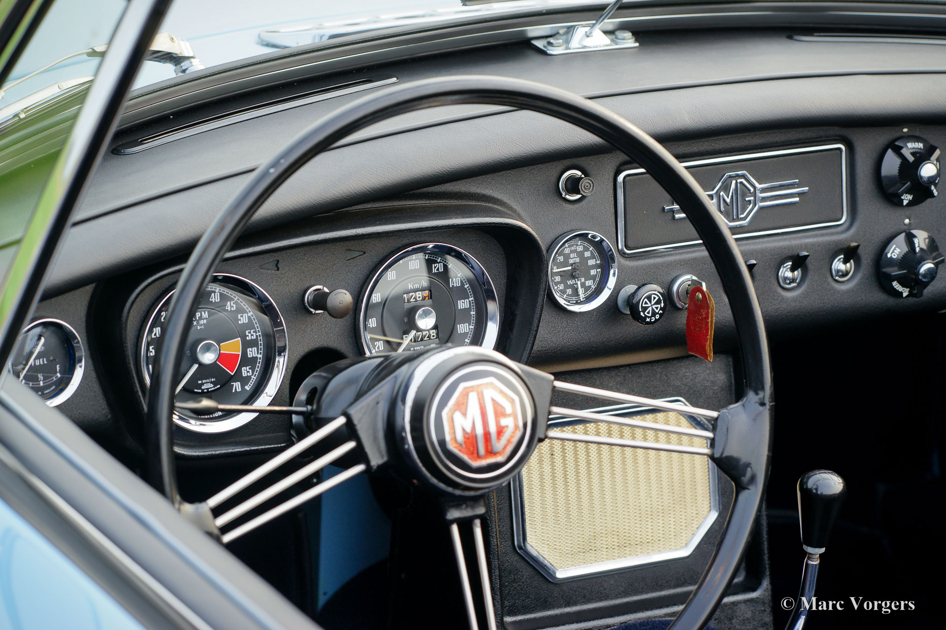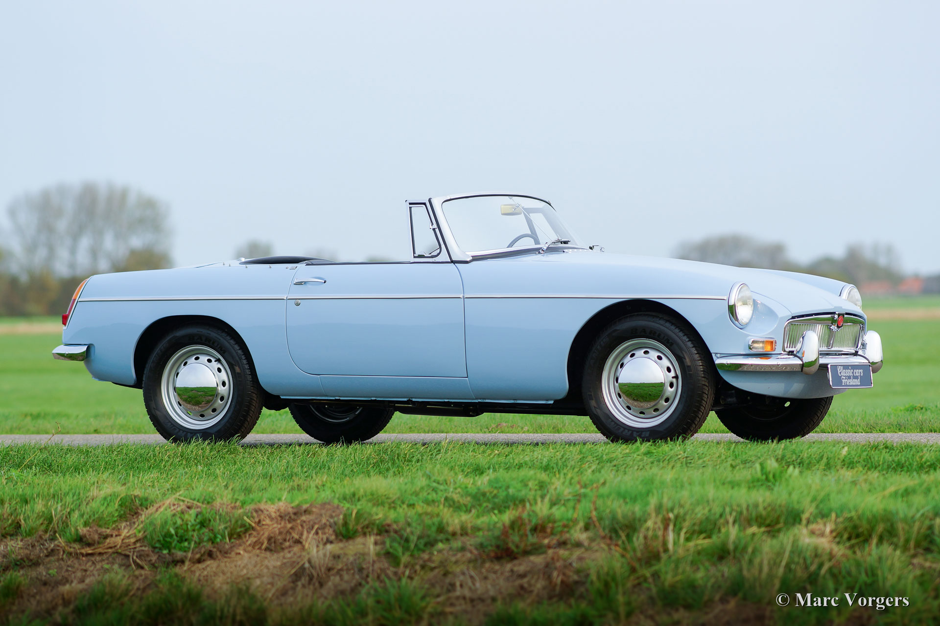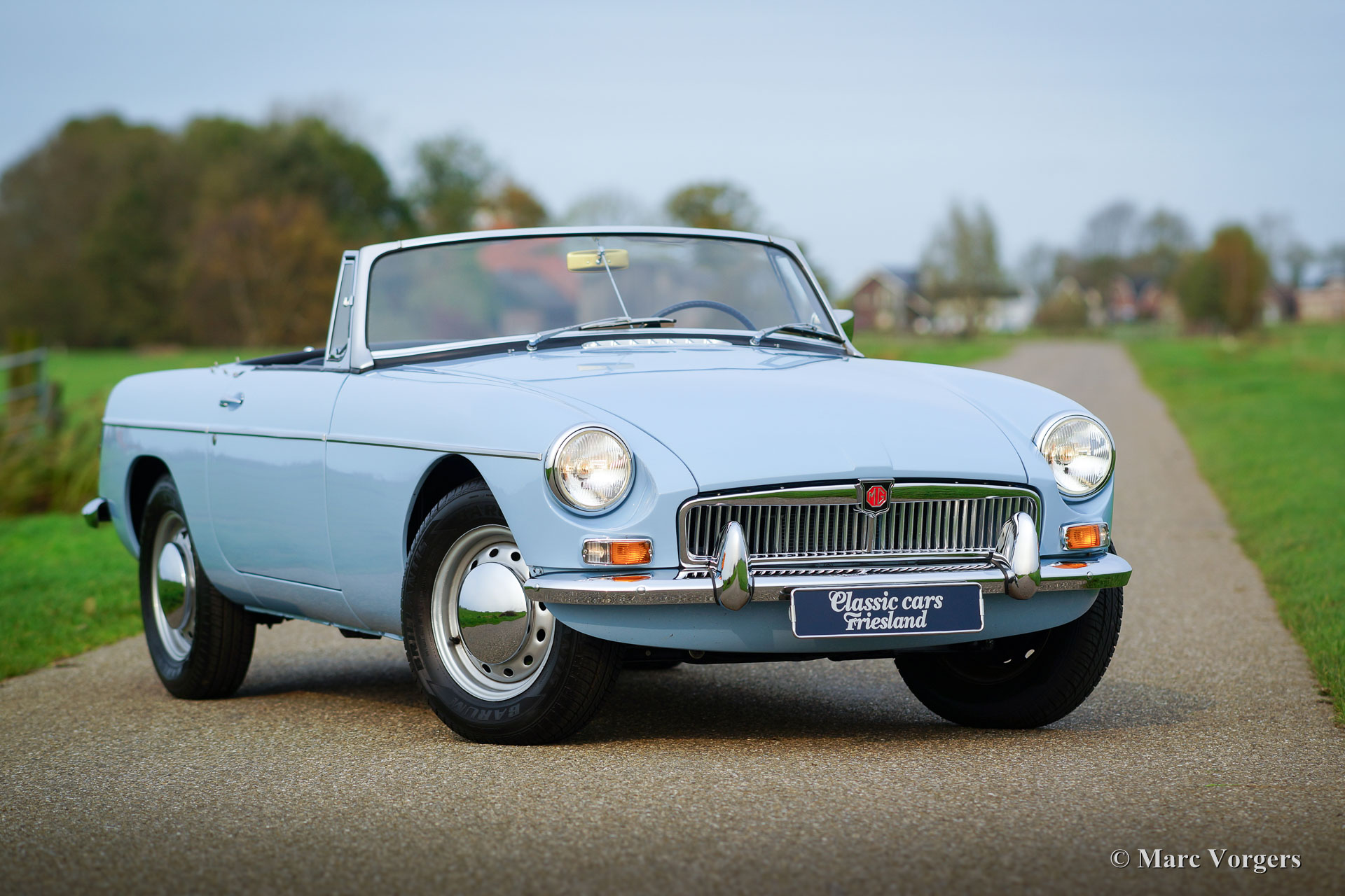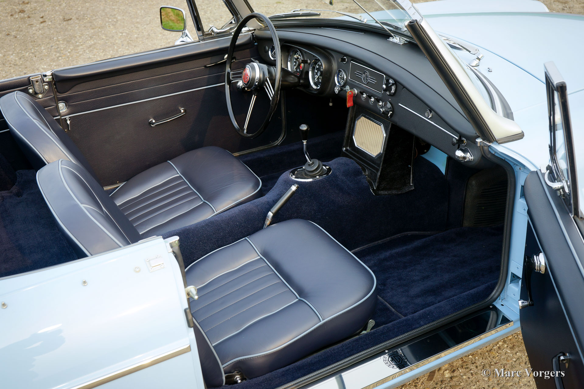 MG MGB roadster (modèle 'porte à tirette'), année 1963. Couleur bleu pâle (Powder Blue) avec un intérieur en cuir bleu foncé garni de passepoil bleu pâle. Moquette bleu foncé luxueuse, capote noire et capuche noir. Cette magnifique MGB est un modèle «porte à tirette» précoce avec les poignées de porte spéciales et tous les autres détails spéciaux comme les premières roues à disque avec enjoliveurs chromés et la magnifique direction originale arborant le grand logo MG. Ce superbe roadster MGB fut restauré et révisé détaillée et parfaitement par un spécialiste MG aux Pays-Bas. L'automobile est en meilleur état TOP : Concours ! Un reportage photo étendu de la restauration est présent. Parmi les autres composants, le moteur, la boîte de vitesses, la suspension et les instruments du tableau de bord (jauges) furent révisés. Parmi les autres pièces, le câblage, les freins, le radiateur, les parties chromées, les fenêtres, les pneus et l'échappement (maintenant en acier inoxydable) furent renouvelés. Les roues en acier furent émaillées au four, et le tableau de bord en métal fut magnifiquement peint avec la peinture d'effet d'ondulation noire. Le corps présente alignement des panneaux parfaite et une peinture haut de gamme. Où que vous regardes Tout est comme neuf ! La voiture est livrée avec un certificat de patrimoine (Heritage Certificate) qui confirme que ce corps, ce moteur et cette boîte de vitesses sont d'origine ; ‘Matching Numbers’. Un ensemble d'outils original, un manuel du propriétaire et un manuel d'atelier sont également présents. C’est un spécimen TOP rare !