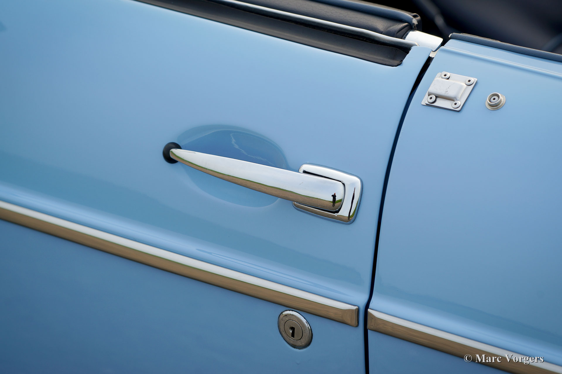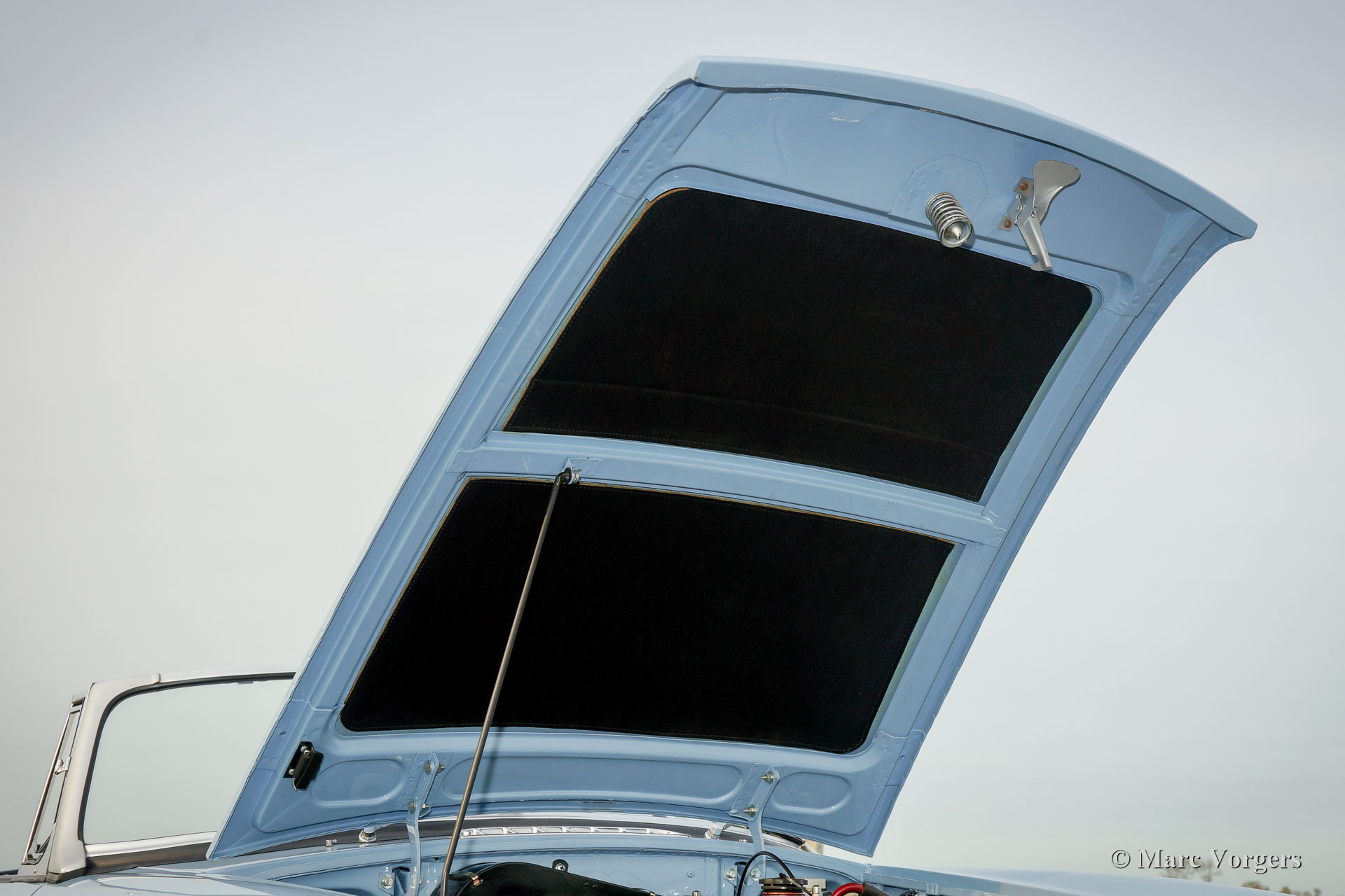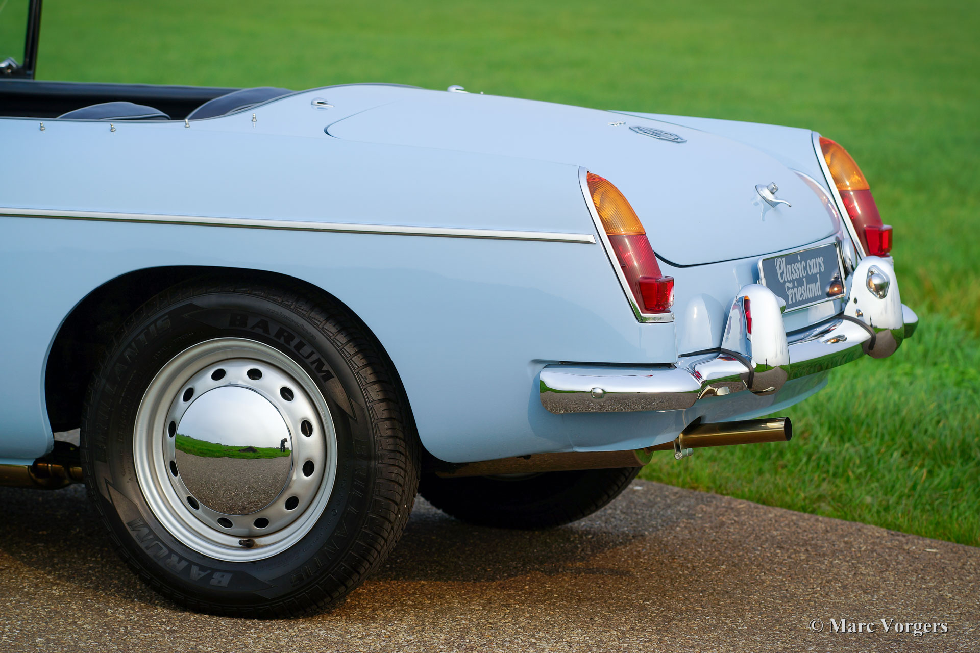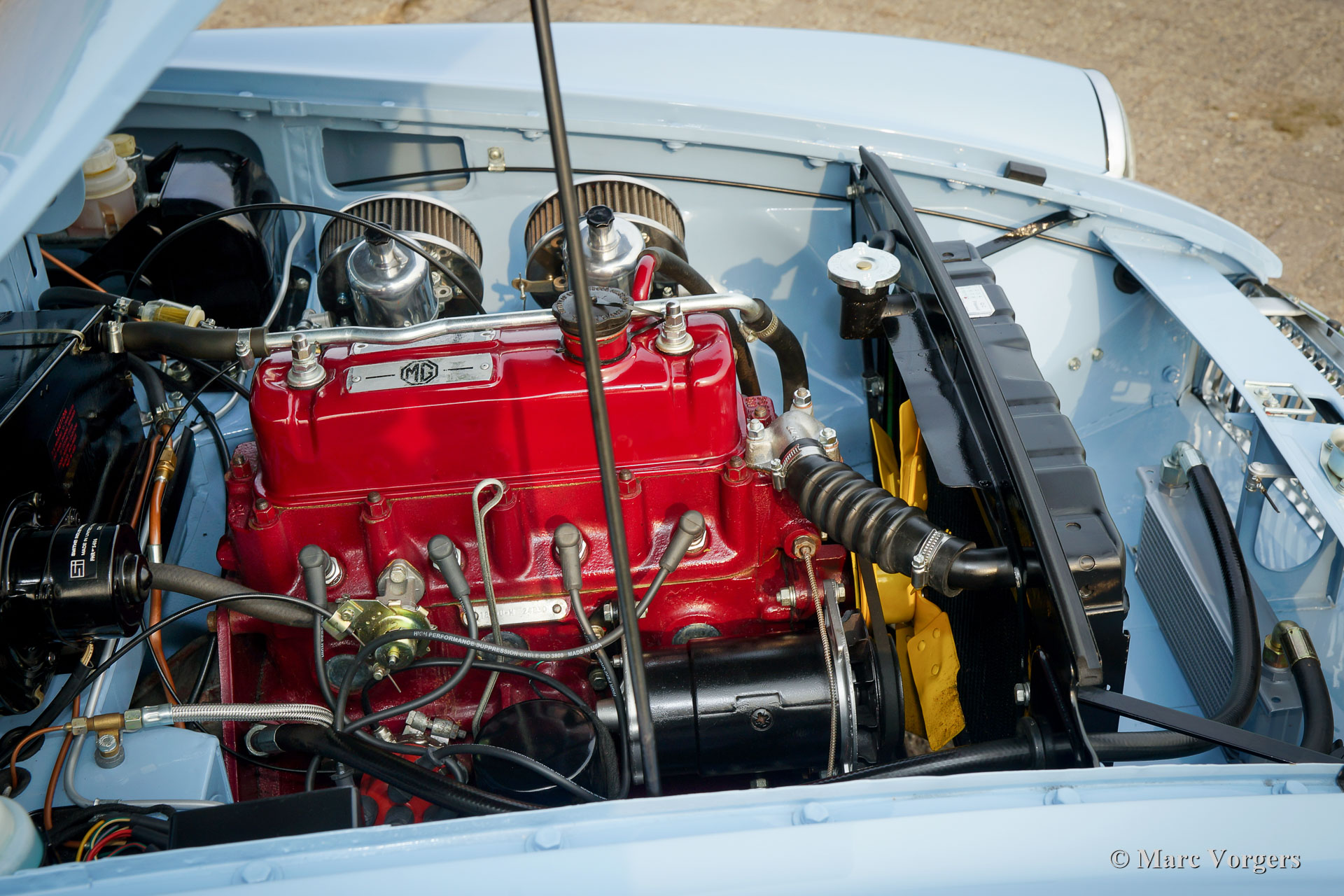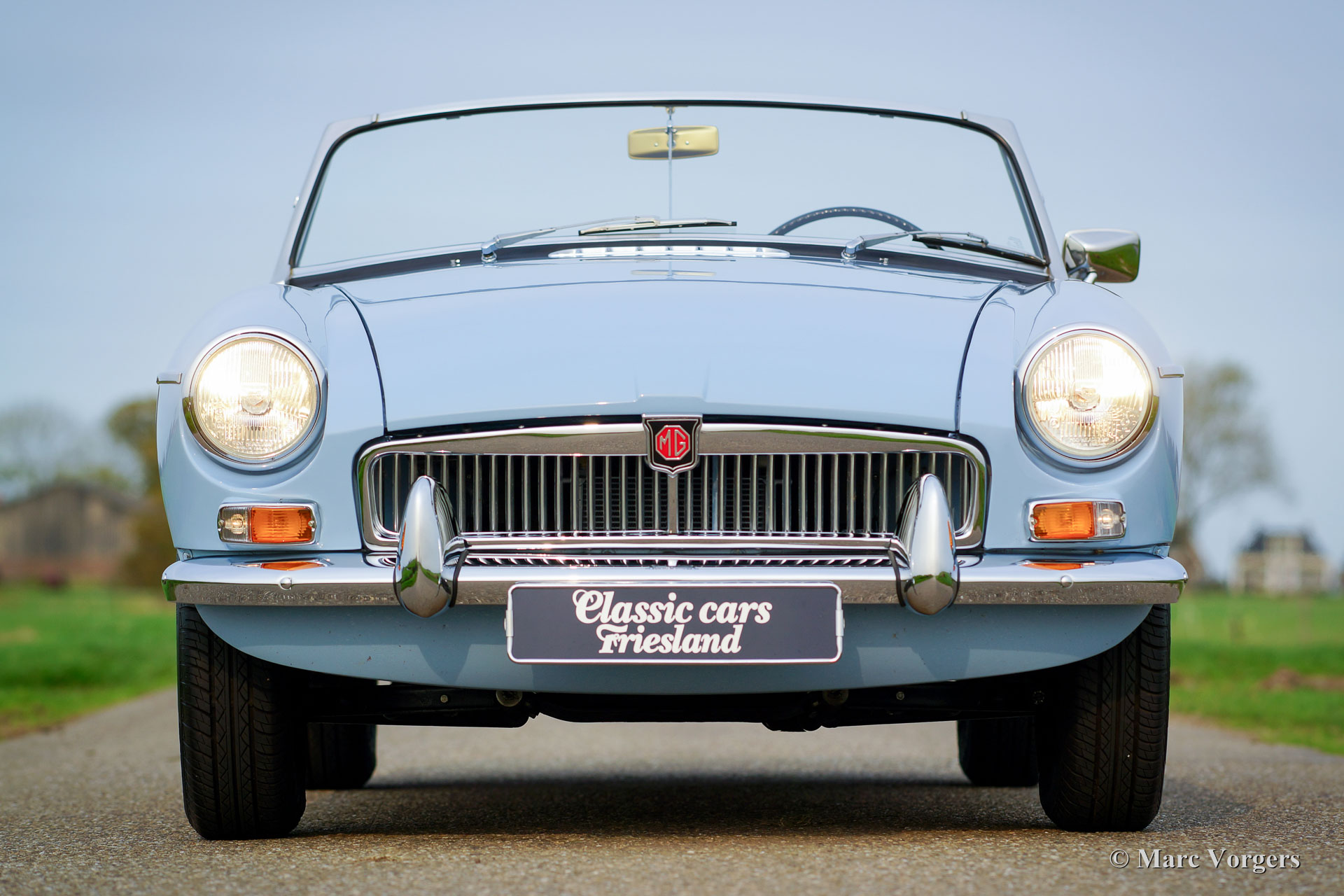 MG MGB roadster (modèle 'porte à tirette'), année 1963. Couleur bleu pâle (Powder Blue) avec un intérieur en cuir bleu foncé garni de passepoil bleu pâle. Moquette bleu foncé luxueuse, capote noire et capuche noir. Cette magnifique MGB est un modèle «porte à tirette» précoce avec les poignées de porte spéciales et tous les autres détails spéciaux comme les premières roues à disque avec enjoliveurs chromés et la magnifique direction originale arborant le grand logo MG. Ce superbe roadster MGB fut restauré et révisé détaillée et parfaitement par un spécialiste MG aux Pays-Bas. L'automobile est en meilleur état TOP : Concours ! Un reportage photo étendu de la restauration est présent. Parmi les autres composants, le moteur, la boîte de vitesses, la suspension et les instruments du tableau de bord (jauges) furent révisés. Parmi les autres pièces, le câblage, les freins, le radiateur, les parties chromées, les fenêtres, les pneus et l'échappement (maintenant en acier inoxydable) furent renouvelés. Les roues en acier furent émaillées au four, et le tableau de bord en métal fut magnifiquement peint avec la peinture d'effet d'ondulation noire. Le corps présente alignement des panneaux parfaite et une peinture haut de gamme. Où que vous regardes Tout est comme neuf ! La voiture est livrée avec un certificat de patrimoine (Heritage Certificate) qui confirme que ce corps, ce moteur et cette boîte de vitesses sont d'origine ; ‘Matching Numbers’. Un ensemble d'outils original, un manuel du propriétaire et un manuel d'atelier sont également présents. C’est un spécimen TOP rare !