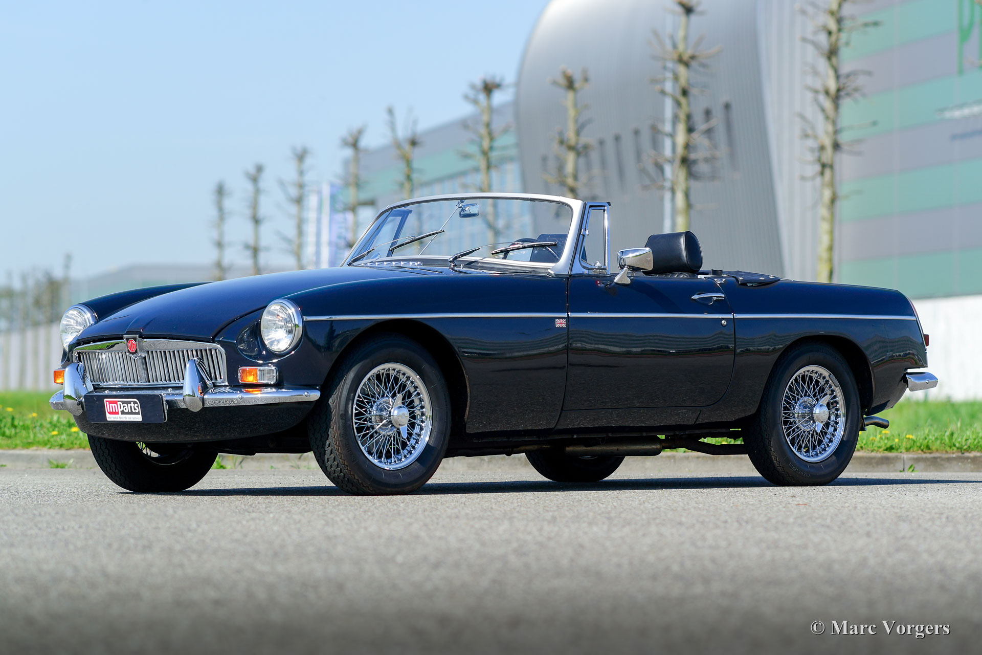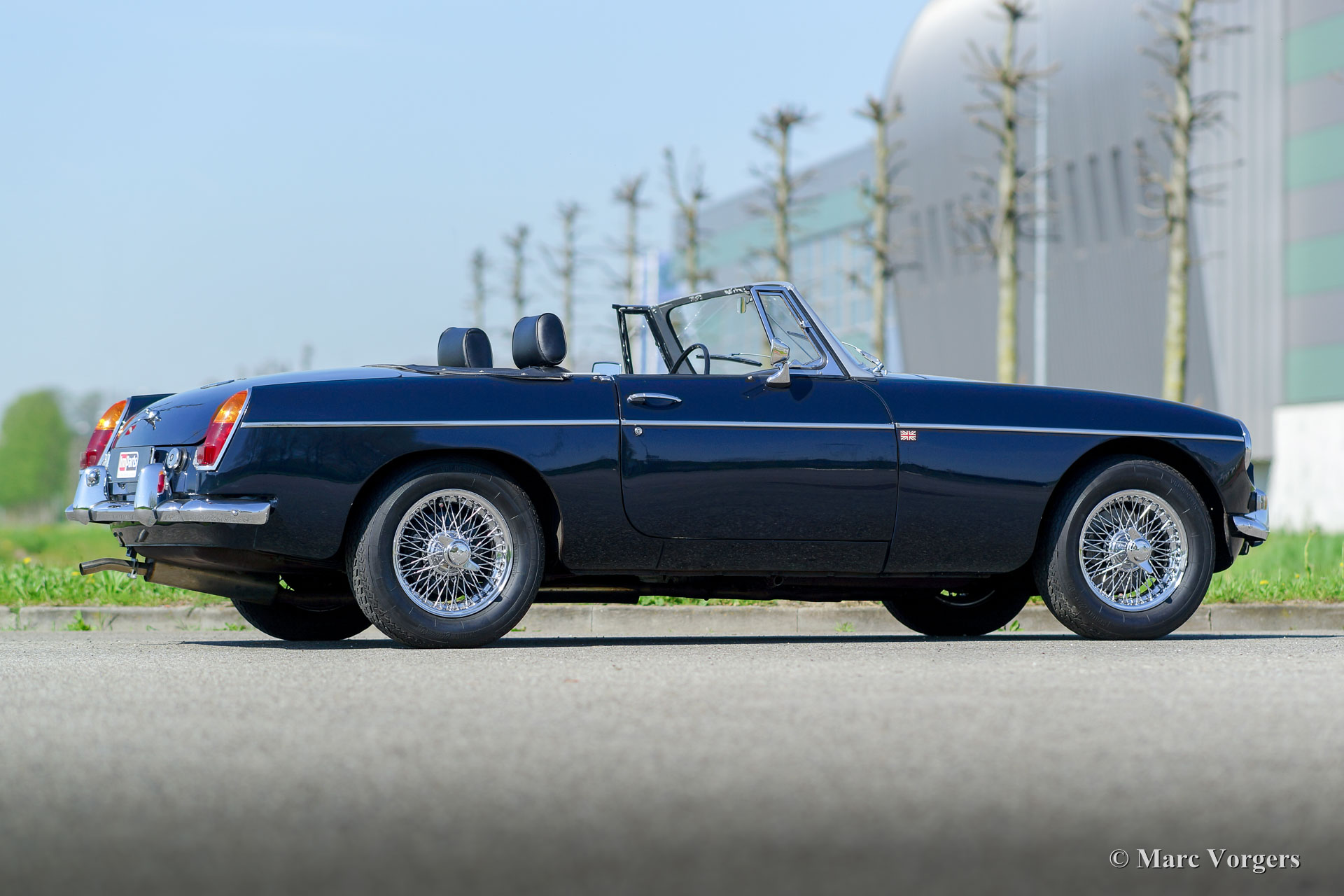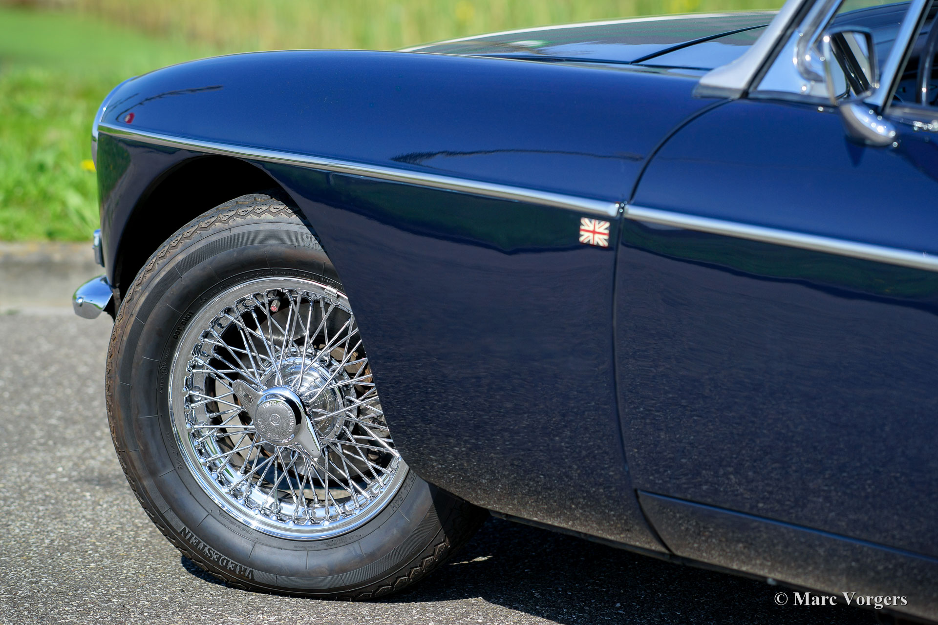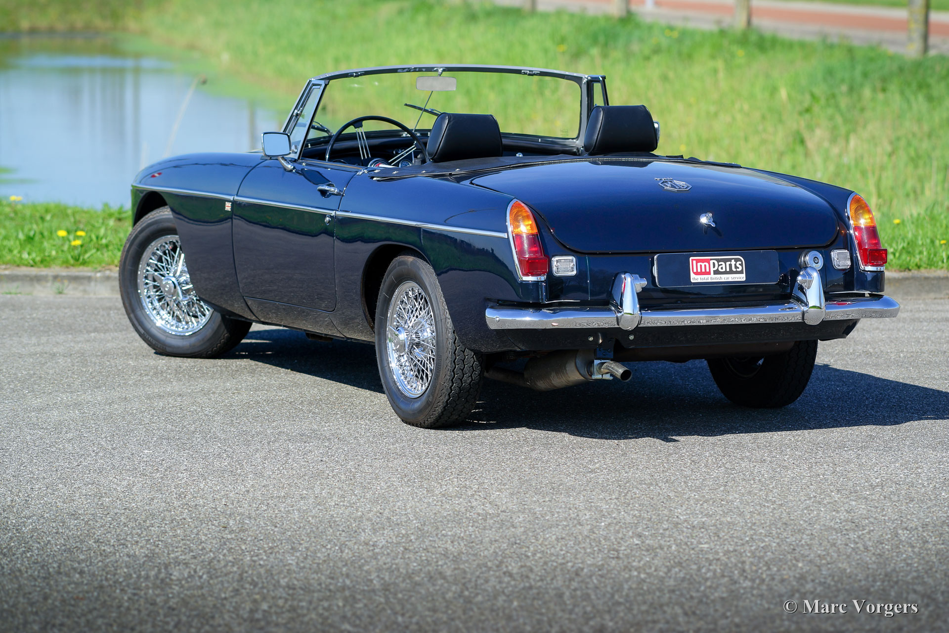 MG MGB roadster, année 1968. Couleur bleu foncé avec un intérieur en cuir noir, tapis noir et une capote noire. Ce MG MGB roadster fut construit en 1966 et il a été immatriculé pour la première fois en 1968. L'automobile fut restaurée détaillée il y a quelques années ; la voiture est en superbe état ! Ces premiers modèles MGB sont équipés d'une capote de type « pack-away » qui est stockée complètement dans la chaussure. La voiture est dotée de jolies roues de fil chromées, de sièges confort spéciaux avec les dossiers plus hauts et repose-têtes, d'un allumage électronique, d'un ventilateur électrique et d'une radio classique avec antenne télescopique dissimulée sous le tableau de bord ! Ce modèle MGB au début montre un tableau de bord en métal originaux et le magnifique volant d'origine en pleine gloire ! Un superbe exemple !