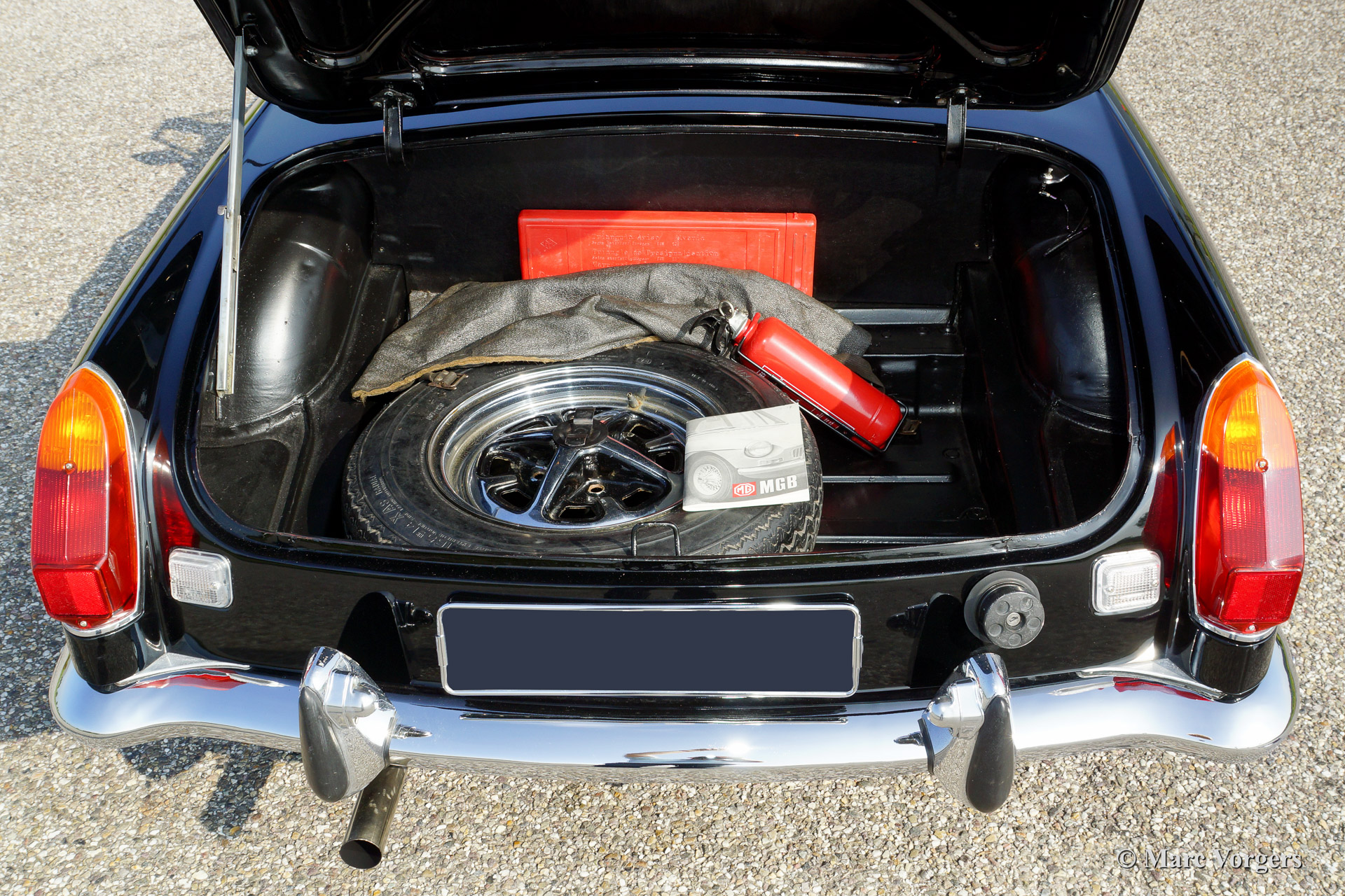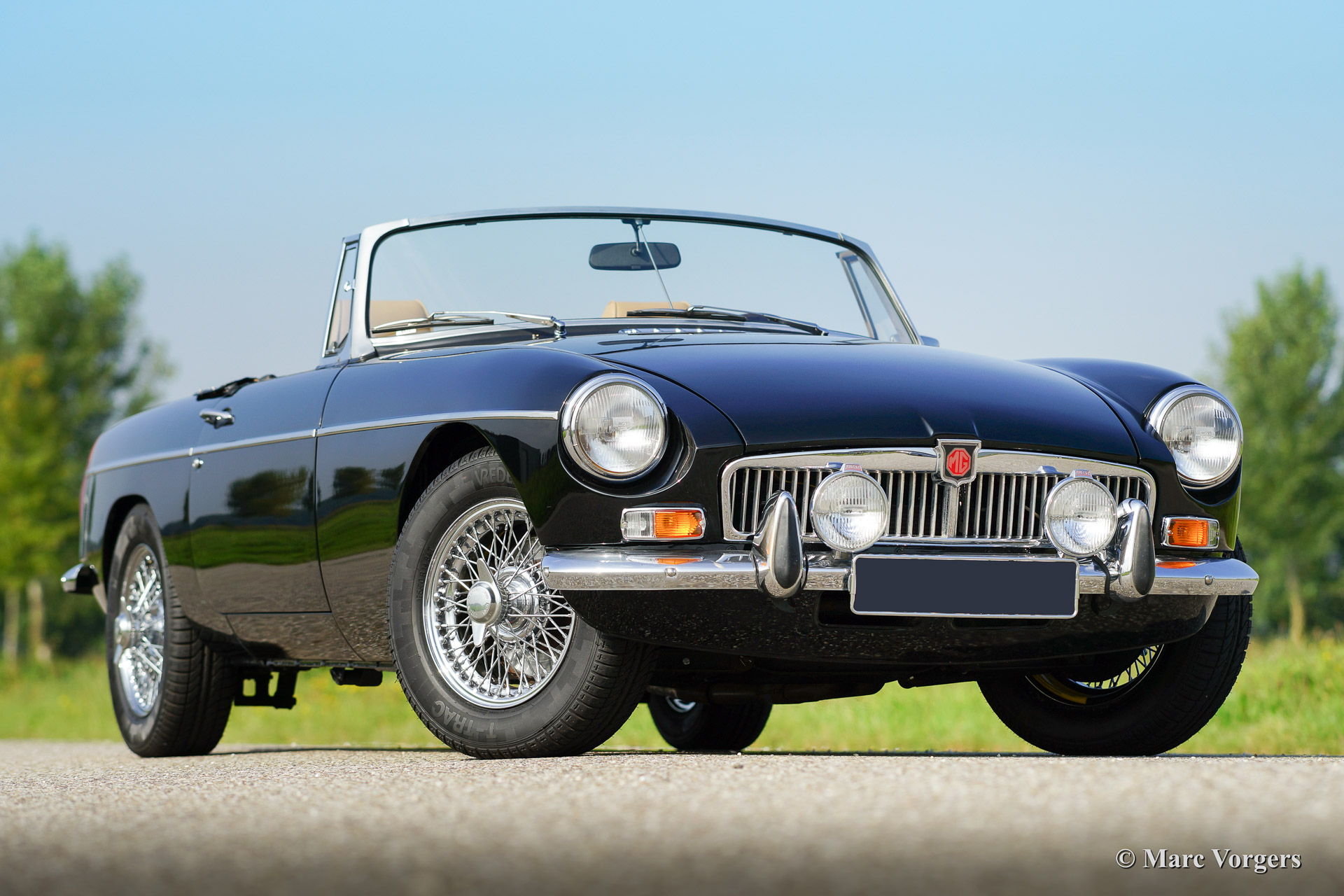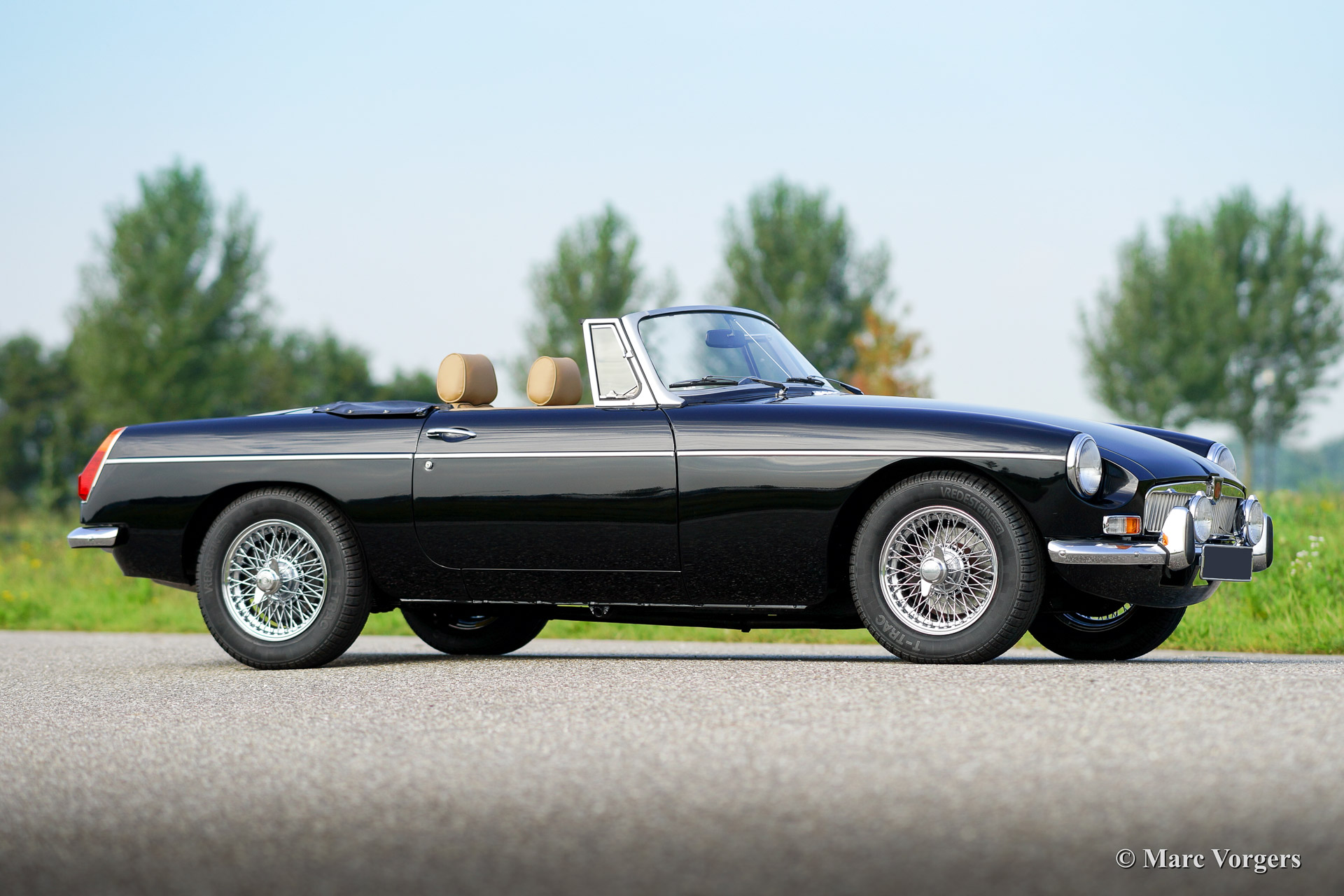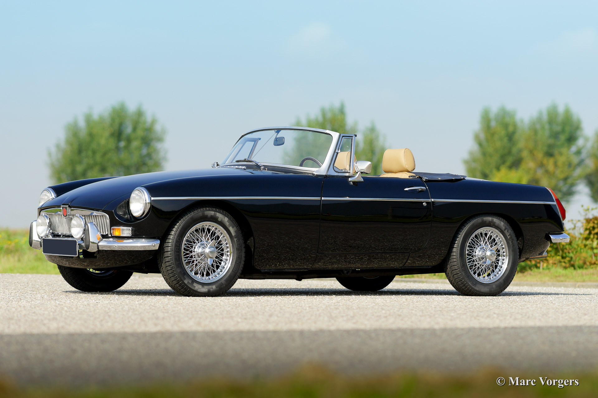 MG MGB roadster, year 1973. Colour black with a (tan) beige leather interior. Black soft top, hood cover and tonneau cover. This MGB was sold new to the Netherlands. The automobile features overdrive, chrome wire wheels, additional driving lamps at the front, AC dynamo, Stainless Steel exhaust and a beautiful sports steering wheel.