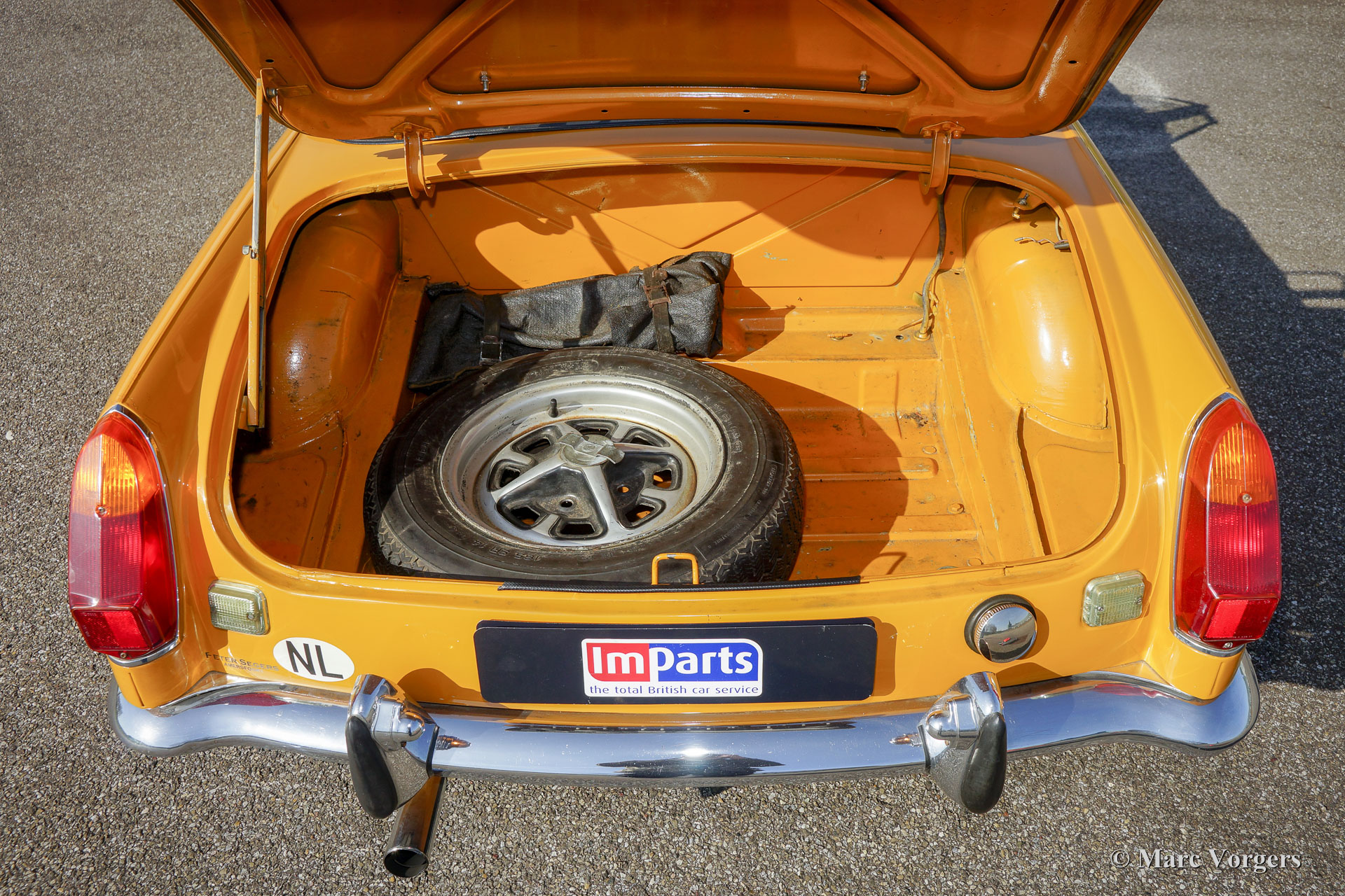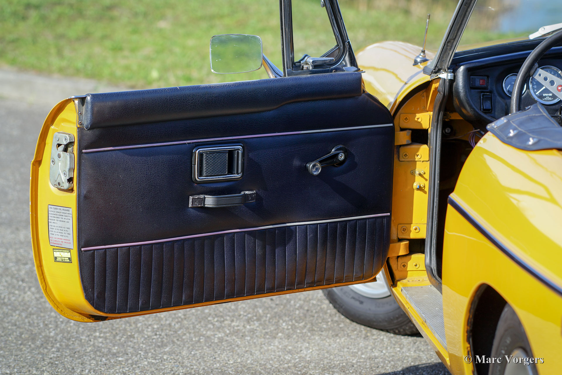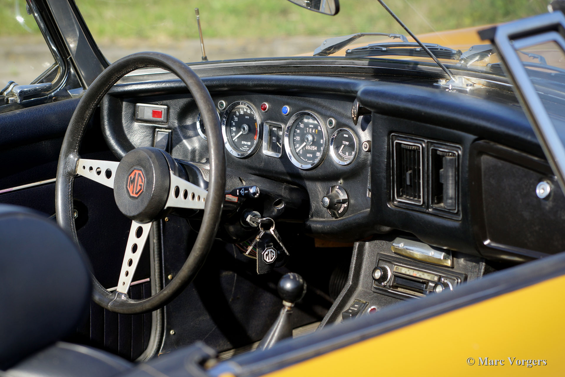 MG roadster MG, année 1973. Couleur jaune ocre combinée avec un intérieur en similicuir noir, tapis noir et une capote noire. Cette beau roadster MGB vient d'un passionné qui possède la voiture depuis 27 ans! La voiture est en très bon état de conduite avec des traces d'utilisation normales - un MGB idéal pour profiter au maximum ! La voiture dispose du moteur de 1800 cc, des roues Rostyle d'origine, de l'overdrive et d'un échappement en acier inoxydable. S'amuser !