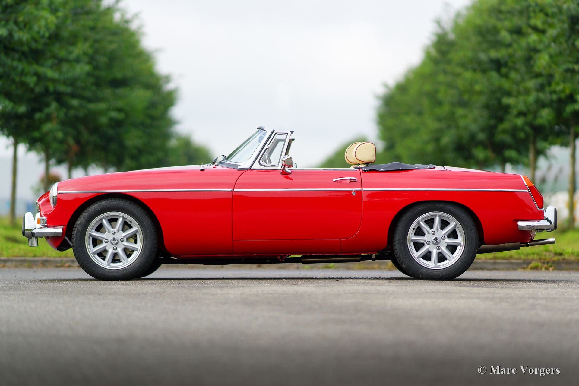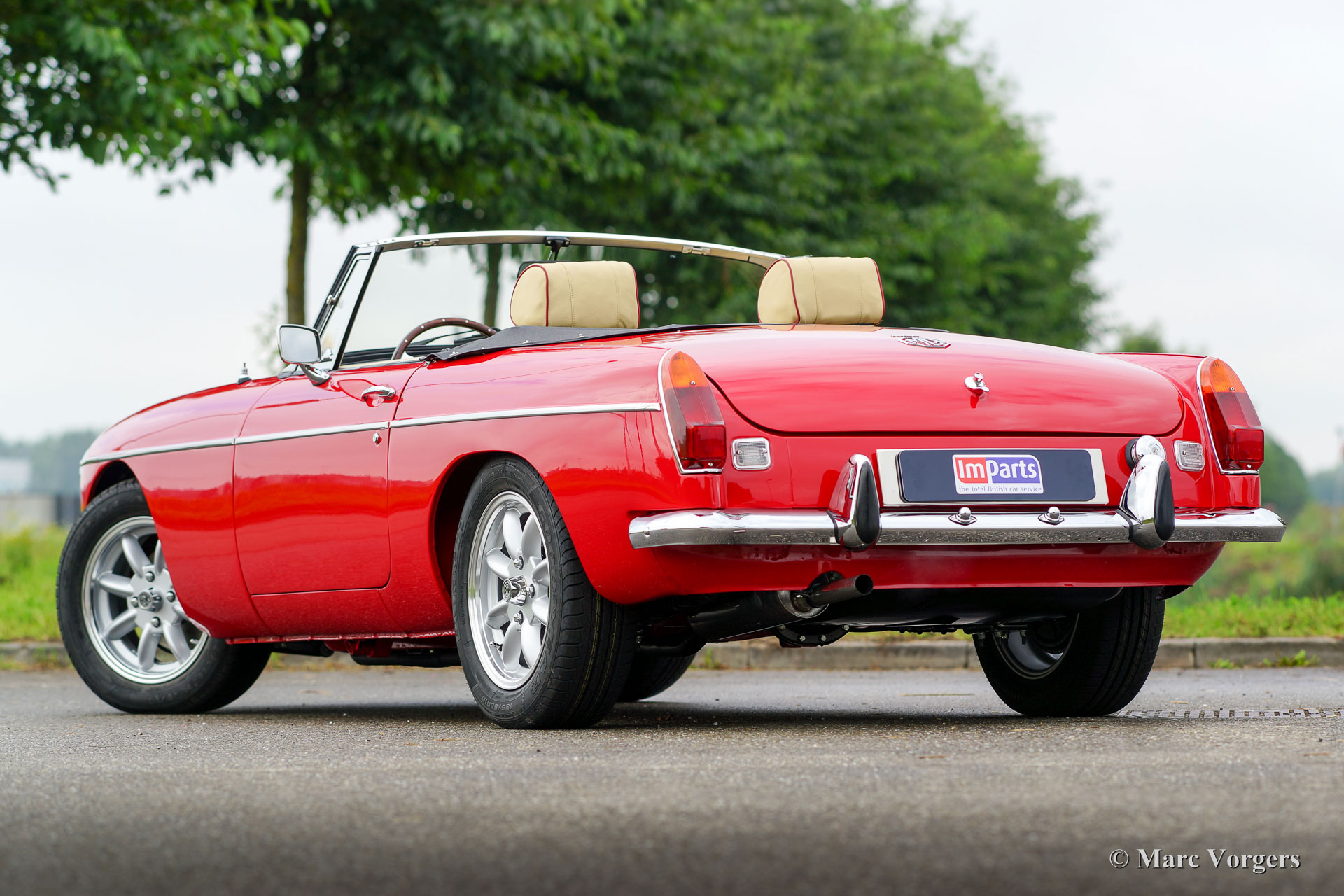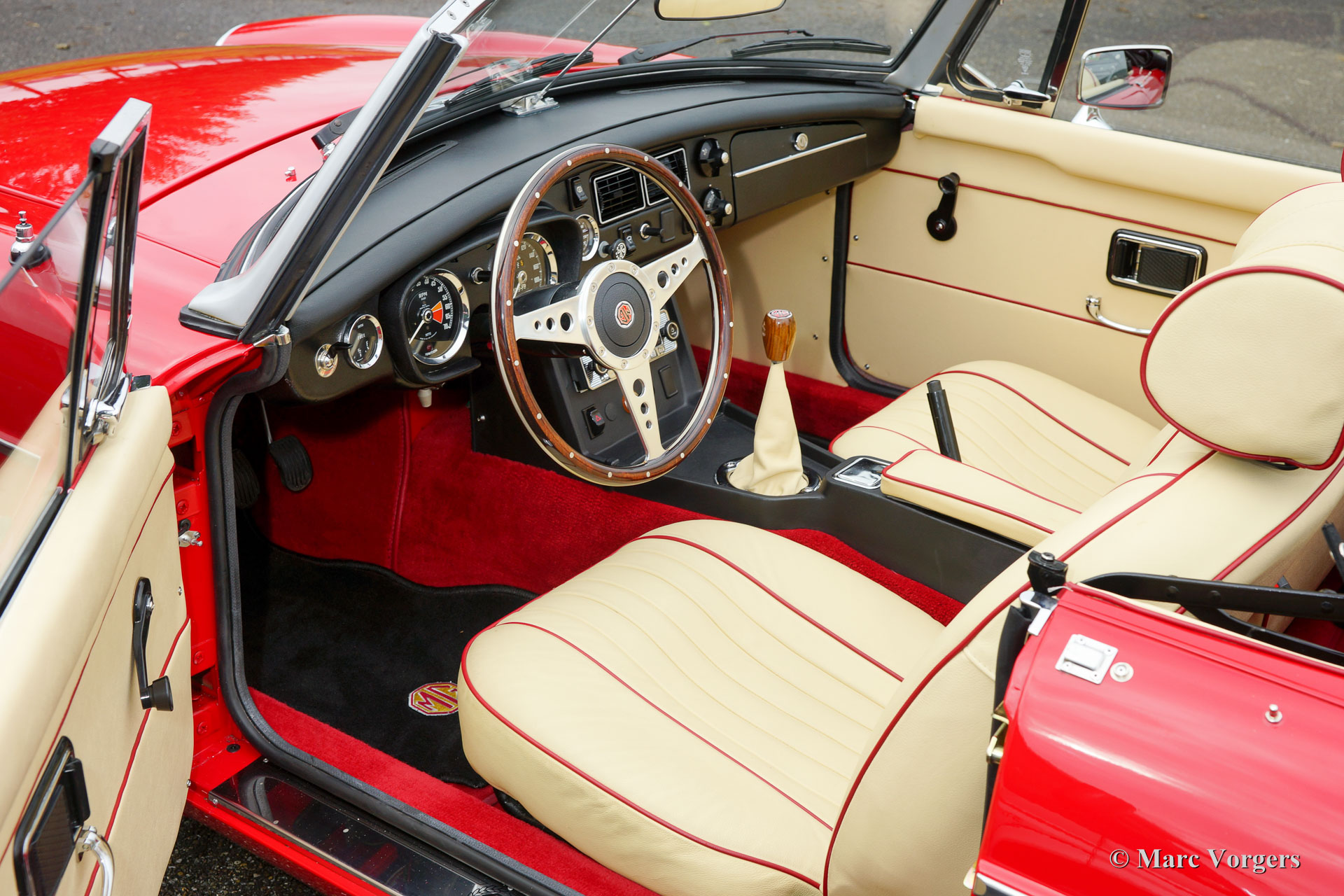 MG MGB roadster, année 1974. Couleur 'flamme rouge' avec un intérieur en cuir beige orné de passepoil rouge foncé. Capot mohair noir. Ce MGB 1974 était immatriculé aux Pays-Bas dans l'année 1975. Récemment, la voiture était flambant construit neuf! Une toute nouvelle carrosserie ’British Motor Heritage’ a été utilisé et tout a été renouvelé et / ou révisé. La voiture est à l'état neuf TOP et de la MG a entraîné seulement 2000 km depuis le boulon las a été resserré. Un vaste reportage photo de la construction est présent. Ce MGB roadster est livré complet avec overdrive, jantes en alliage de style Minilite, servo-freins, sellerie cuir, volant avec la jante en bois et d'une radio 'classic style' avec lecteur CD. Ce roadster MGB conduit parfaitement et mieux que de nouvelles!