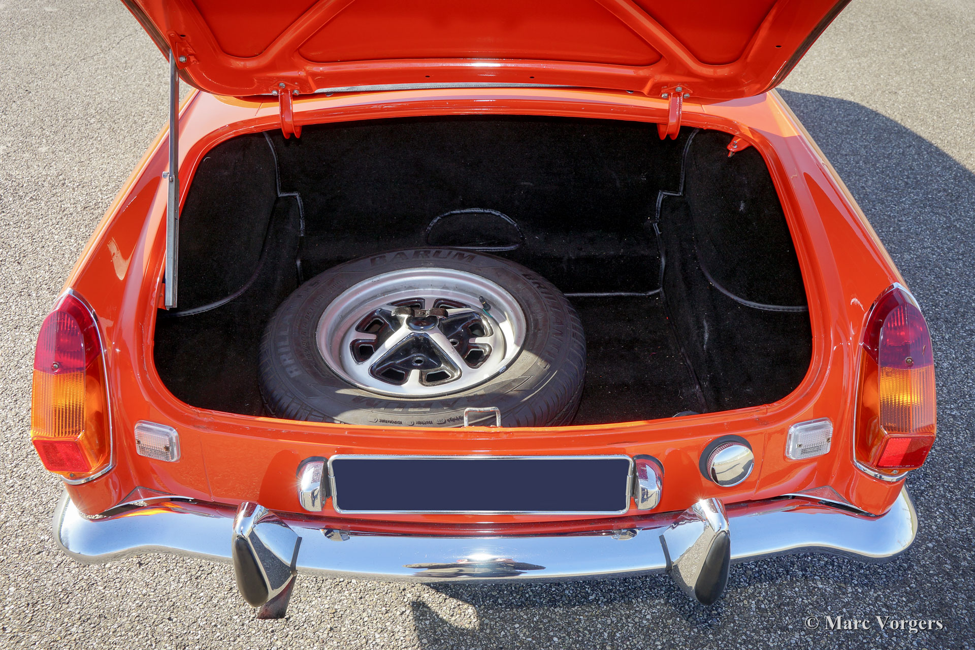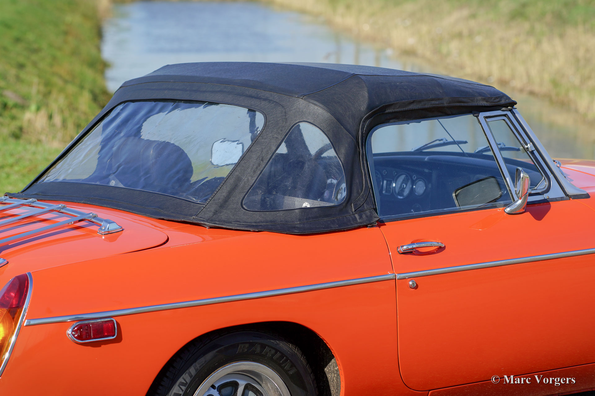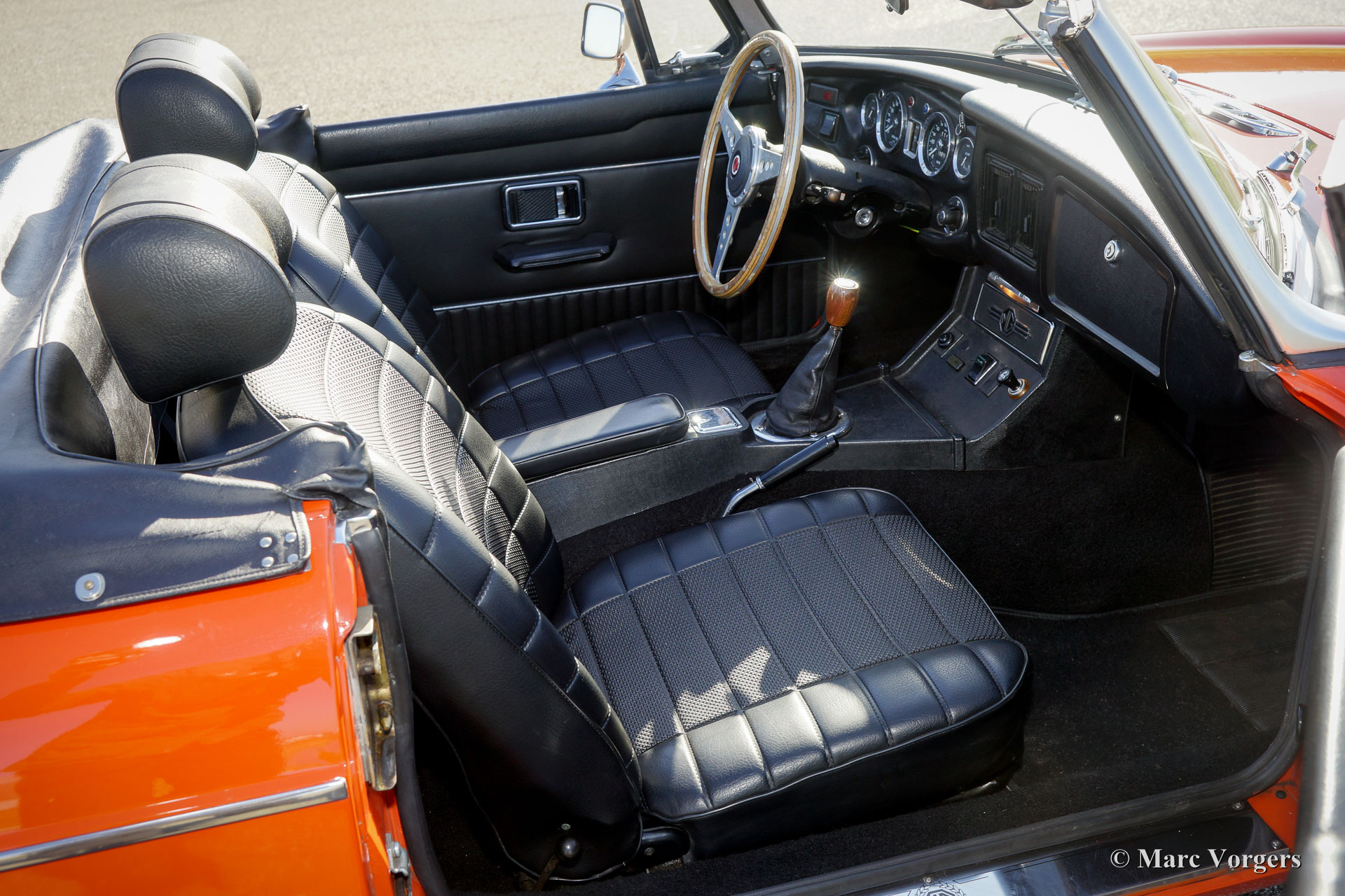 MG roadster MG, année 1974. Couleur orange avec un intérieur en similicuir noir, tapis noir et une capote noire. Ce magnifique roadster MGB est en très bon à excellente état et la voiture roule parfaitement. La couleur et les roues originales Rostyle respirent la magnifique atmosphère des années 1970. Le moteur à quatre cylindres de 1800 cc est une unité sportive et il est équipé d'allumage électronique et d'un refroidisseur d'huile. En outre, la voiture est équipée d'un porte-bagages chromé et d'un volant avec jante en bois. Ce superbe roadster MGB est prêt pour un long été !