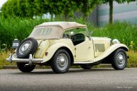The MG TD was the successor of the MG TC, the British sports car that stole the hearts of the American soldiers returning to their country. Like the MG TC, America was the most important market for the TD. Chassis and body of the TD were largely similar to the TC. But the TD had a rack and pinion steering-gear, coil springs (instead of the leaf springs) and an independent wheel suspension in the front. The wings were different in form, as the large 19-inch wire wheels in the TD gave way to 15-inch wheels. A Mk II version was introduced in 1950, and was built simultaneously with the Mk I. The Mk II had a more powerful engine and a "power bulge" on the engine valve on the right. The MG TD was in production until 1953 and was replaced by the MG TF.