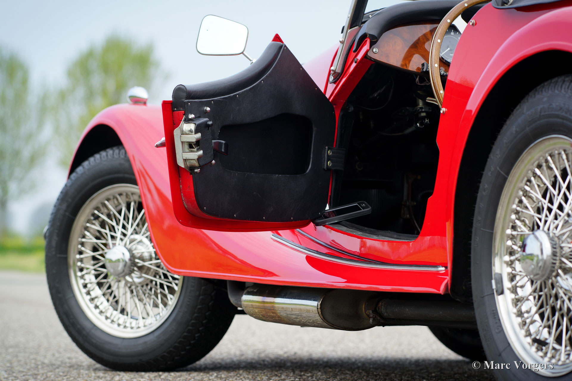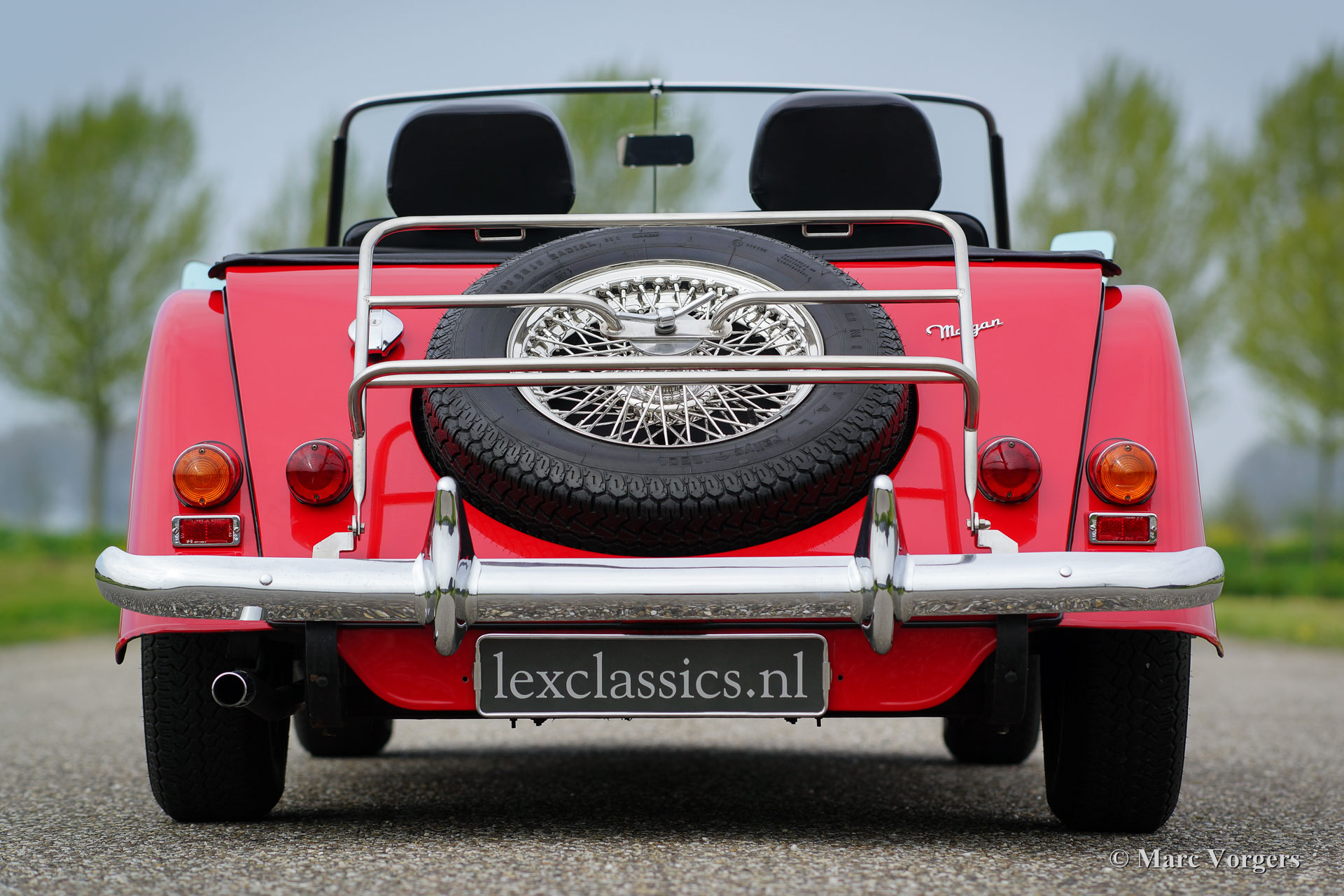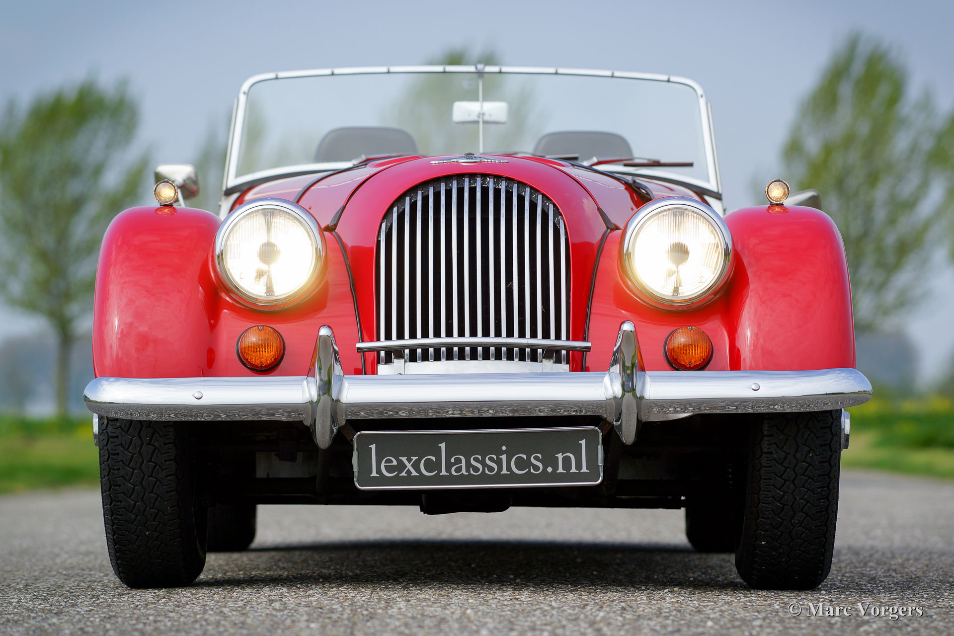 Morgan 4/4 1600, année 1988. Couleur rouge avec un intérieur en cuir noir. Ce merveilleux Morgan fut vendu neuf aux Pays-Bas. Cette Morgan est dans un état d'origine superbe et la voiture a conduit seulement 34.764 km de nouveau. L'automobile comprend des roues a fil de chrome, des rétroviseurs à deux portes, un tableau de bord en noyer, un capot noir, un couvercle de tonneau et une sangle en cuir à travers le capot. C'est un spécimen TOP !
