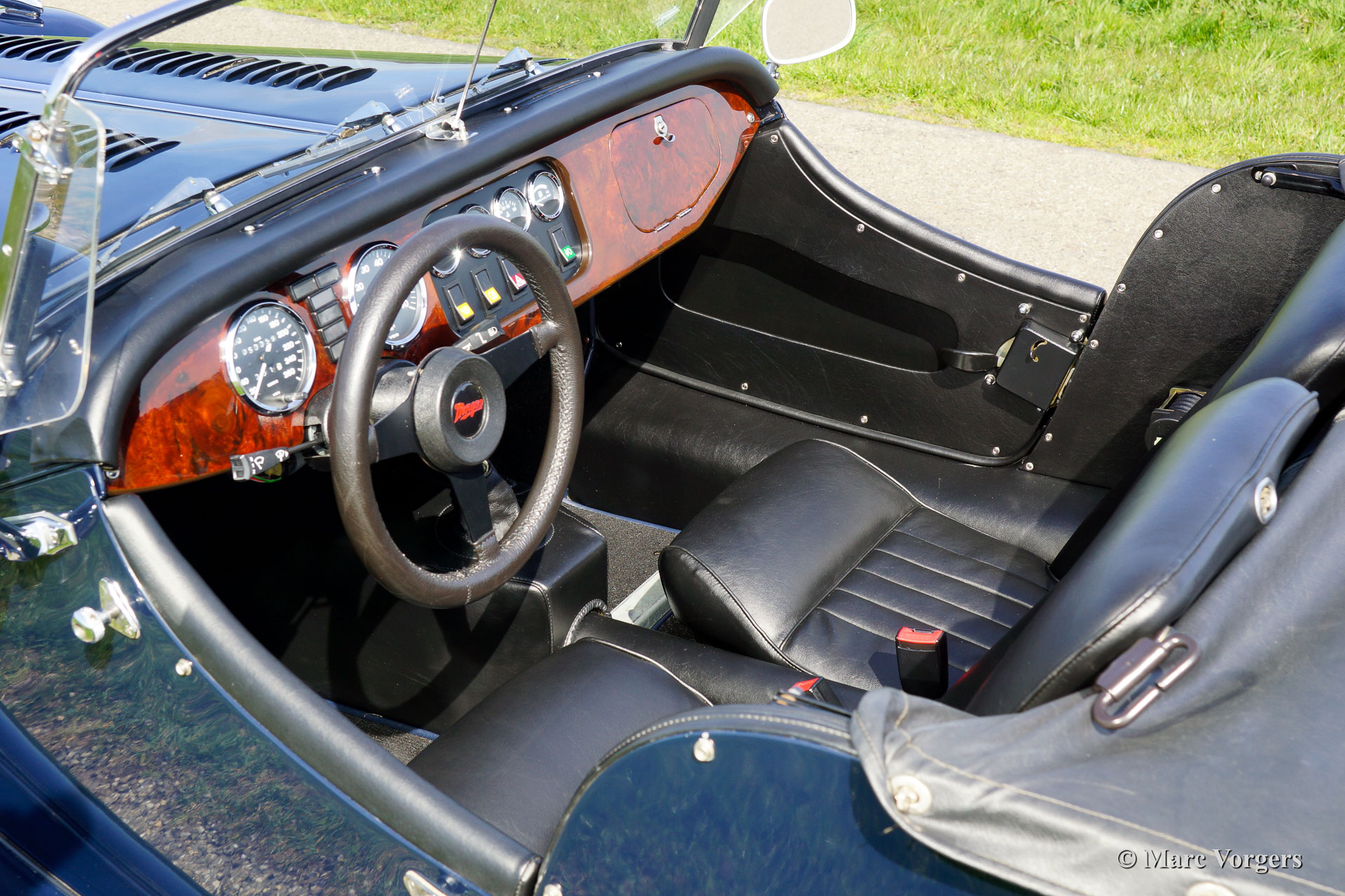 Morgan 4/4 1800, année 1996. Couleur bleu foncé. Intérieur en cuir noir avec tapis noir. Capote noir, couvre tonneau noir et écrans latéraux en aluminium. Ce Morgan 4/4 a été vendue neuve dans le Pays-Bas et la voiture vient de la deuxième propriétaire. De nouveau la voiture a conduit 50,050 km. L'automobile est en excellent état d'origine. Cette Morgan est équipé d'une boîte 5 vitesses, roues à rayons chromées, pneus Vredestein Sprint Classic, un porte-bagages chromé, un tableau de bord en noyer, le stockage de parapluie et un système d'échappement en acier inoxydable. La voiture est livré avec le livret de service d'origine.