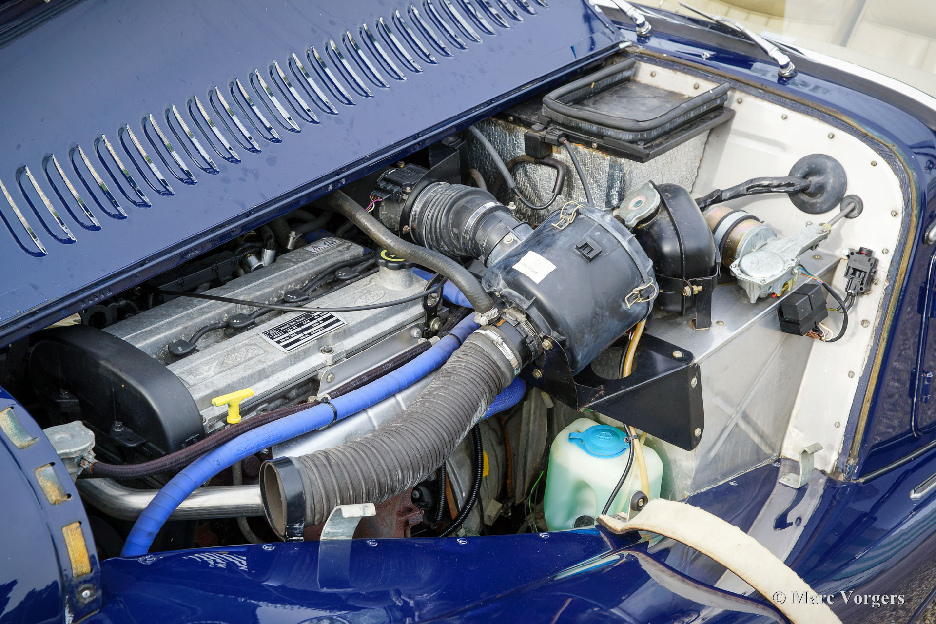 The Morgan 4/4 was built for 50 years. the first model, introduced in the year 1936 was the 4/4 with flat radiator which was built until the year 1951. After a four year break (only the Morgan plus 4 was built those years) the Morgan 4/4 was going to be rebuild. The car did not change a lot (conservative as they are at the Morgan company), only the shape of the radiator changed from flat to cowled. Morgan never built their own engine, the early flat radiator cars were powered by Standard or Ford engines. The cowled radiator models were powered by Ford engines. The Ford engine used was known as the "Kent" engine and was also used in Fords Cortina model. Morgan 4/4 1600 cars were powered by the 1599 cc. Ford Kent engine which had a standard capacity of 98 bhp. giving the light car (two seater 660 kg./ four seater 785 kg.) sporty performance. The cars were fitted with a four speed manual gearbox. The modern Morgan 4/4 models are powered by a Ford Zetec 16V engine. These cars feature petrol injection and a five speed manual gearbox. The Morgan 4/4 is a very special car to drive because it has it's own strong character. It cannot be compared with any other roadster or convertible.