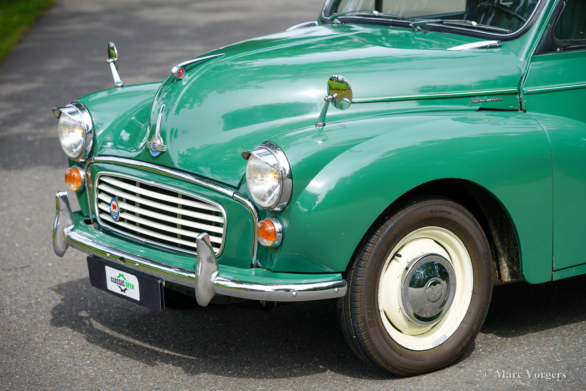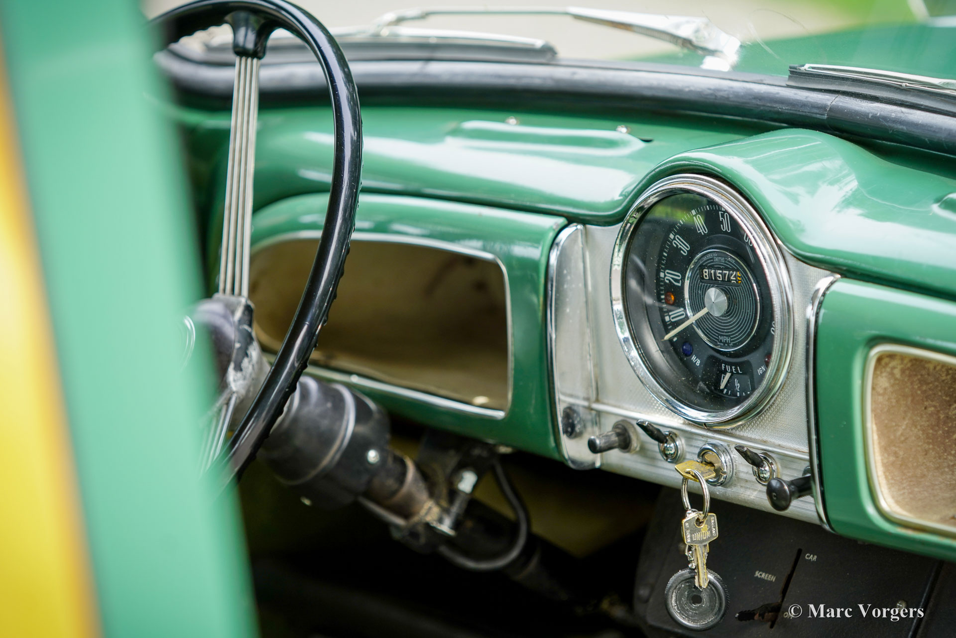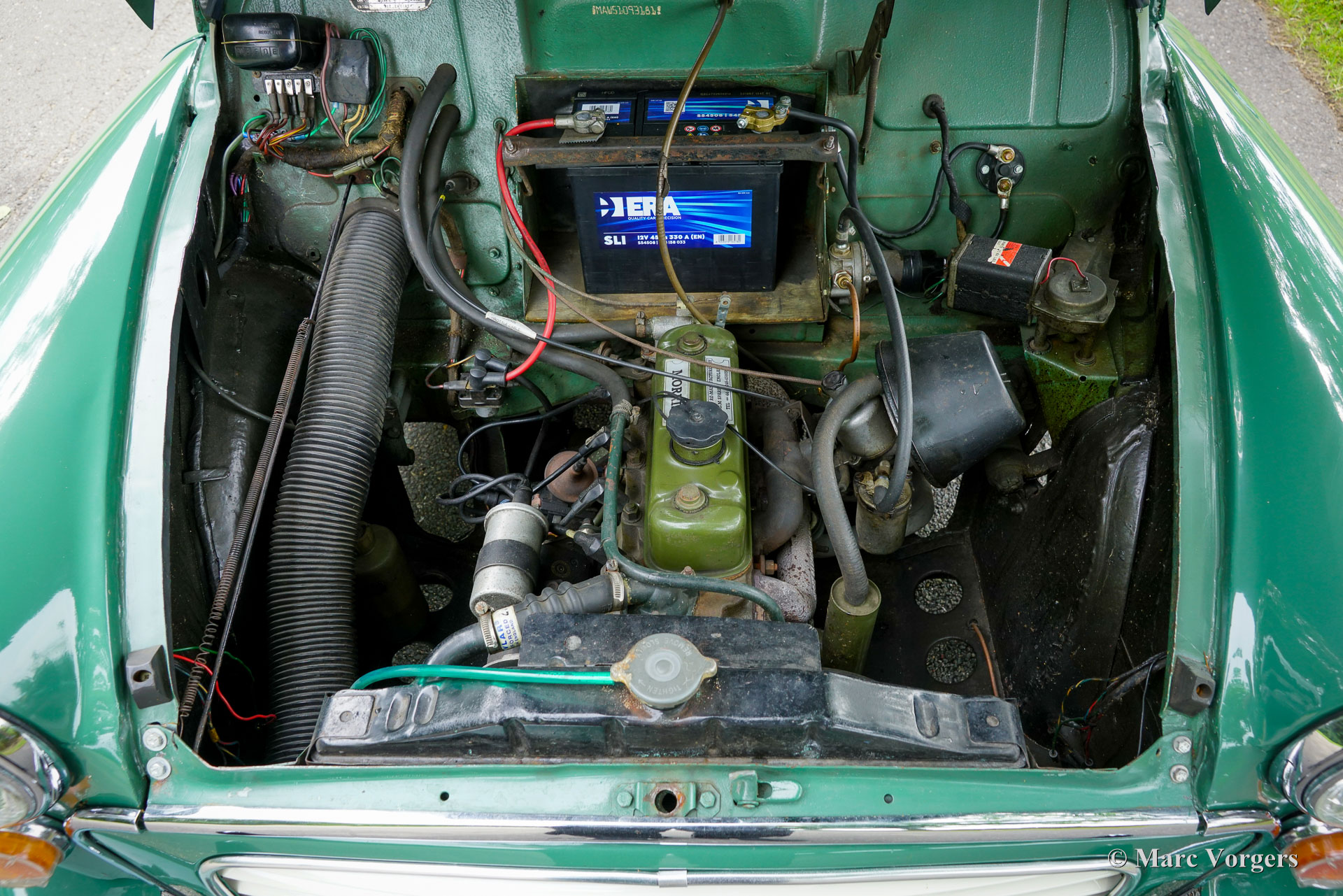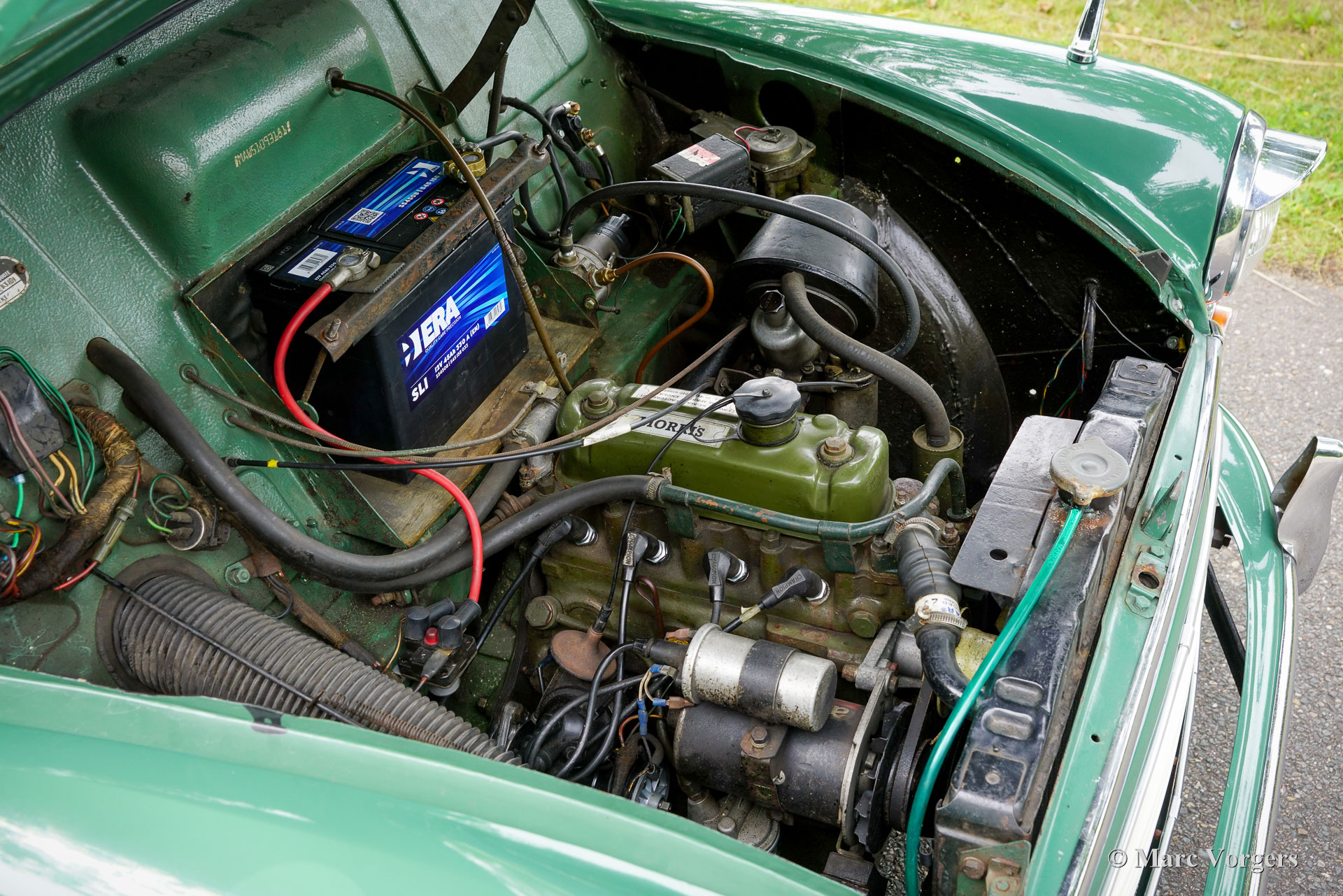 Morris Minor 1000 Traveller, année 1965. Présentée en vert amande avec un intérieur vert assorti, cette Morris Minor 1000 Traveller de 1965 a été importée d'Angleterre en 2001. La voiture fut soigneusement entretenue aux Pays-Bas depuis. Un historique complet accompagne la voiture, documentant les entretiens de routine et la conversion à la conduite à gauche. En 2007-2008, la carrosserie fut restaurée par un spécialiste Morris Minor en Angleterre. Pour plus de confort, des sièges modernes réglables d'une nuance de vert complémentaire furent installés, tandis que les sièges d'origine sont restés avec la voiture et sont en bon état. Au cours des 24 dernières années, la voiture a parcouru environ 10.000 miles (16 000 km). La dernière révision majeure a eu lieu en septembre 2024. Le moteur familier de 1 098 cm³, équipé d'un simple carburateur SU et d'un allumage électronique, fonctionne parfaitement avec la boîte à quatre rapports. Cette magnifique Morris Minor Traveller allie raffinements pratiques et caractère authentique d'époque et est proposée avec une documentation complète. Complétez votre style rétro avec cette ravissante Morris Minor Traveller, idéale pour les sorties du week-end, les pique-niques en famille et les rassemblements locaux de voitures anciennes.