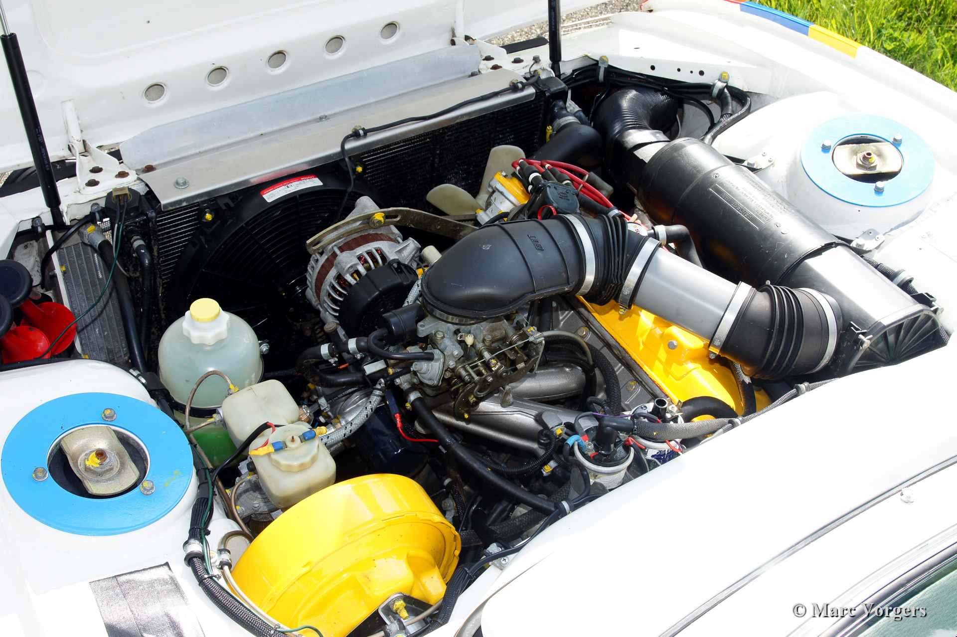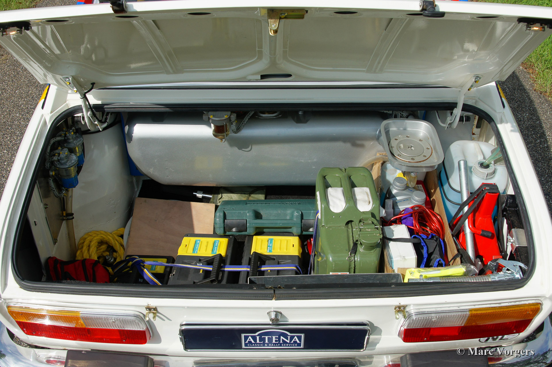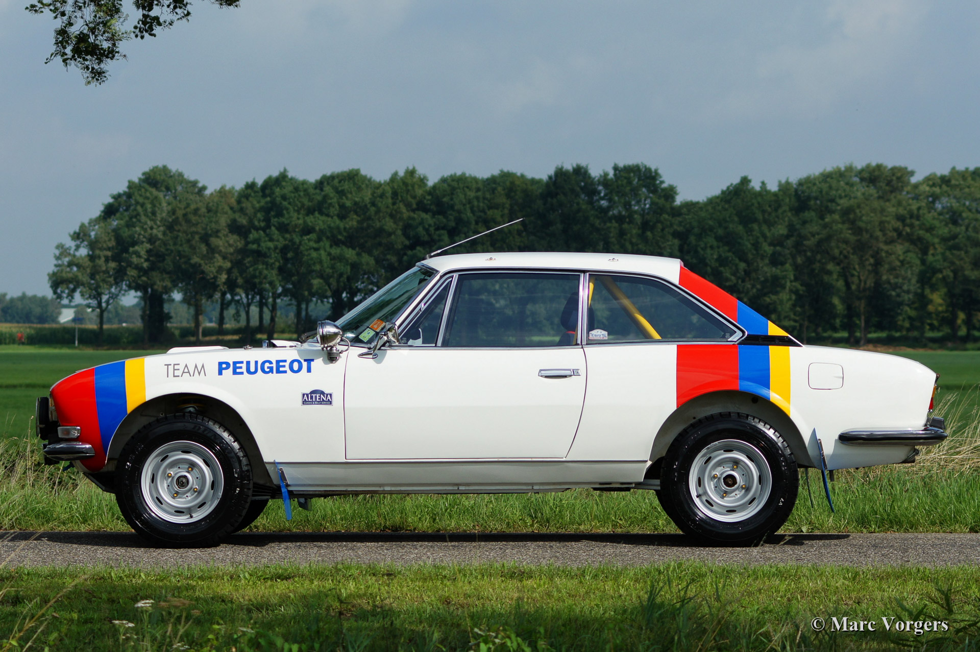 Peugeot 504 Coupe (C12) rally car, year 1976. Colour white trimmed with 'Team Peugeot' rally striping, black rally interior with blue rally seats. The car was inspired upon the successful Peugeot 504 'works' rally cars of the 1970'ies. Next to all rally gear the car features a built in electric cooling box and air conditioning in the rear.
