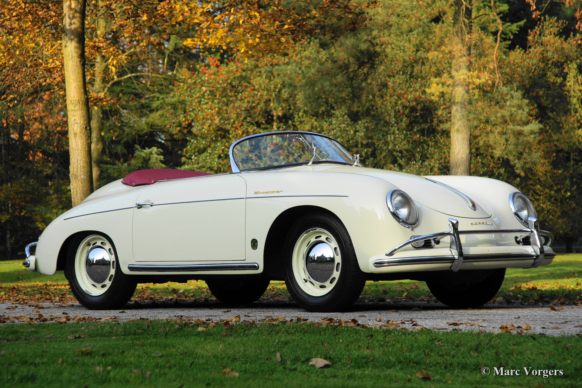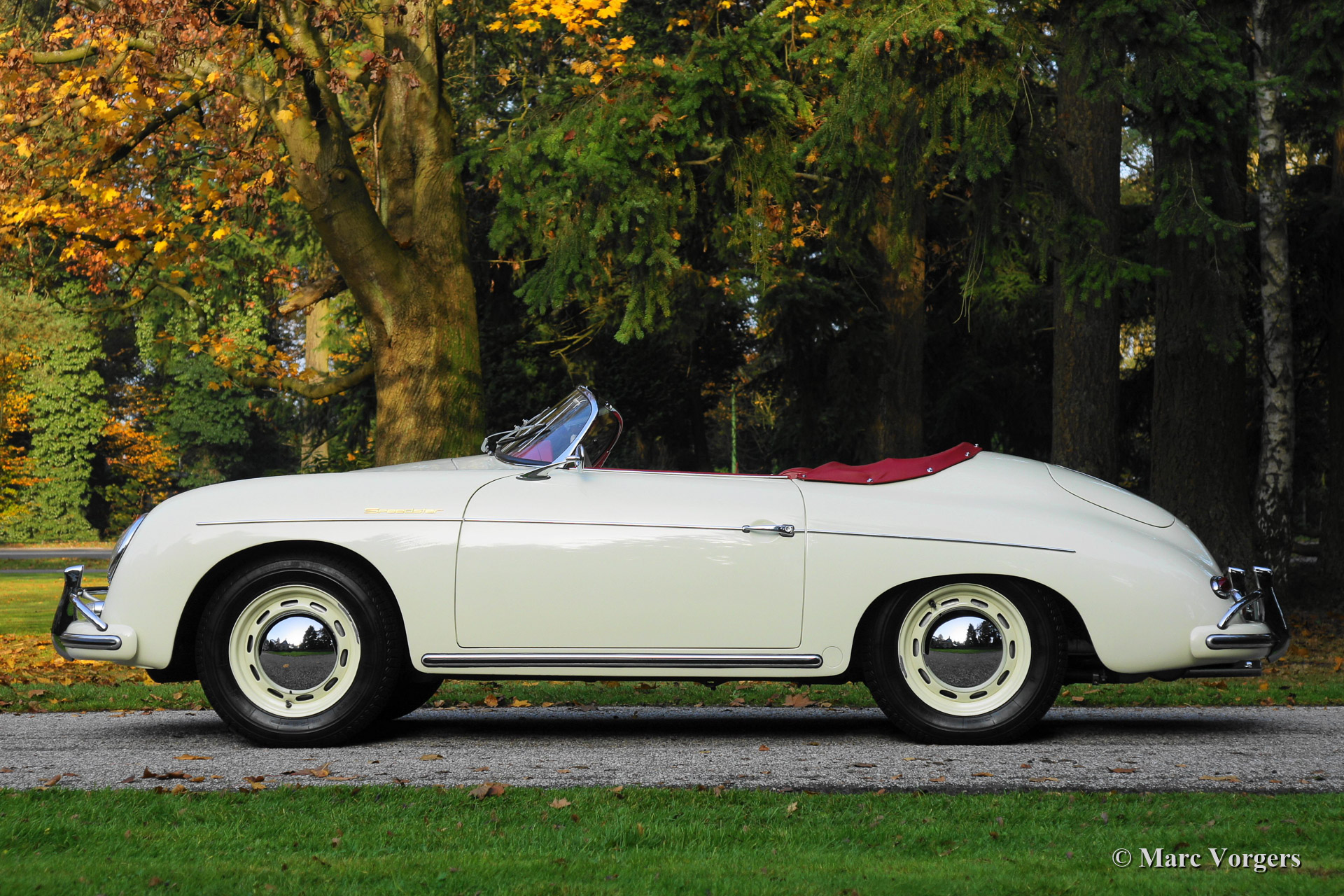 Porsche 356A Speedster 1600 T1, year 1957. Colour Ivory white with a red leather interior and a beige soft top. This fantastic Porsche Speedster was fully and perfectly restored. This Porsche Speedster features the optional 'comfort seats' which are also to be found in the Porsche 356 cabriolet.
