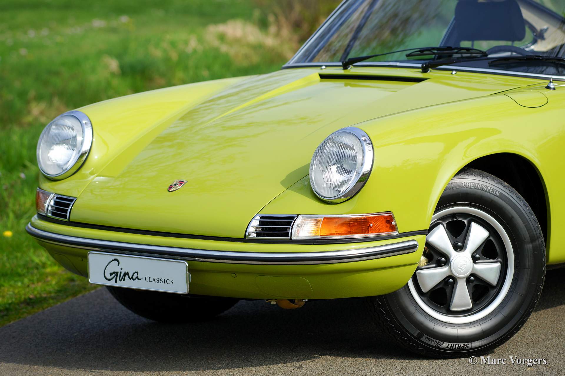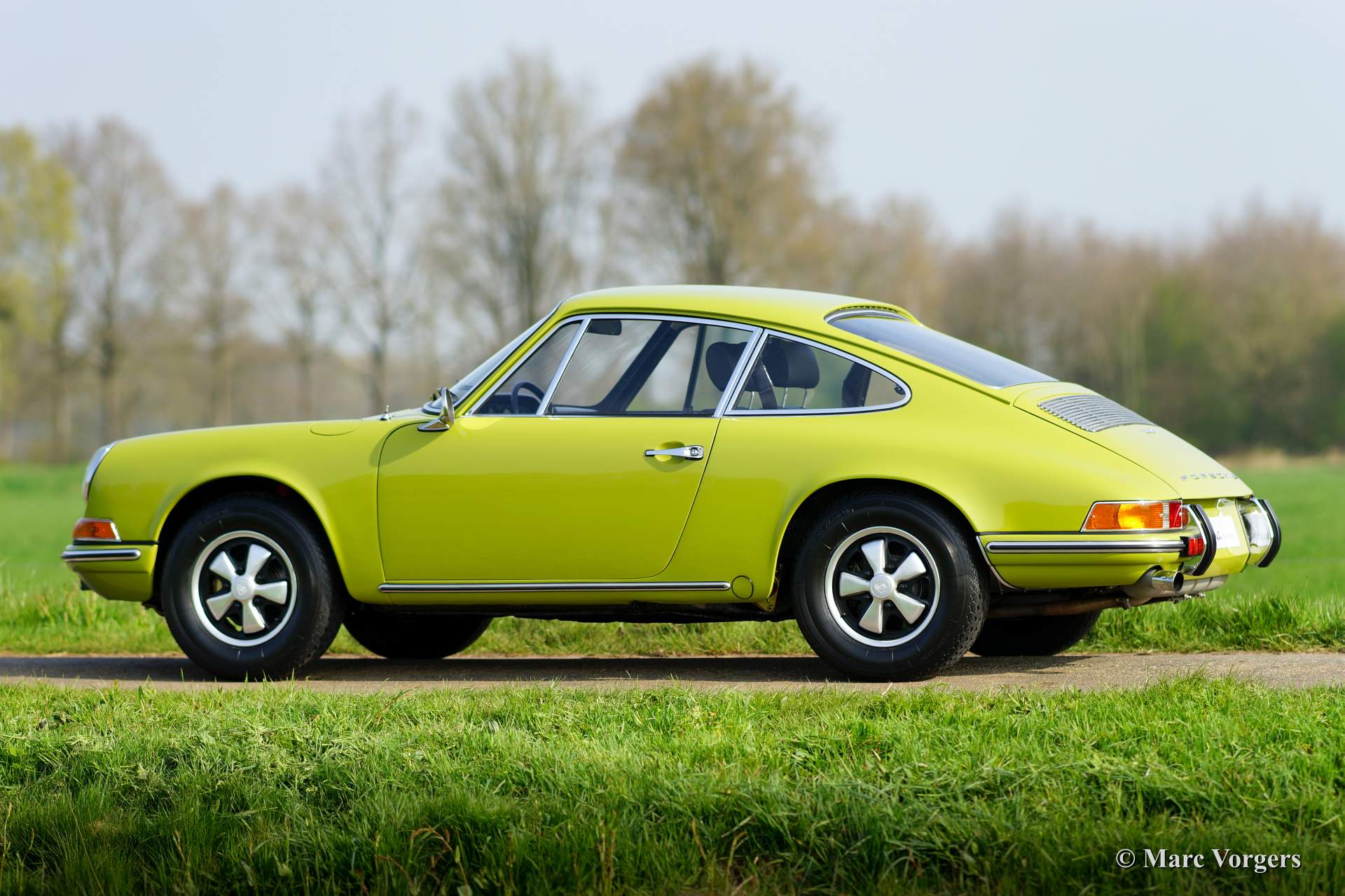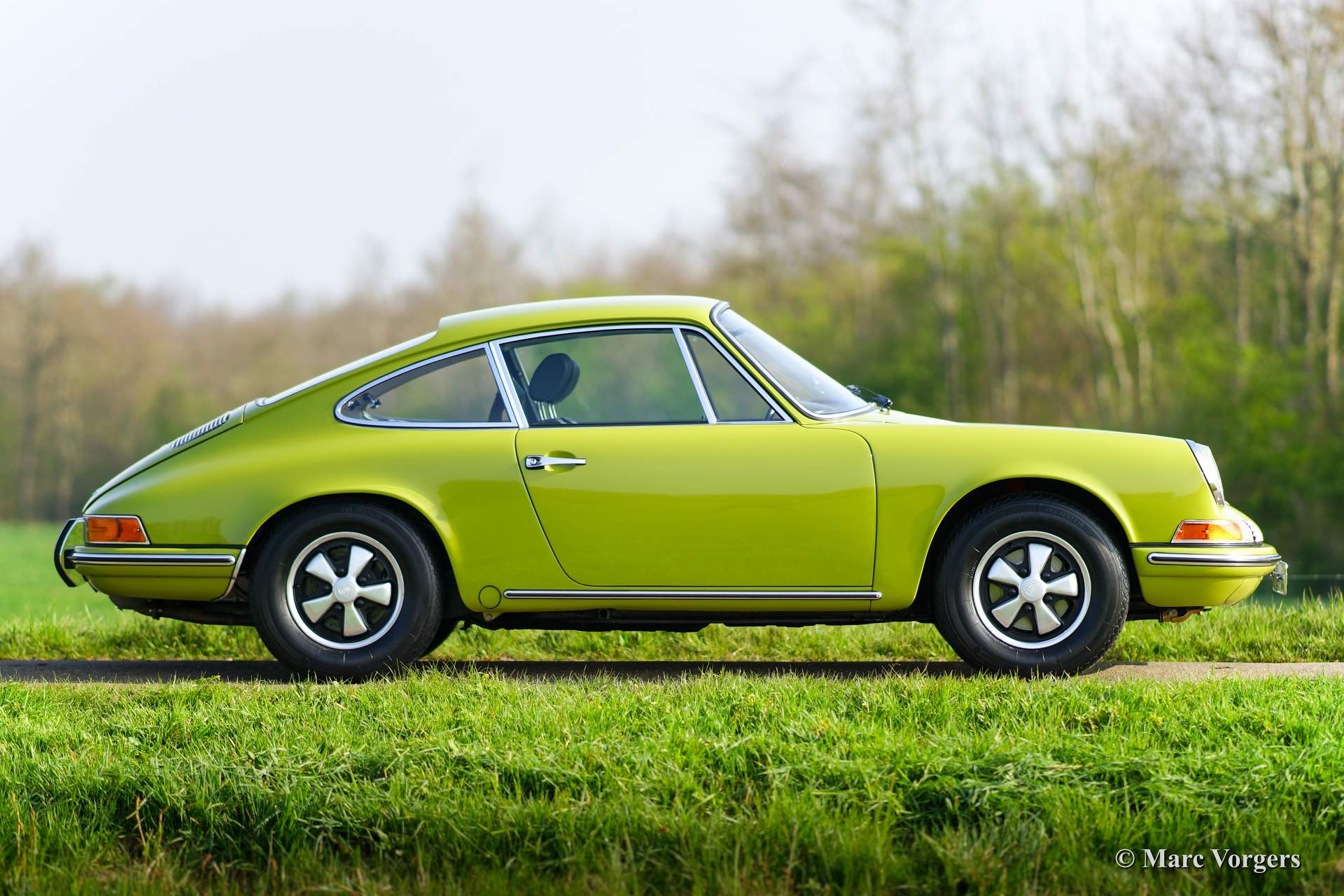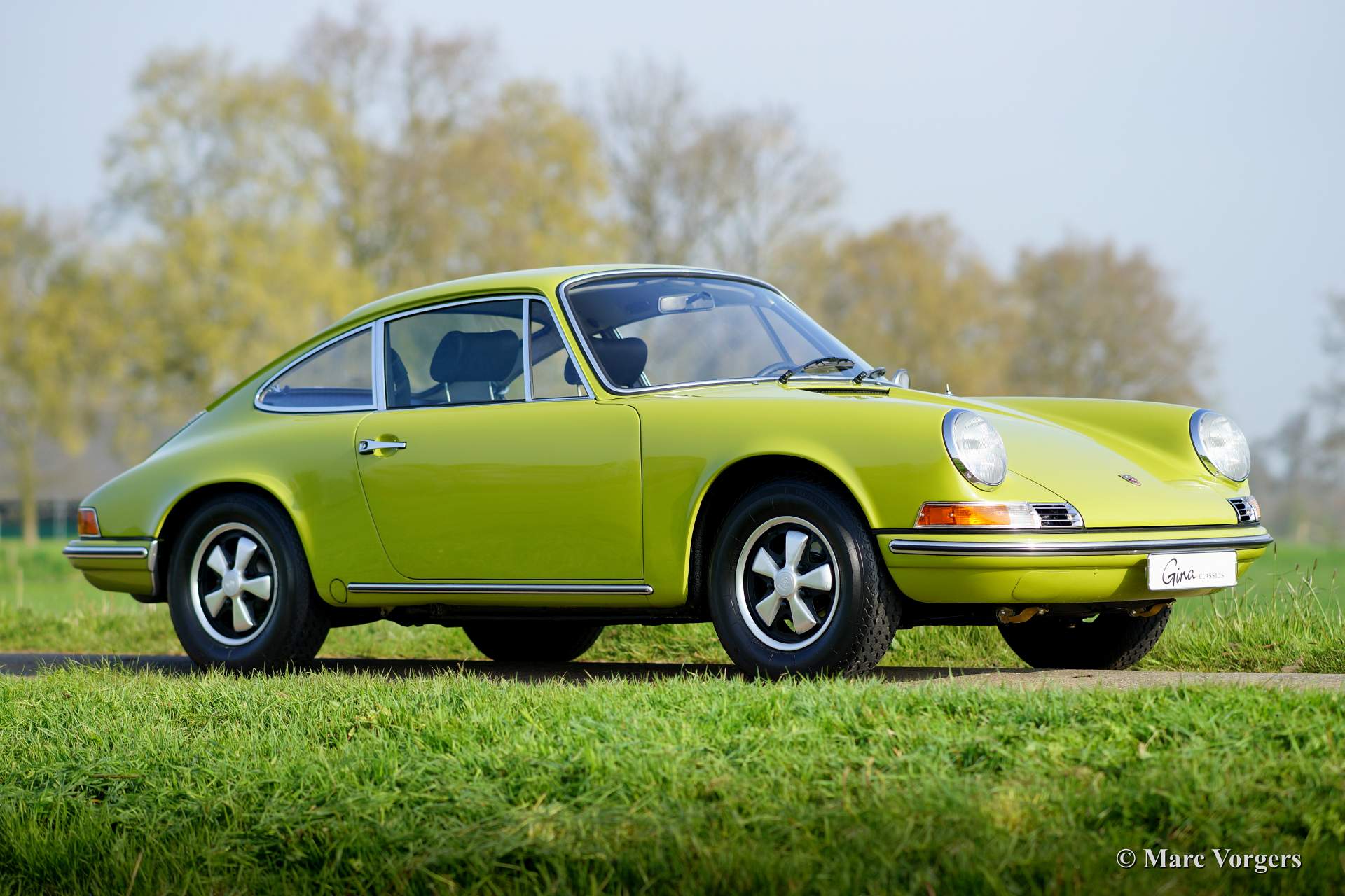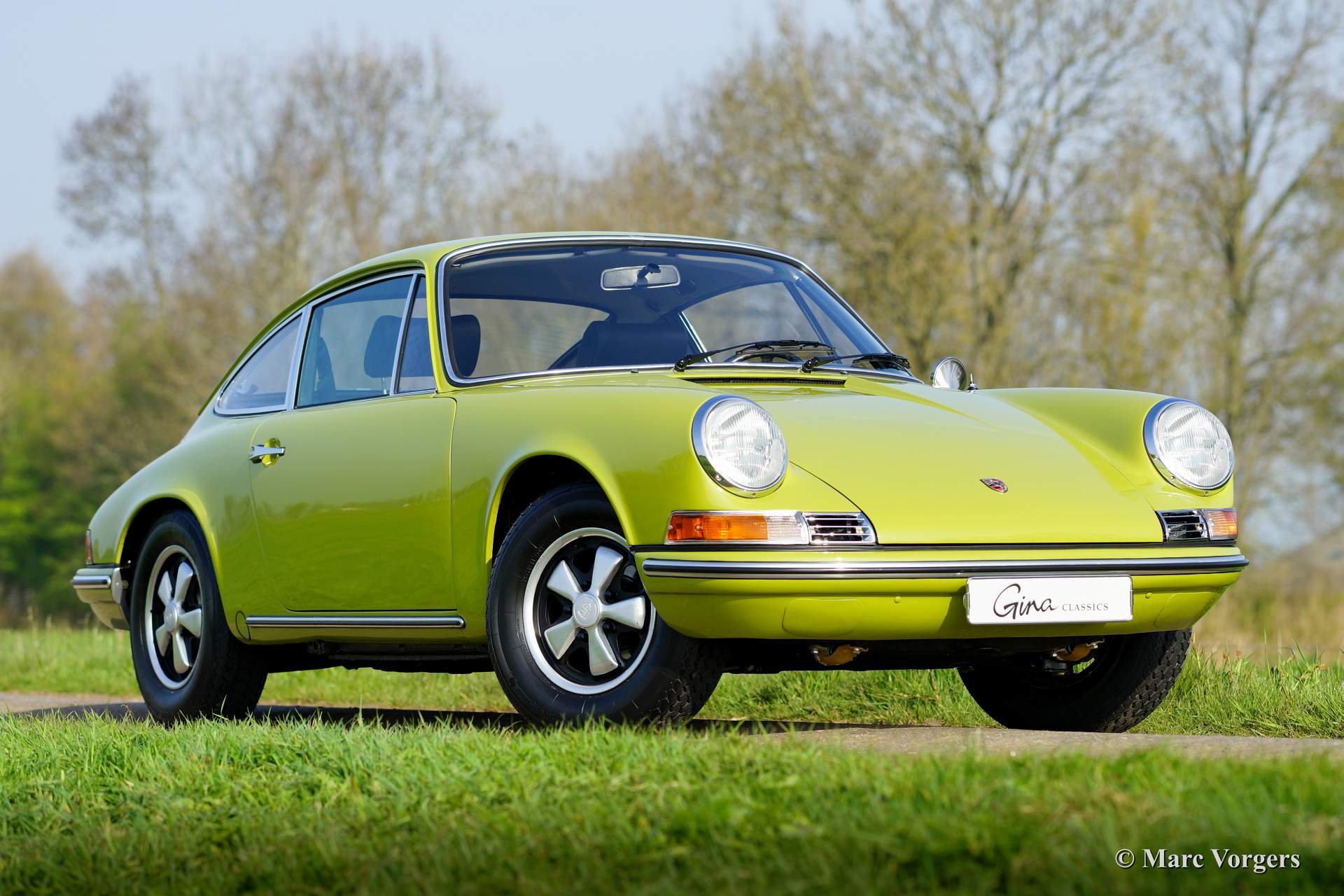 Porsche 911 2.0 T, année 1969. Couleur Golden Green (or vert) avec un intérieur en simili cuir noir.