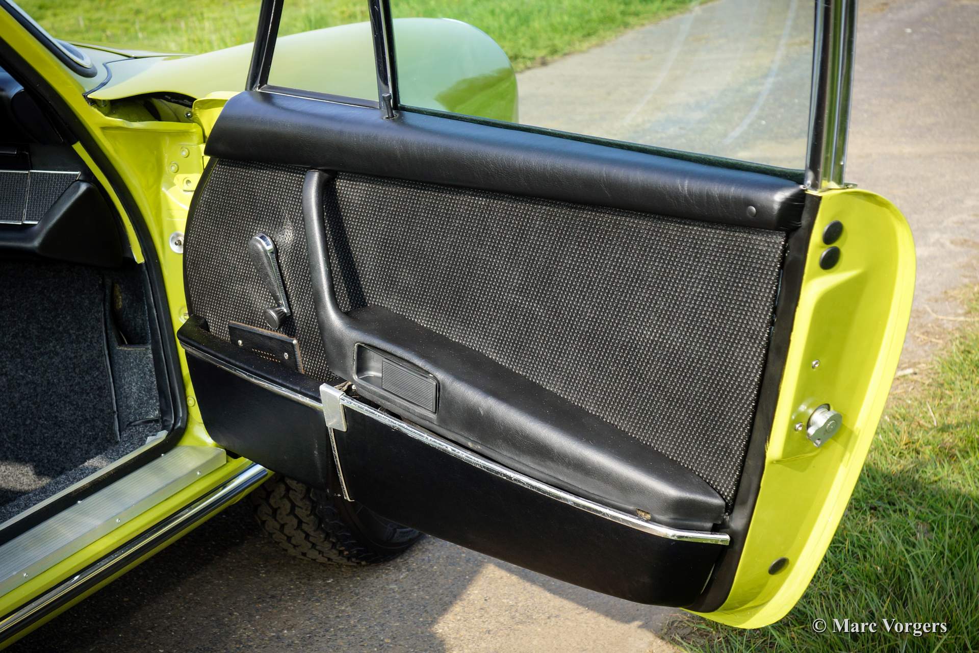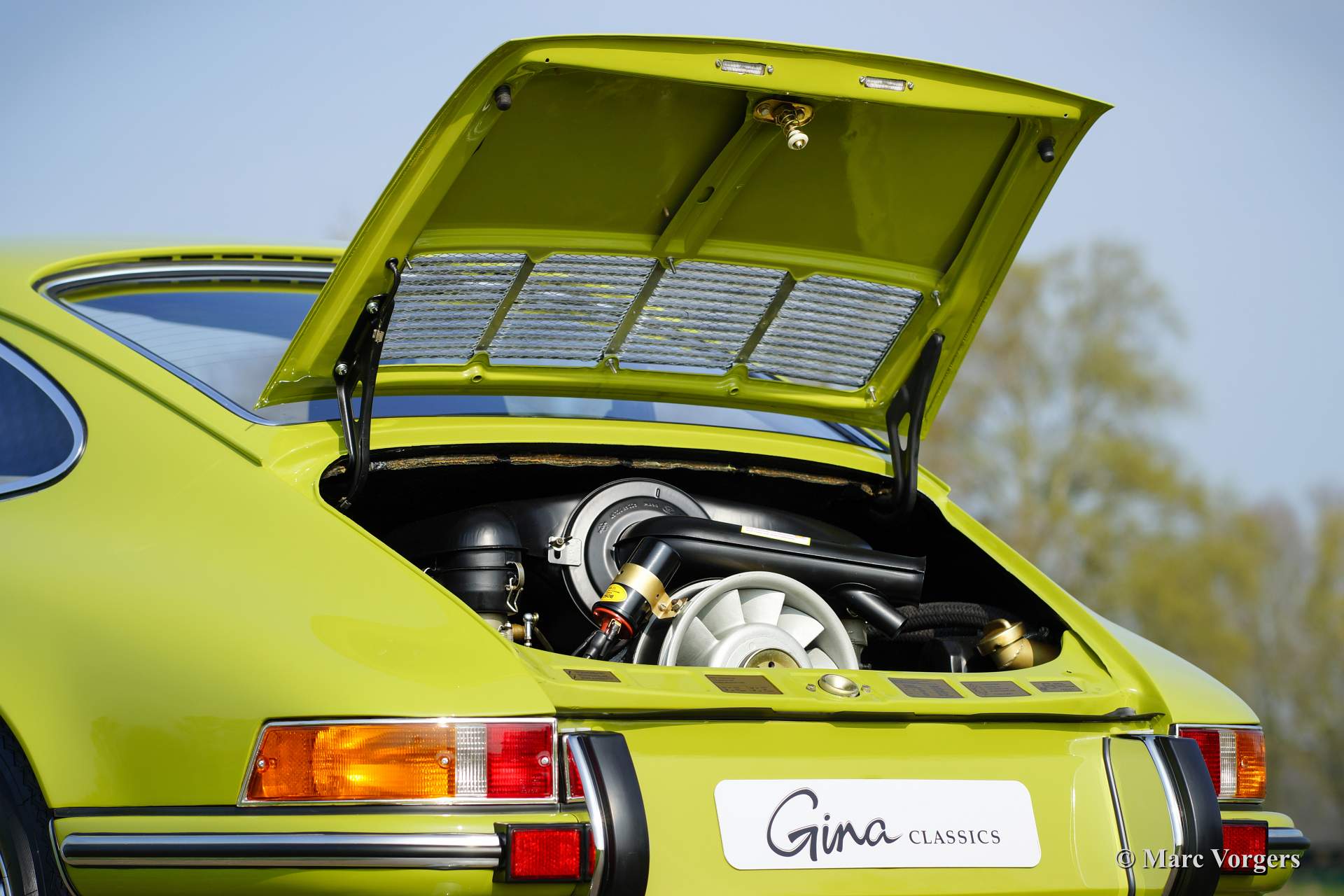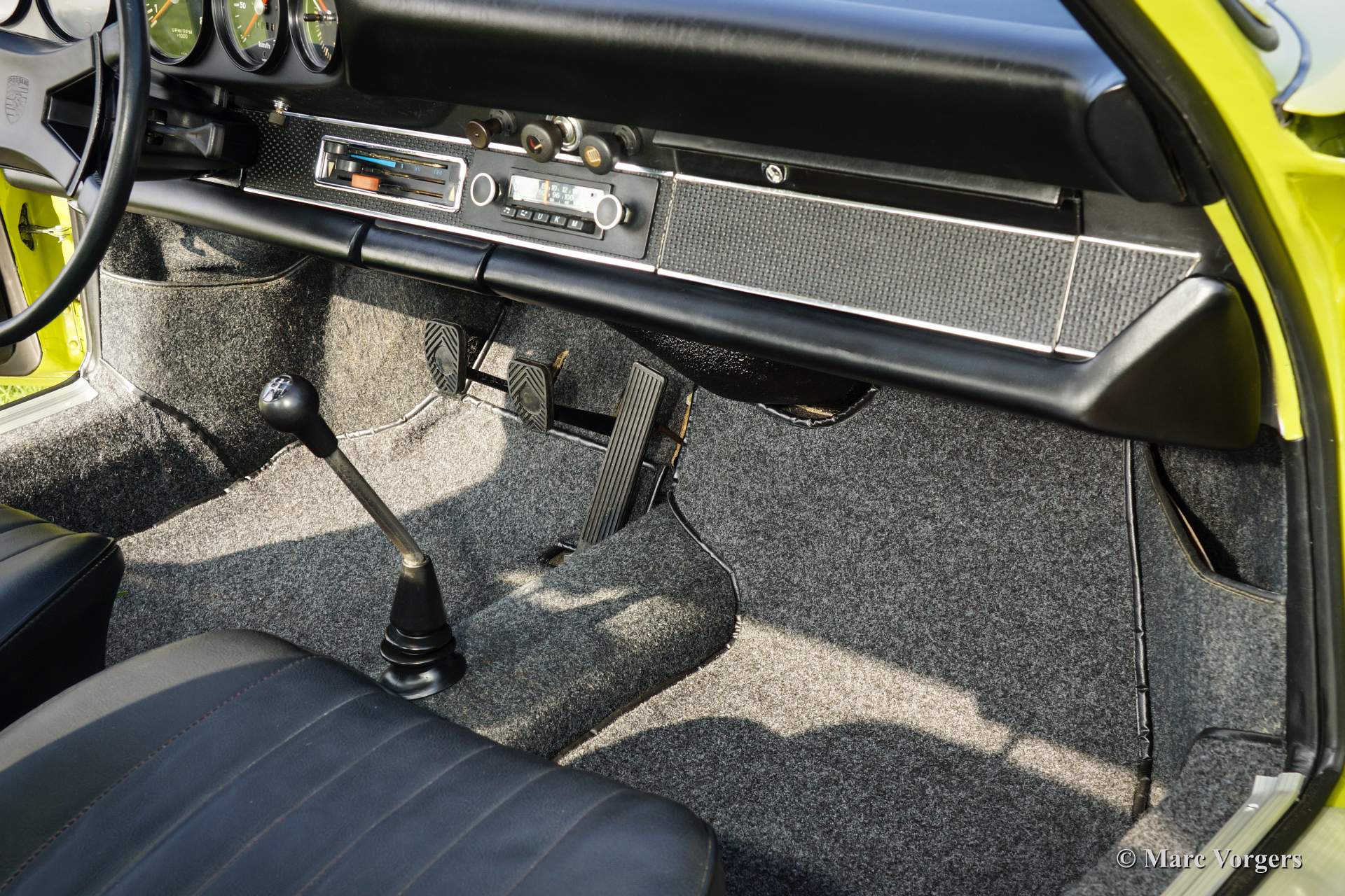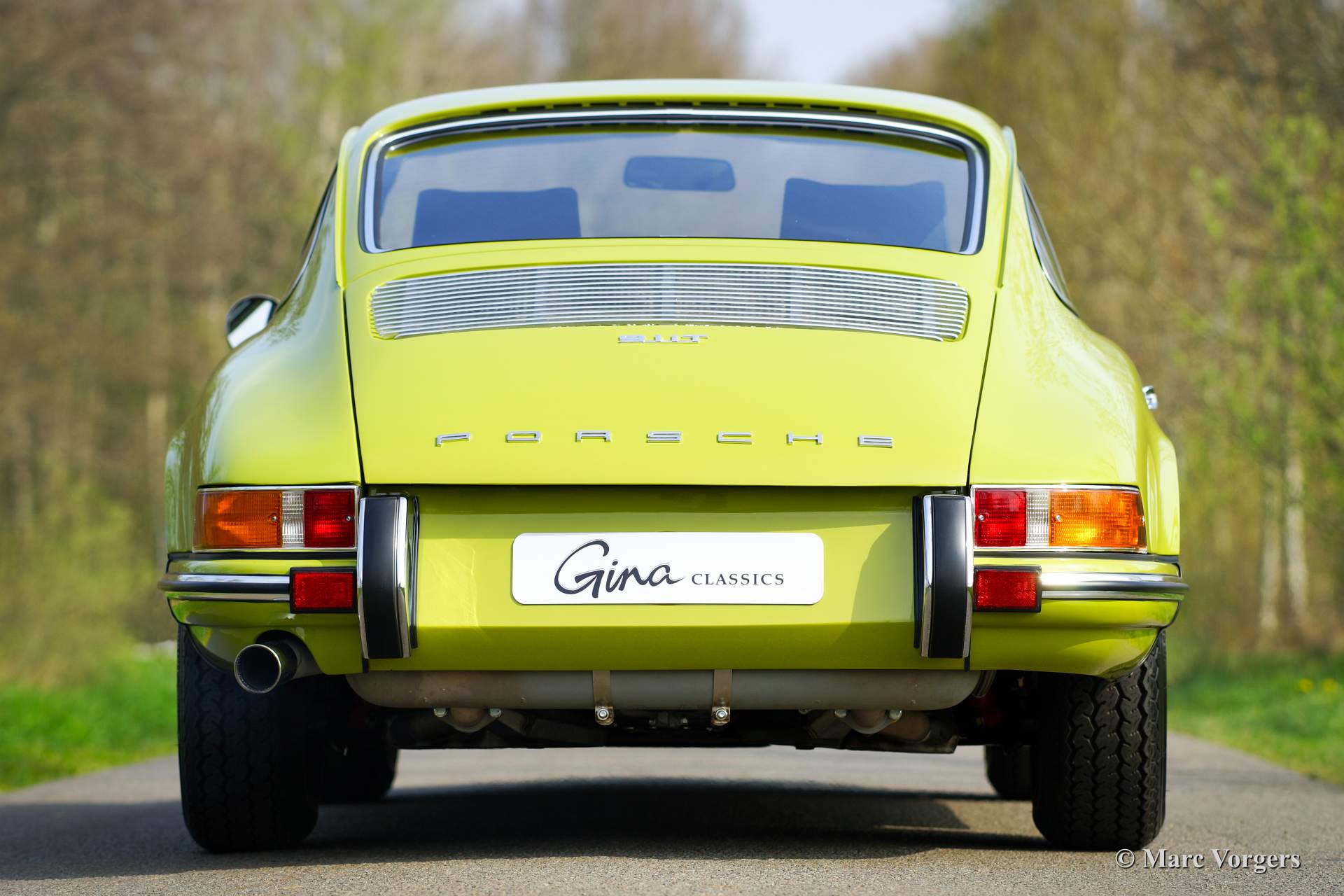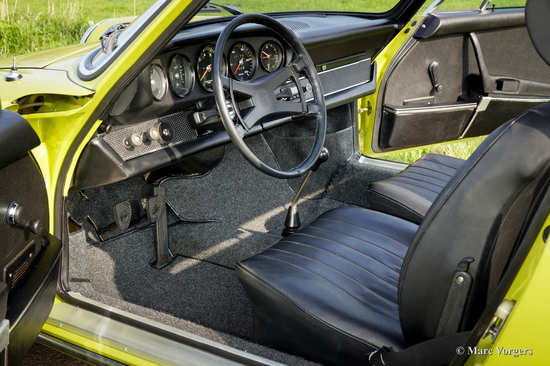 Porsche 911 2.0 T, année 1969. Couleur Golden Green (or vert) avec un intérieur en simili cuir noir.