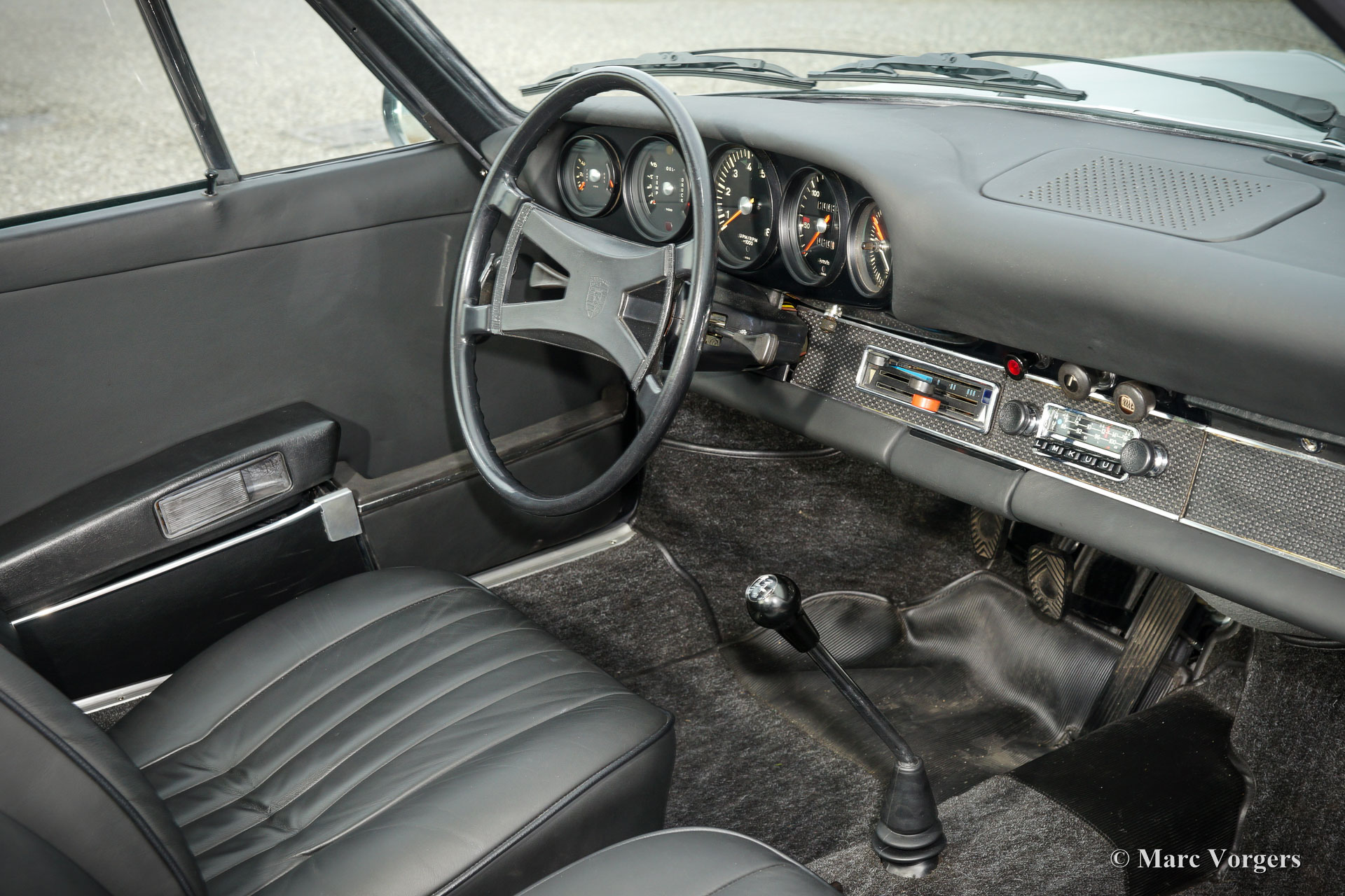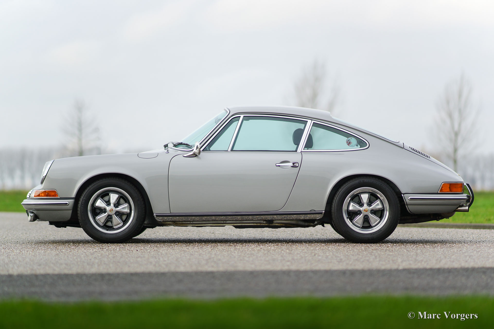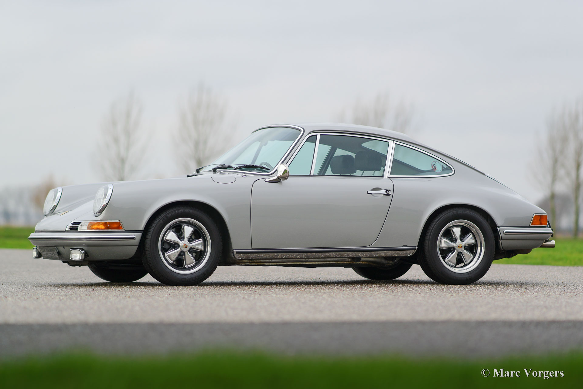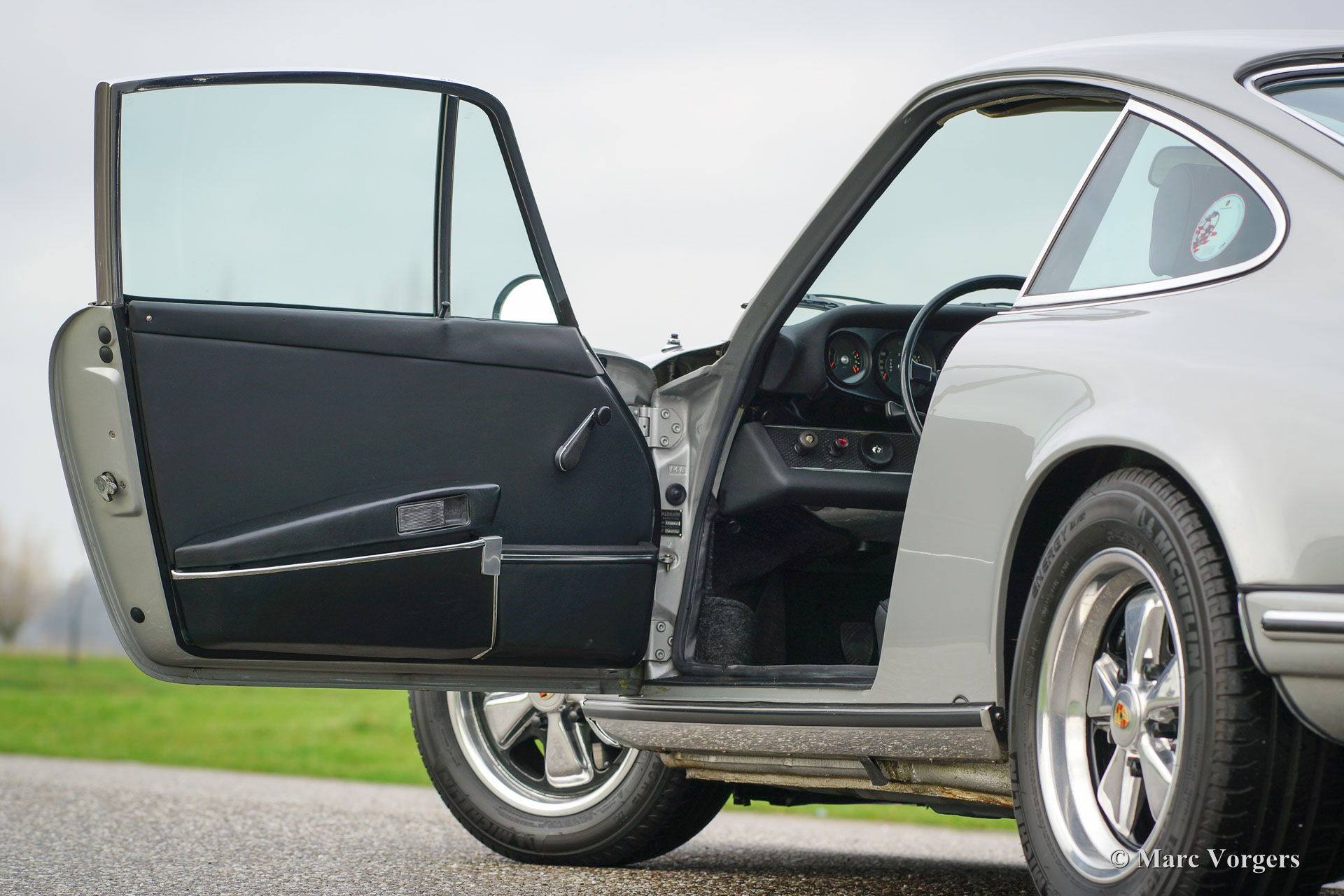 Porsche 911 2.2T, année 1969. Couleur argent métallique avec un intérieur en cuir noir. Cette magnifique Porsche 911 coupé a été restauré détaillé dans le passé. La voiture est en très bon à excellent état et la voiture roule fantastique ! Cette Porsche 911 dispose roues Fuchs, une boîte de vitesses à 5 rapports, appui-têtes sur les deux sièges et la radio + antenne.