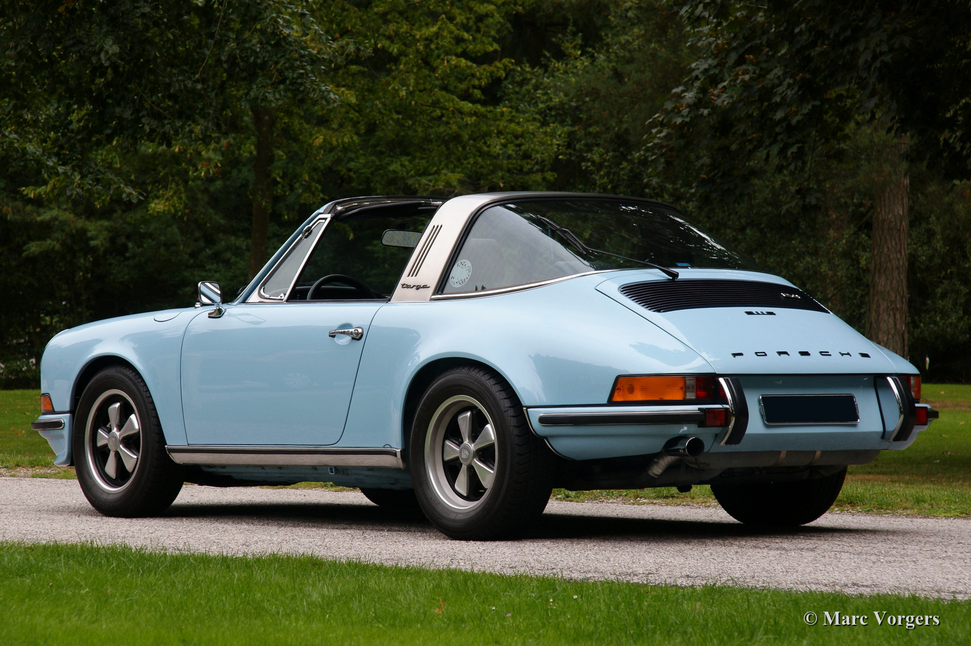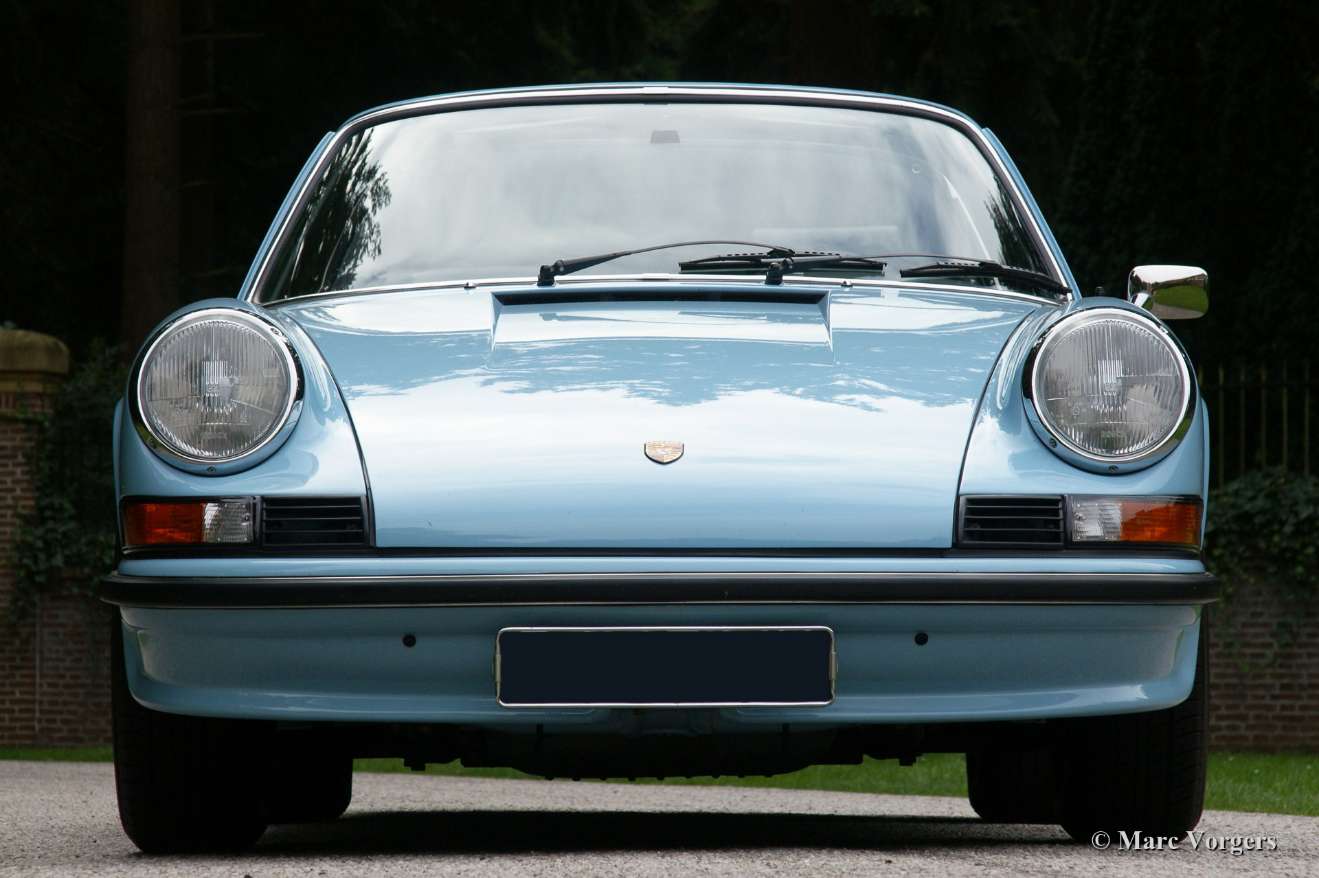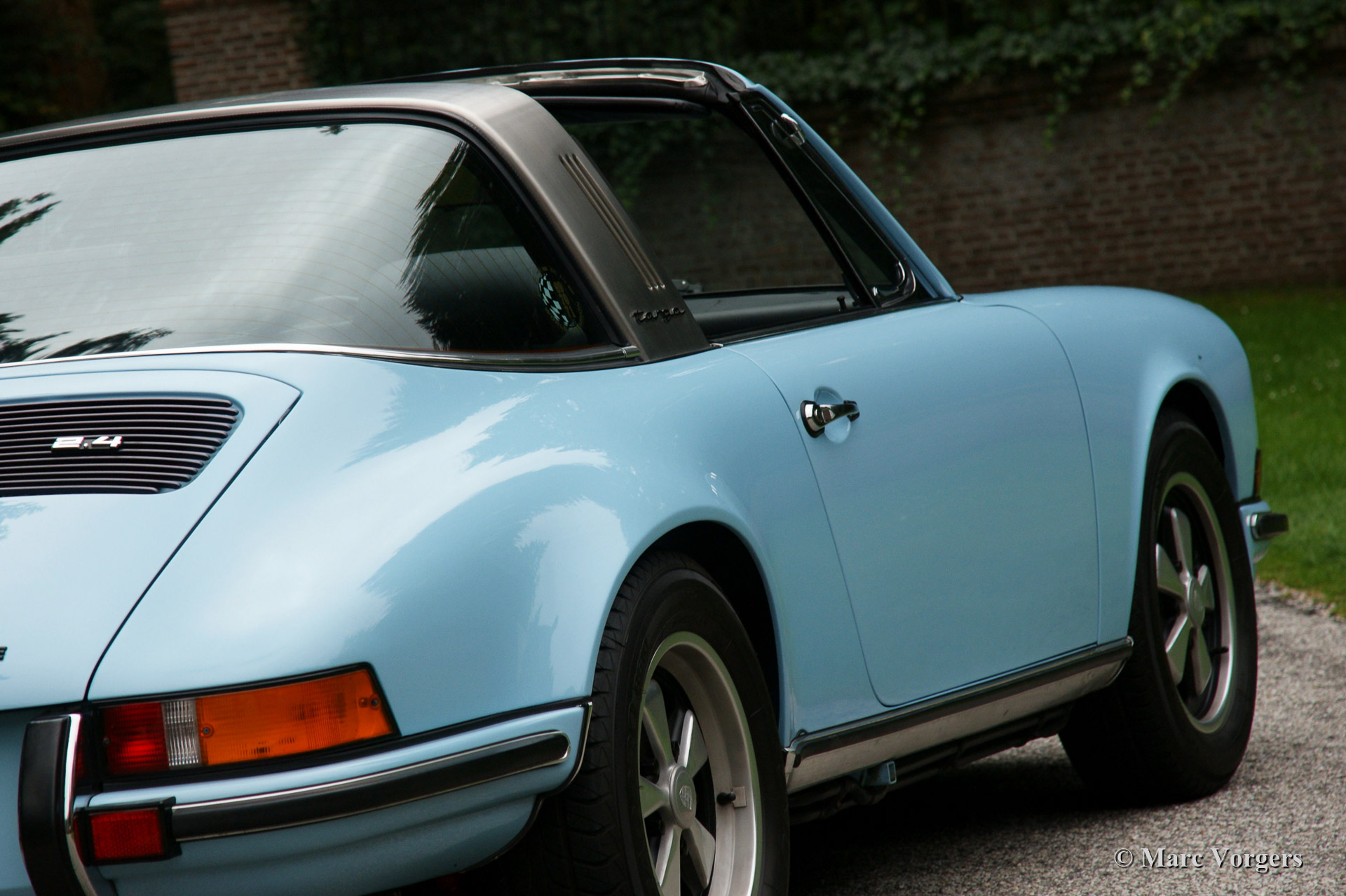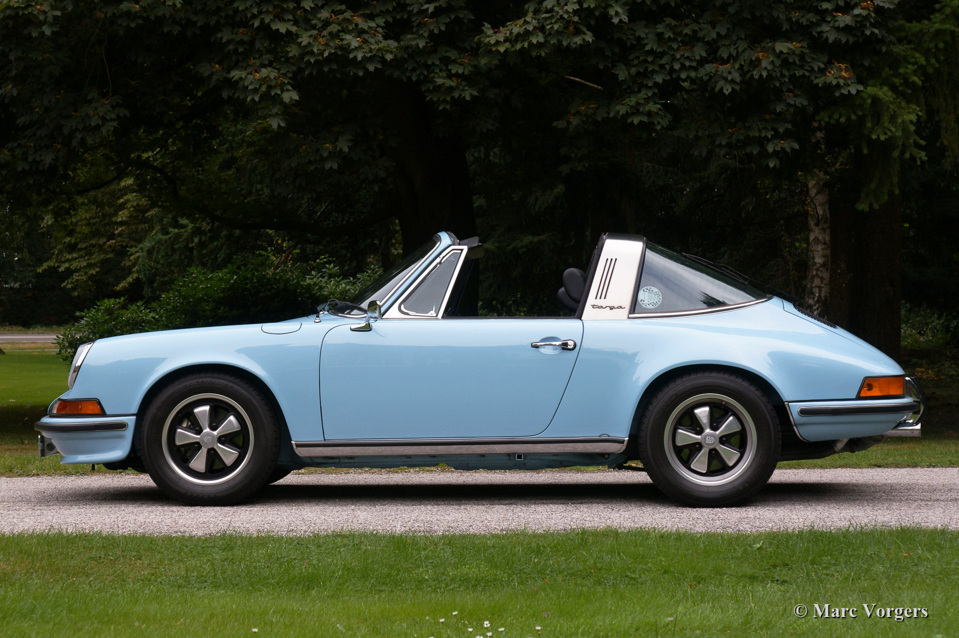 Porsche 911 2.4 S Targa, year 1973. Colour 'Gulf blue' (optional original colour, number 328) with a black leather interior. This is one of the three Porsche 911 2.4 S Targa models which were sold new in The Netherlands. A 911 2.4 S Targa from the 1973 F series is rare, only 925 cars have been built.