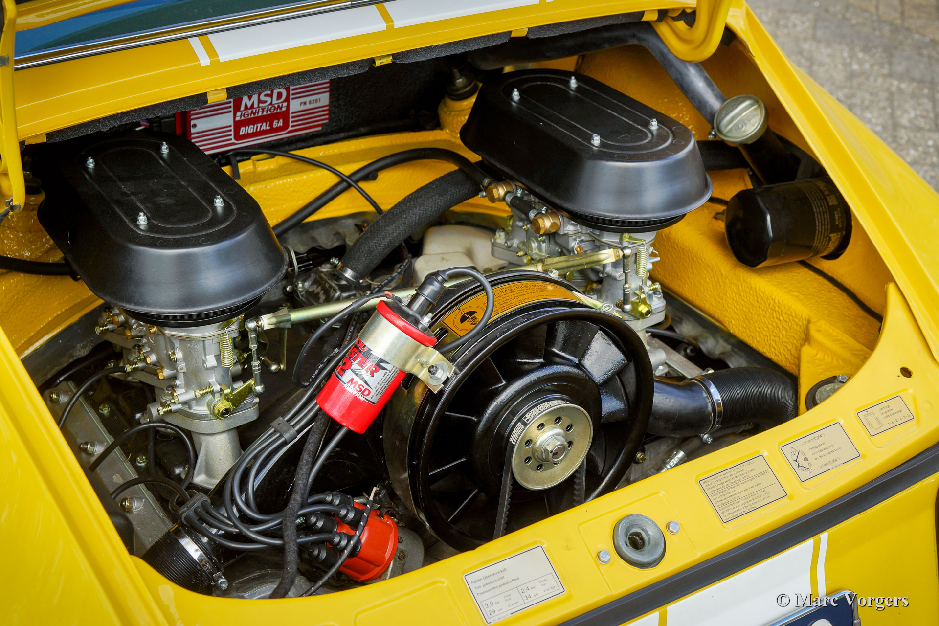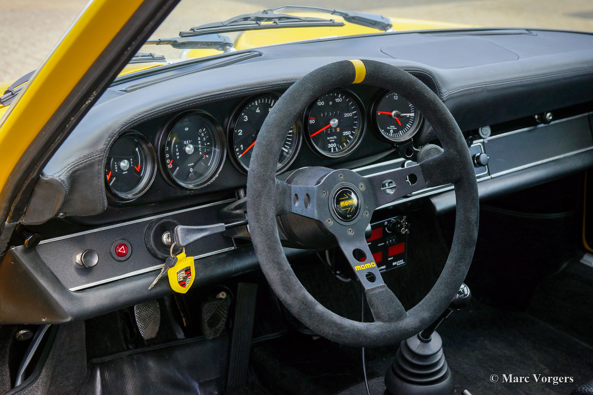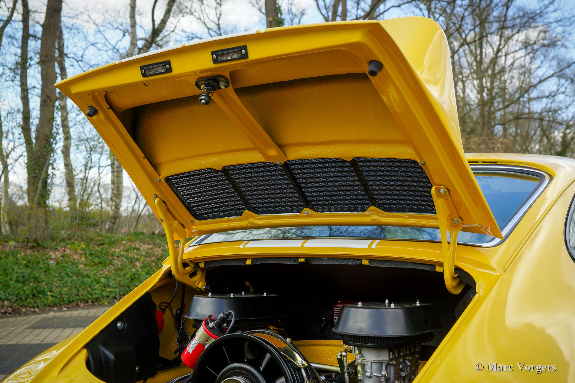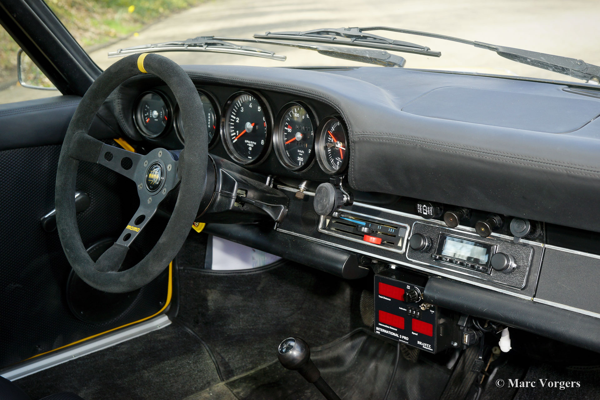 Porsche 911 2.4 « ST », année 1973. Première immatriculation le 8 mai 1974. Couleur jaune (Porsche Speedgelb) associée à un intérieur en cuir / similicuir noir. Cette magnifique Porsche 911 2.4 T (série F « long-nose ») fut restaurée et modifiée au look 911 « ST » par Classic Job. La restauration fut achevée en août 2020. La restauration comprenait une restauration complète de la tôle de carrosserie, avec la mise en œuvre d'ailes de style ST plus larges et une nouvelle peinture en jaune Minardi. Le moteur boxer à six cylindres de 2,4 litres fut entièrement dépouillé et entièrement révisé, tout comme les deux carburateurs triple Weber. Le moteur était équipé d'un allumage MSD et de filtres à air sport. Le moteur délivre 200 ch et il fonctionne et sonne superbement ! L'intérieur était entièrement neuf recouvert de cuir / similicuir noir et des sièges baquets spéciaux furent installés. Des reportages photo de la restauration et de la révision du moteur sont présents. Etudiez ICI le reportage photo de la restauration pour voir tous les détails. La reconstruction du moteur a également été photographiée, étudiez le reportage photo ICI. Cette fantastique Porsche 911 2.4 ST est dans un superbe état et la voiture roule et se manie parfaitement. Le moteur et la boîte de vitesses sont d'origine d'usine; numéros correspondants. L'expérience de conduite est fantastique et cette magnifique Porsche 911 « ST » est un véritable tour de tête. La voiture est équipée d'une boîte de vitesses 915 à 5 vitesses, de bandes sport blanches et d'un lettrage Porsche sur les portes, d'un volant sport Momo spécial, d'un autoradio Bluetooth « classique » moderne, de harnais de sécurité 4 points, d'un arceau de sécurité, de larges jantes en alliage de style Fuchs, un capot « duck-tail », un système d'échappement en acier inoxydable, un tripmaster numérique Brantz International 3 Pro et des lampes auxiliaires Cibië Oscar avec couvercles Cibië.