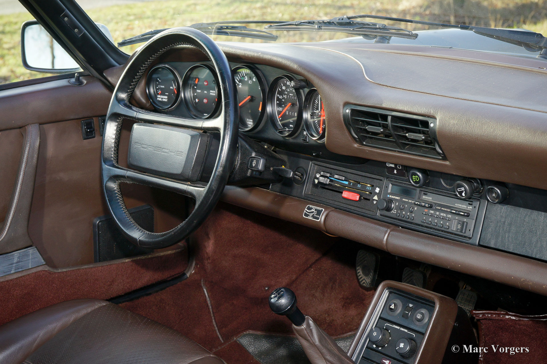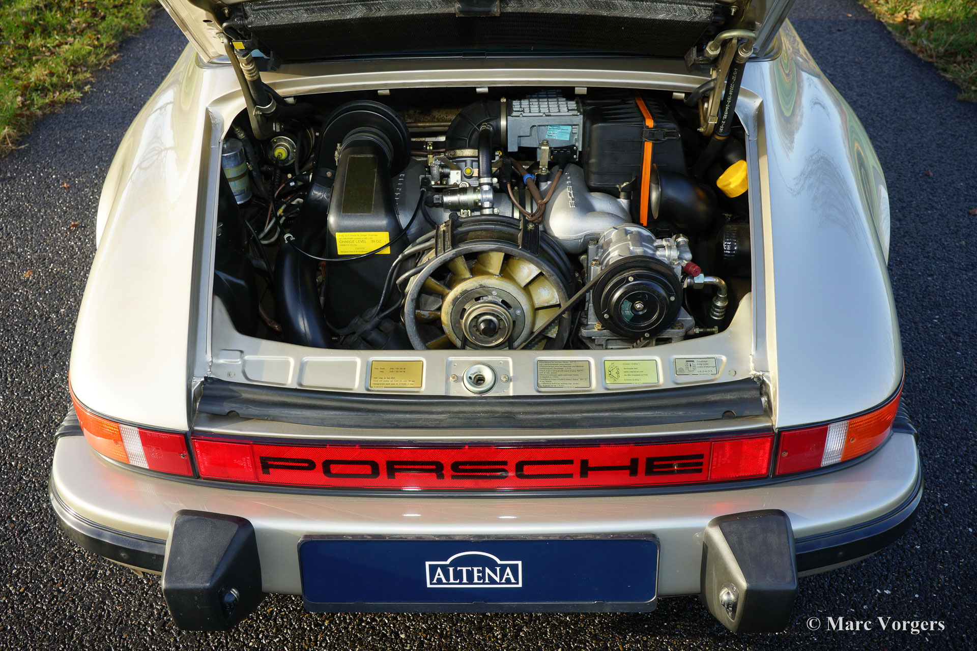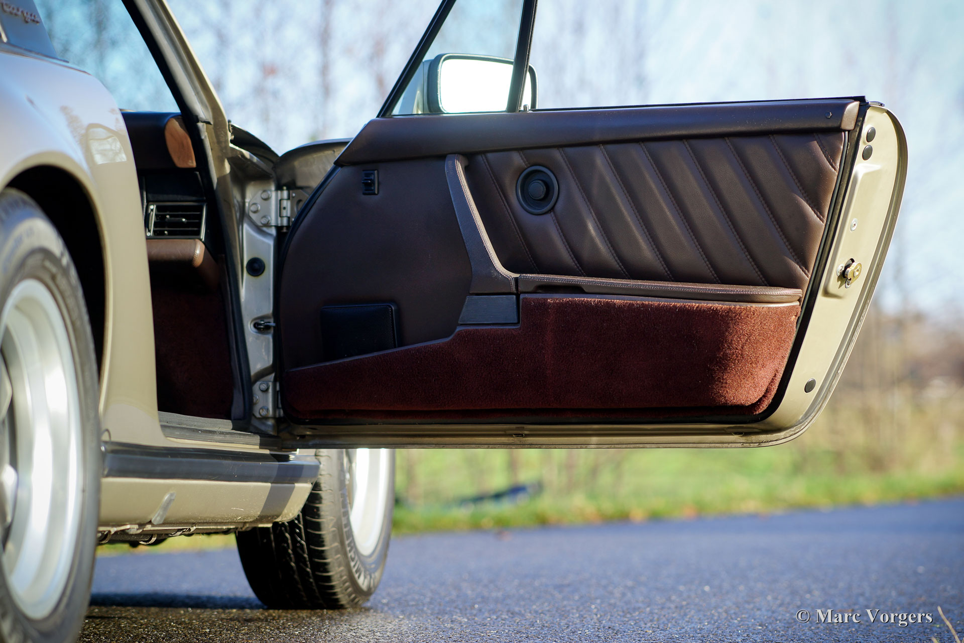 Porsche 911 3.2 Carrera Targa, année 1986. Couleur ‘Weissgold’ métallique (code L999) avec un intérieur en cuir brun et tapis brun. Cette magnifique Porsche 911 de la série 3.2 Carrera a été vendue neuve aux Etats-Unis (Sacramento en Californie). La voiture a été importée aux Pays-Bas en l'année 2014. Cette fantastique Porsche 911 Targa est en super original et en excellent état ! La voiture a conduit seulement 55.784 milles de nouveau et ceci est entièrement documenté. La voiture montre tous les détails originaux et tout semble et se sent très bien entretenu à des normes élevées. Présent sont des livrets originaux et un livre de maintenance Porsche. L'ensemble d'outils original et complet, l'original compresseur d'air et un beau tapis marron original avec le nom Porsche tissé. Cette Porsche 911 3.2 Carrera Targa est équipé de belles roues originales Fuchs. C'est un superbe exemple original !