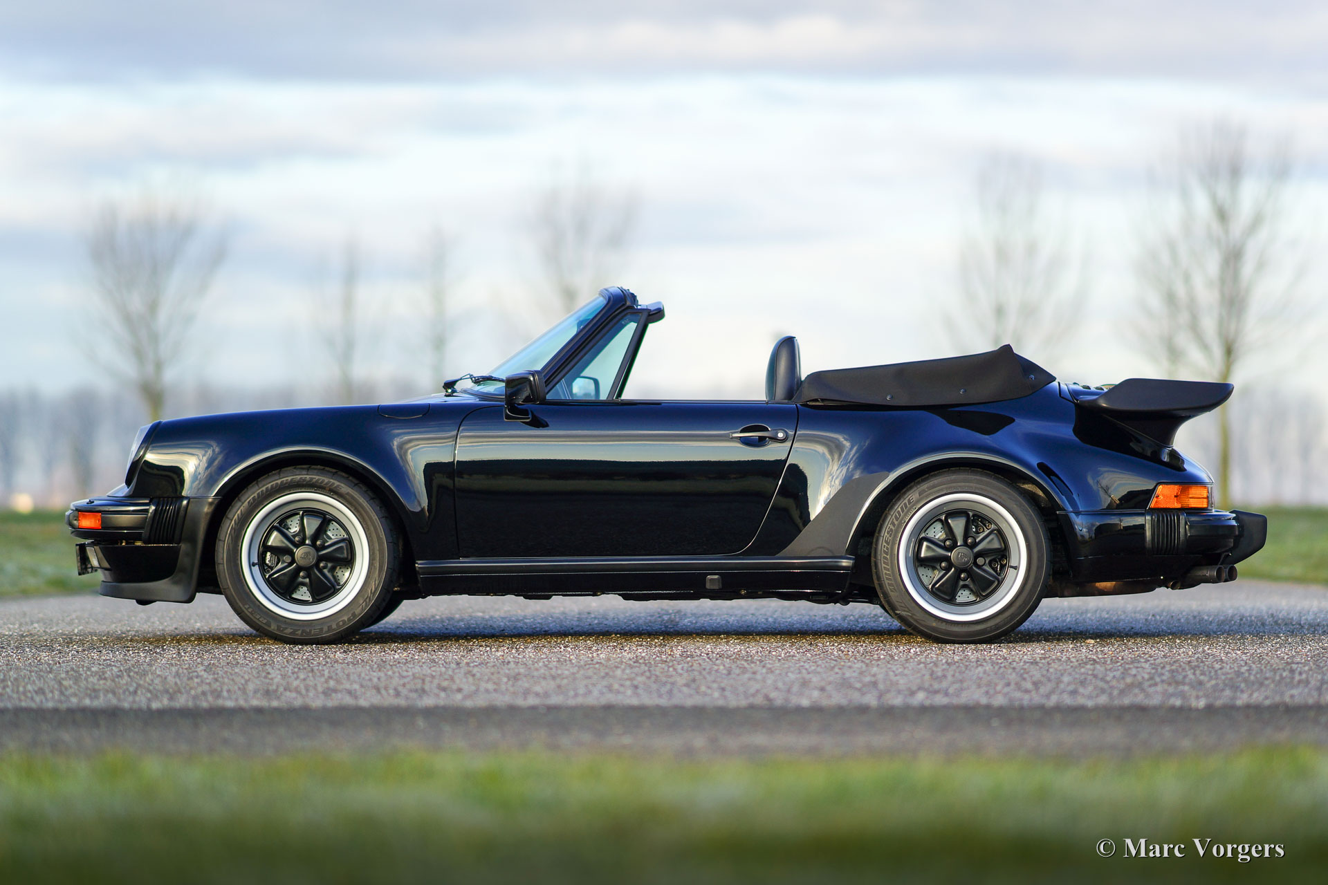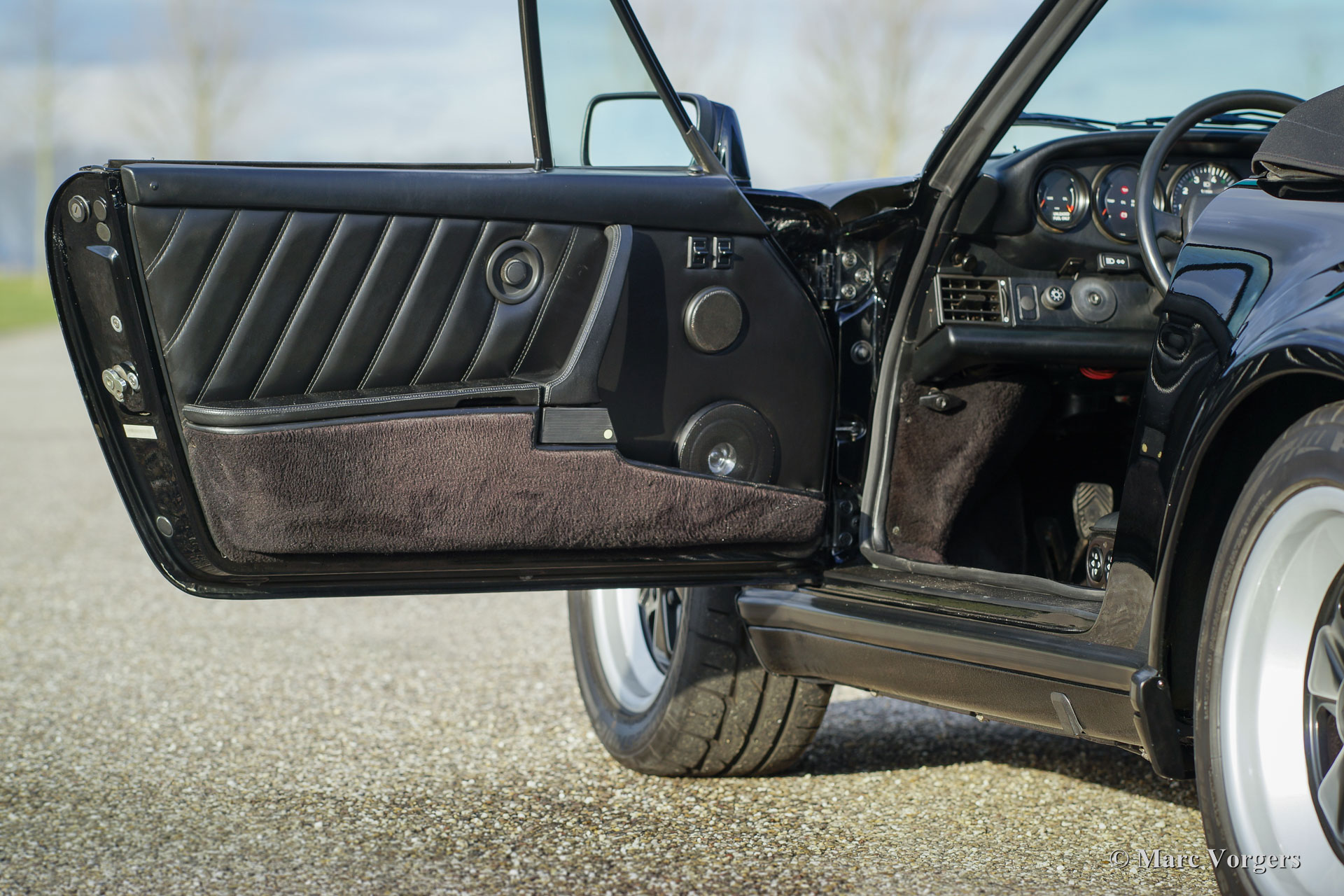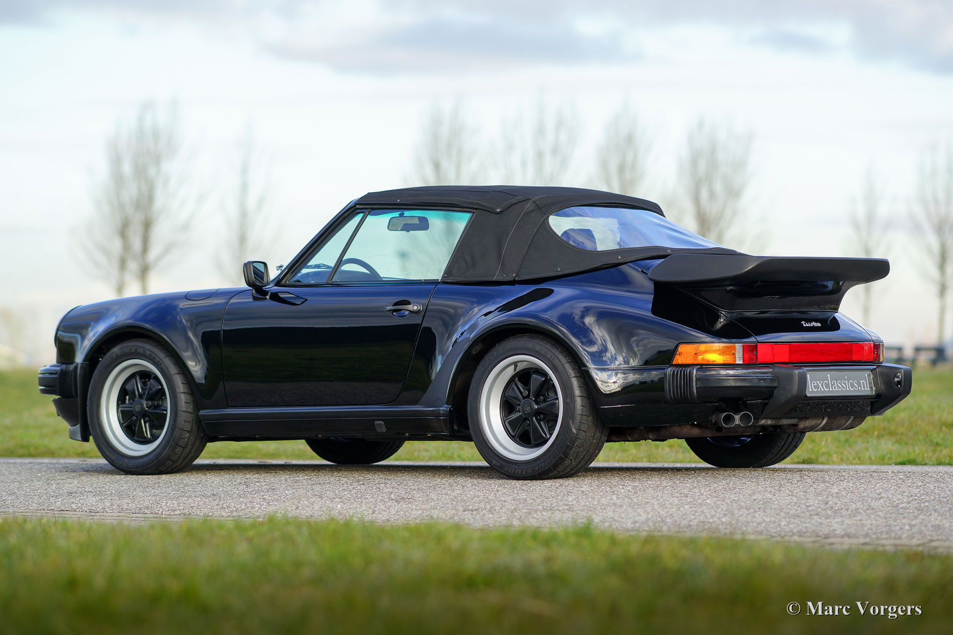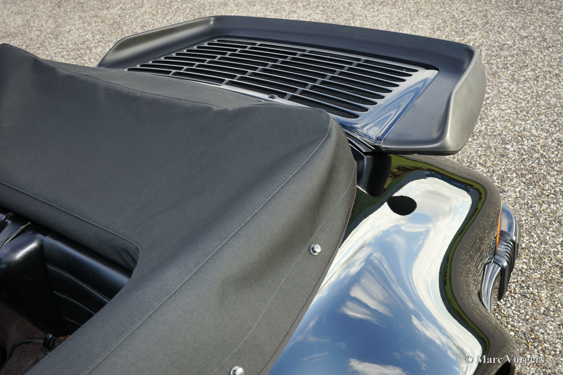 Porsche 911 (930) Turbo Cabriolet, 1987. Couleur noir (Code couleur A1V9) avec un intérieur cuir noir et tapis noir. Capote noire et couvercle de la hotte noire. Ce magnifique et ‘matching numbers’ Porsche 911 Turbo est en excellent/superbe état. La voiture a été vendue neuve en Californie, États-Unis, en 1988. Aux Etats-Unis, la voiture a connu trois propriétaires. Le premier propriétaire a conduit la voiture pendant huit ans et le dernier propriétaire chérissait la voiture pendant seize ans. En l'an 2014 cette belle Porsche a été importé aux Pays-Bas. La voiture est livrée avec un fichier fantastique et très complète l'histoire et le service.