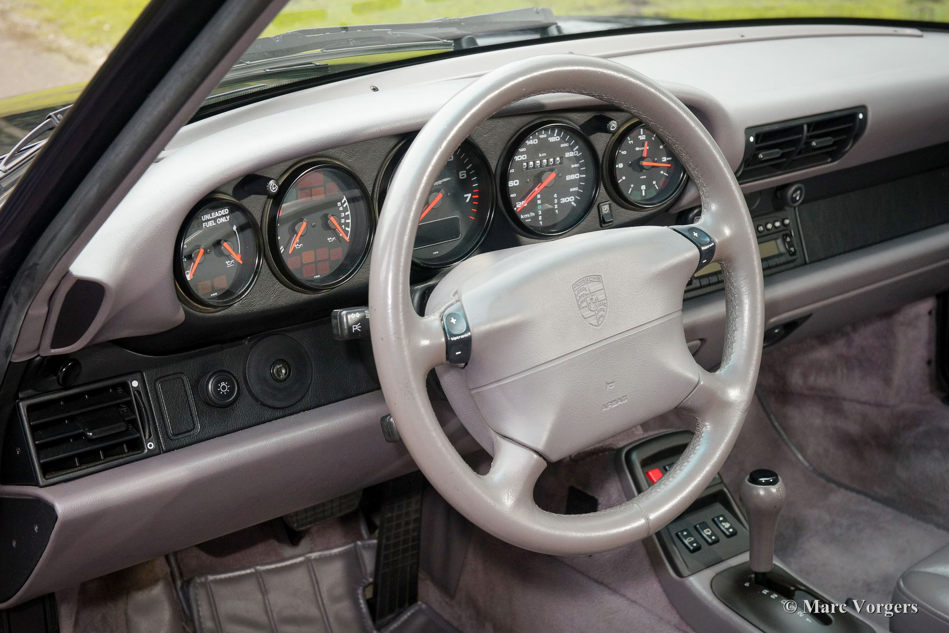 Porsche 911 (993) Carrera, année 1996. Couleur ‘nuit bleu’ métallique, intérieur en cuir lilas / gris.