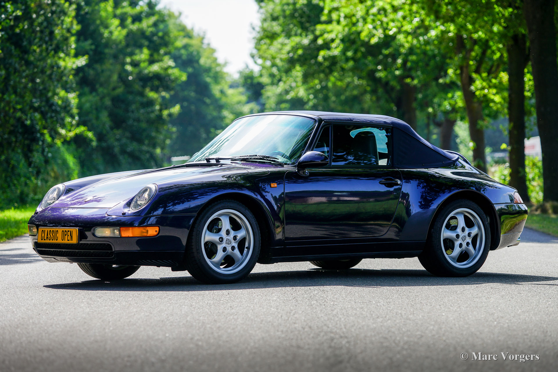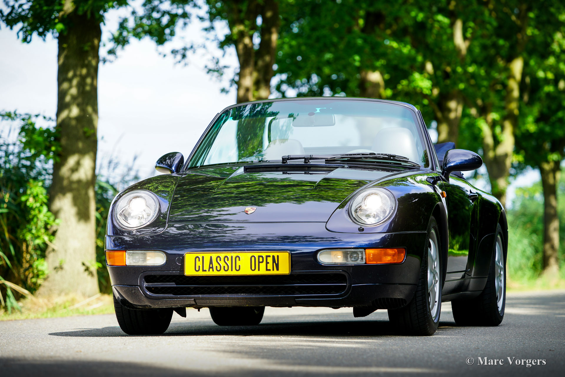 Porsche 911 (993) Carrera 2 Cabriolet, année 1994. Couleur bleu nuit métallisé, intérieur en cuir Raff gris et moquette grise assorties. Capote et couvre-tonneau en mohair bleu foncé. Livrée neuve aux Pays-Bas par l'importateur Pon, la voiture a bénéficié d'un entretien méticuleux, d'abord par Pon à Amersfoort, puis par le spécialiste Porsche Theo Jansen et le spécialiste Porsche/Ferrari Fred Huisman. L'historique d'entretien est complet. Le compteur affiche 133 150 km et la voiture est en excellent état, avec seulement une légère usure à l'intérieur. Cette magnifique Porsche 911 n'a jamais été accidentée et a toujours été garée à l'intérieur. Appréciée par son propriétaire actuel depuis novembre 2004. La 911 série 993 est considérée comme l'un des modèles refroidis par air les plus recherchés, représentant l'évolution ultime de la légendaire 911. Cette superbe Porsche 911 est propulsée par un moteur boxer six cylindres de 272 ch, entraînant les roues arrière via une boîte automatique Tiptronic.
