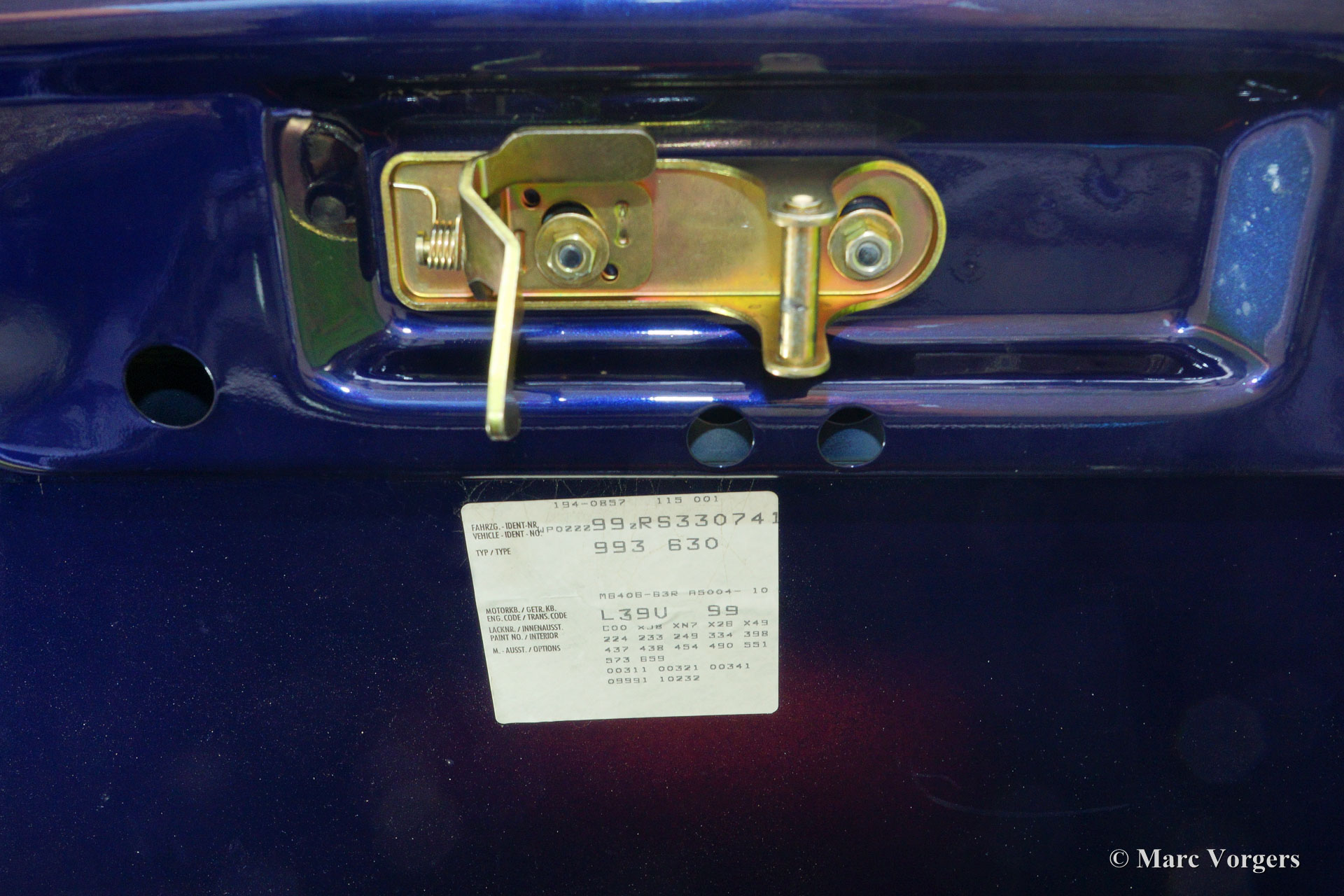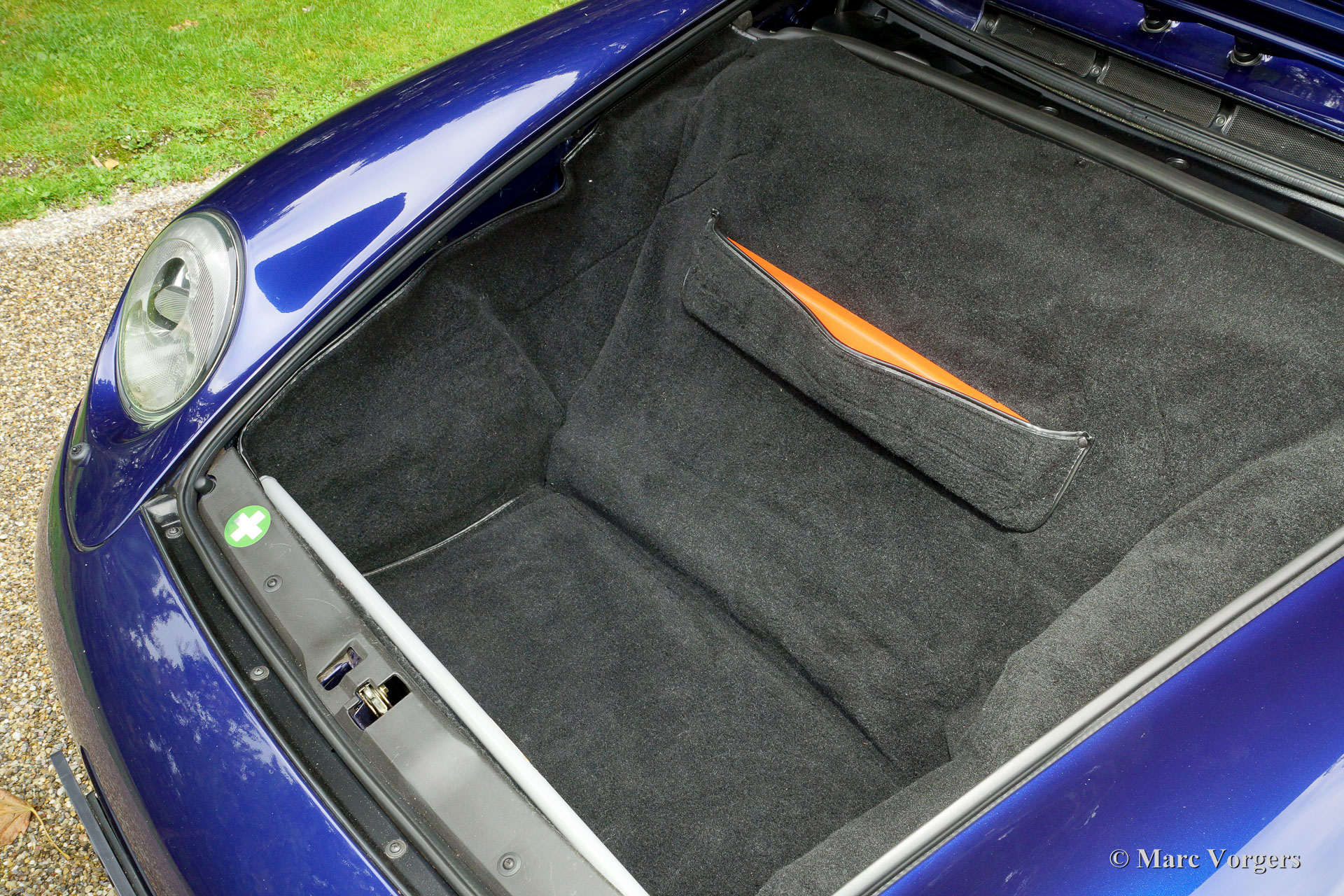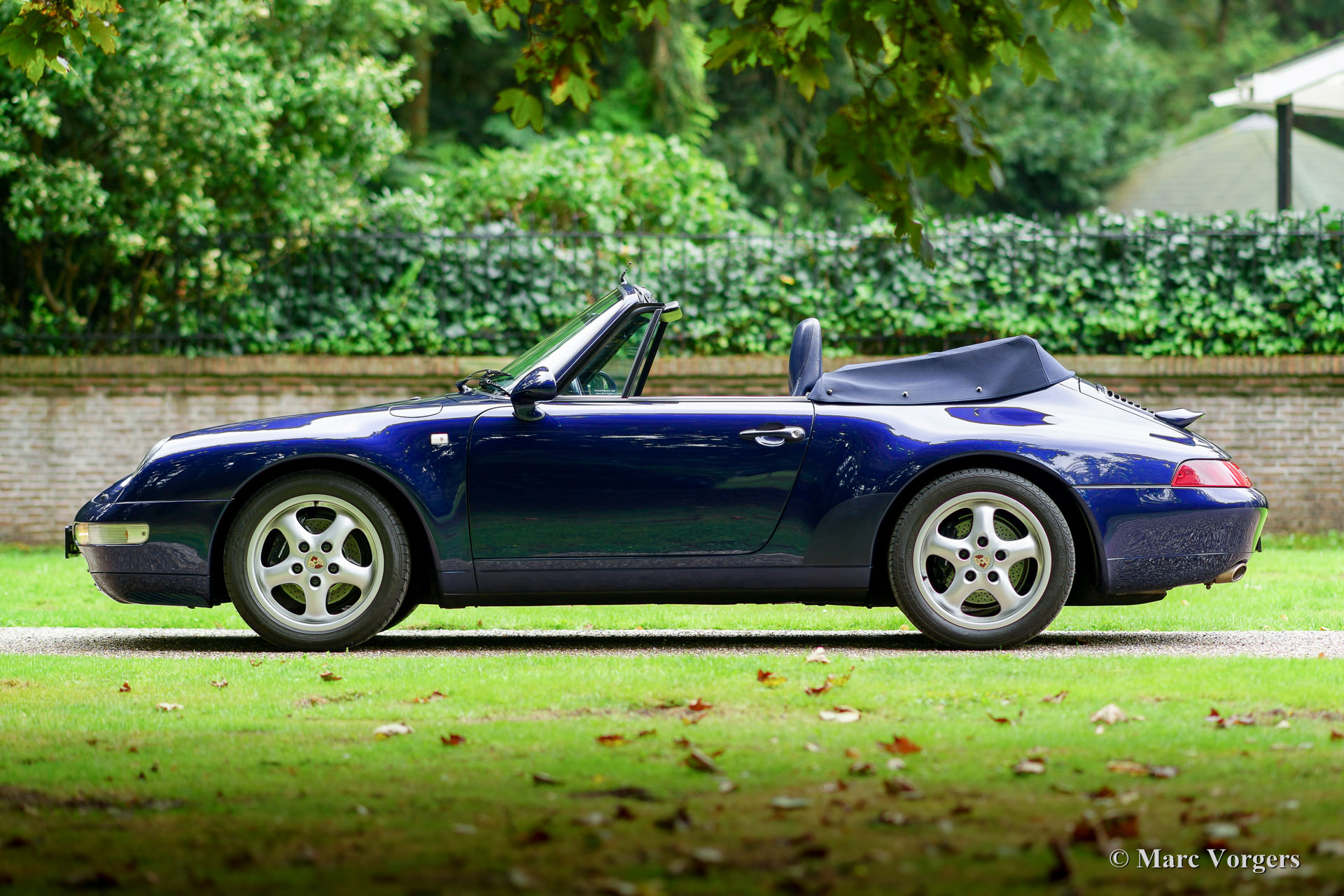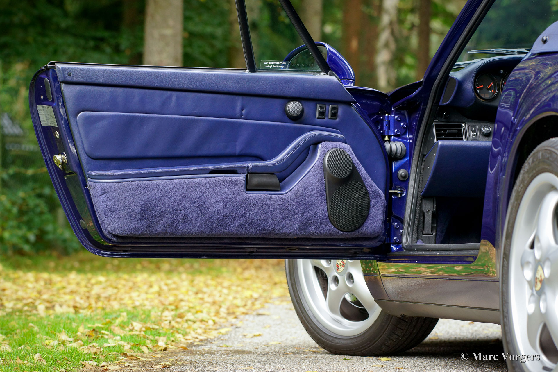 Porsche 911 (993) Carrera cabriolet, année 1994. Couleur Iris bleu métallique avec un intérieur cuir bleu et tapis bleu. Capote bleu et couvercle de la hotte bleu. Ce magnifique Porsche 911 Carrera cabriolet a été vendue neuve en Allemagne par Hahn Sportwagen. Cette Porsche 911 de la série 993 est en superbe état d'origine et la voiture a conduit seulement 64,500 km (confirmés) de nouveau! Tout le livret d'origine sont présents tout comme le livre de service qui a été tamponné et rempli ponctuellement. L'entretien annuel précoce a eu lieu en Allemagne, à partir de l'année 2002, la Porsche a été entretenu par des spécialistes néerlandais Porsche. Cette Porsche 911 Carrera cabriolet roule absolument parfaite et la voiture dispose d'une boîte de vitesses automatique parfaitement décalage. Ceci est un Porsche cabriolet formidable dans les meilleures conditions !