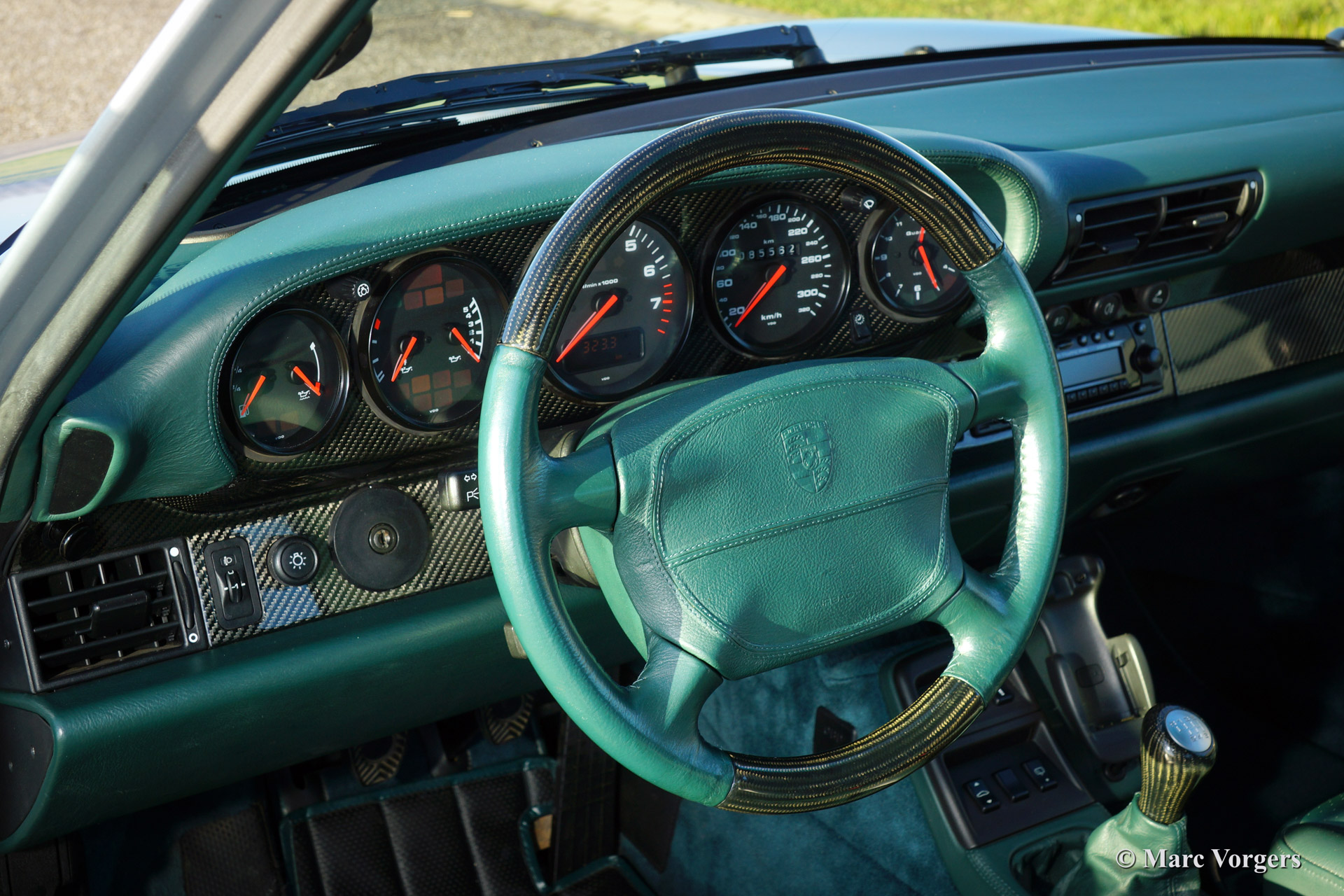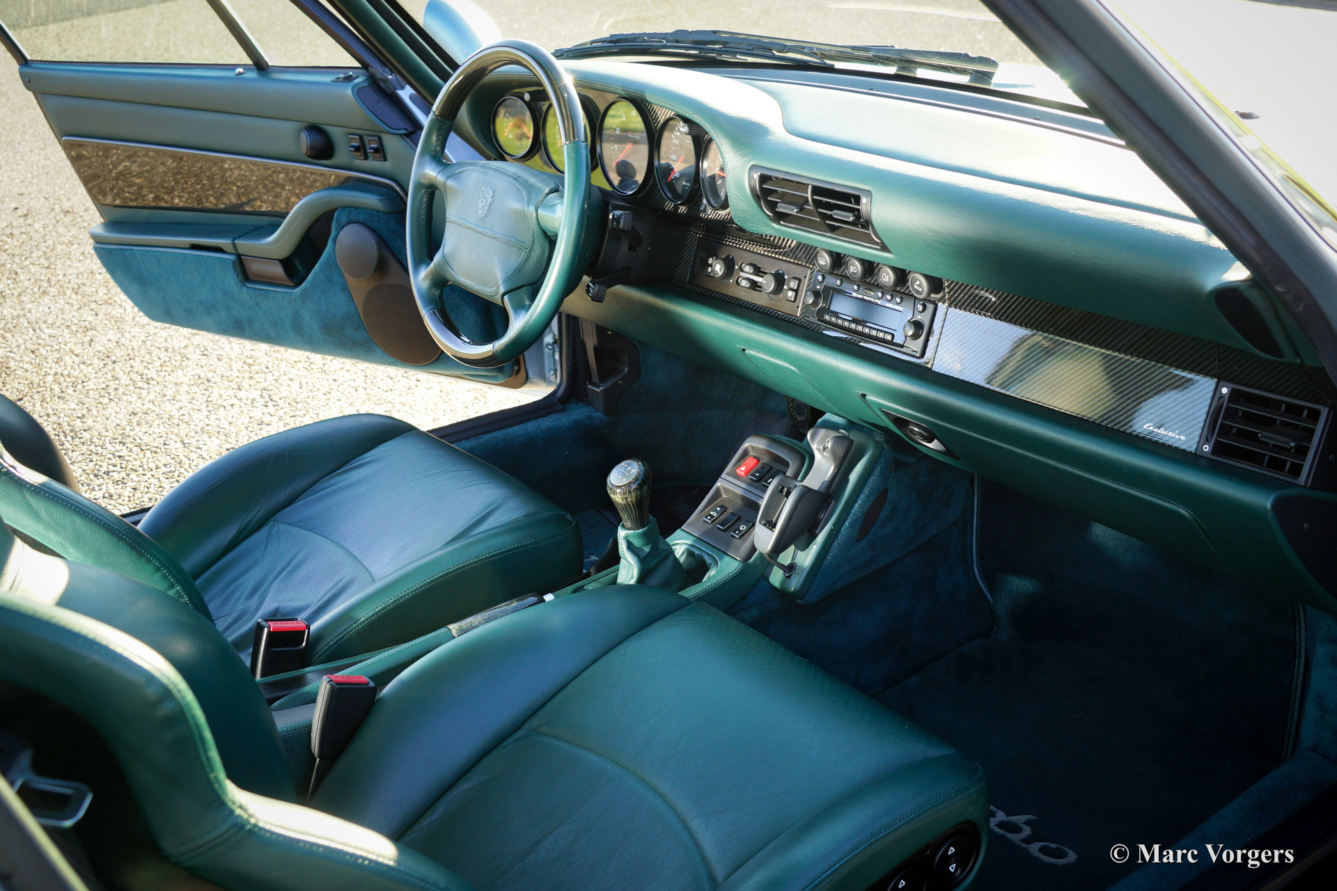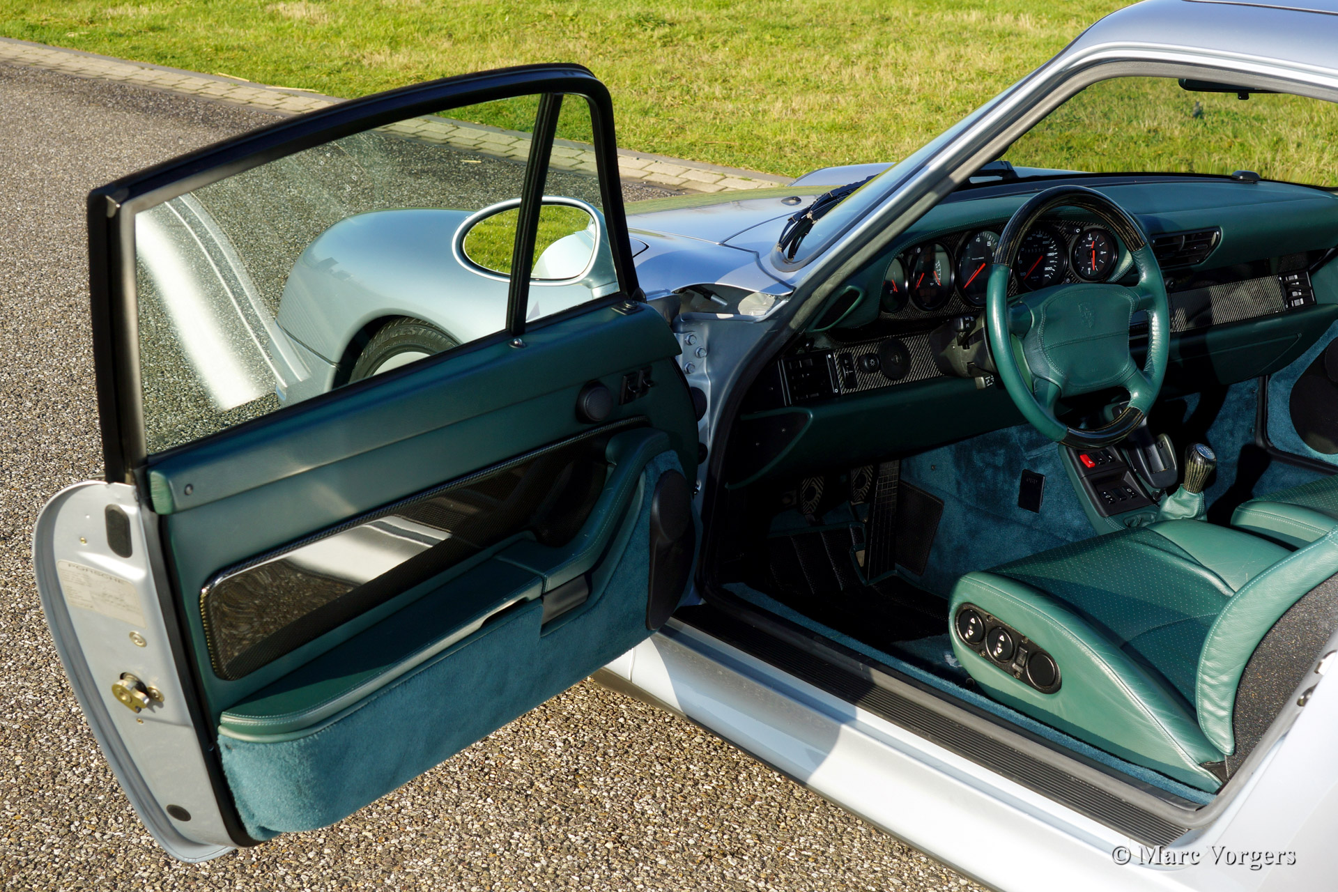 Porsche 911 (993) Turbo, year 1996. Colour Polar silver metallic with a Cedar green leather 'sport' interior. This 911 Turbo features many visible options like: original power sliding roof, gear lever and handbrake lever in carbon and leather trim, carbon accents on dashboard and door panels.