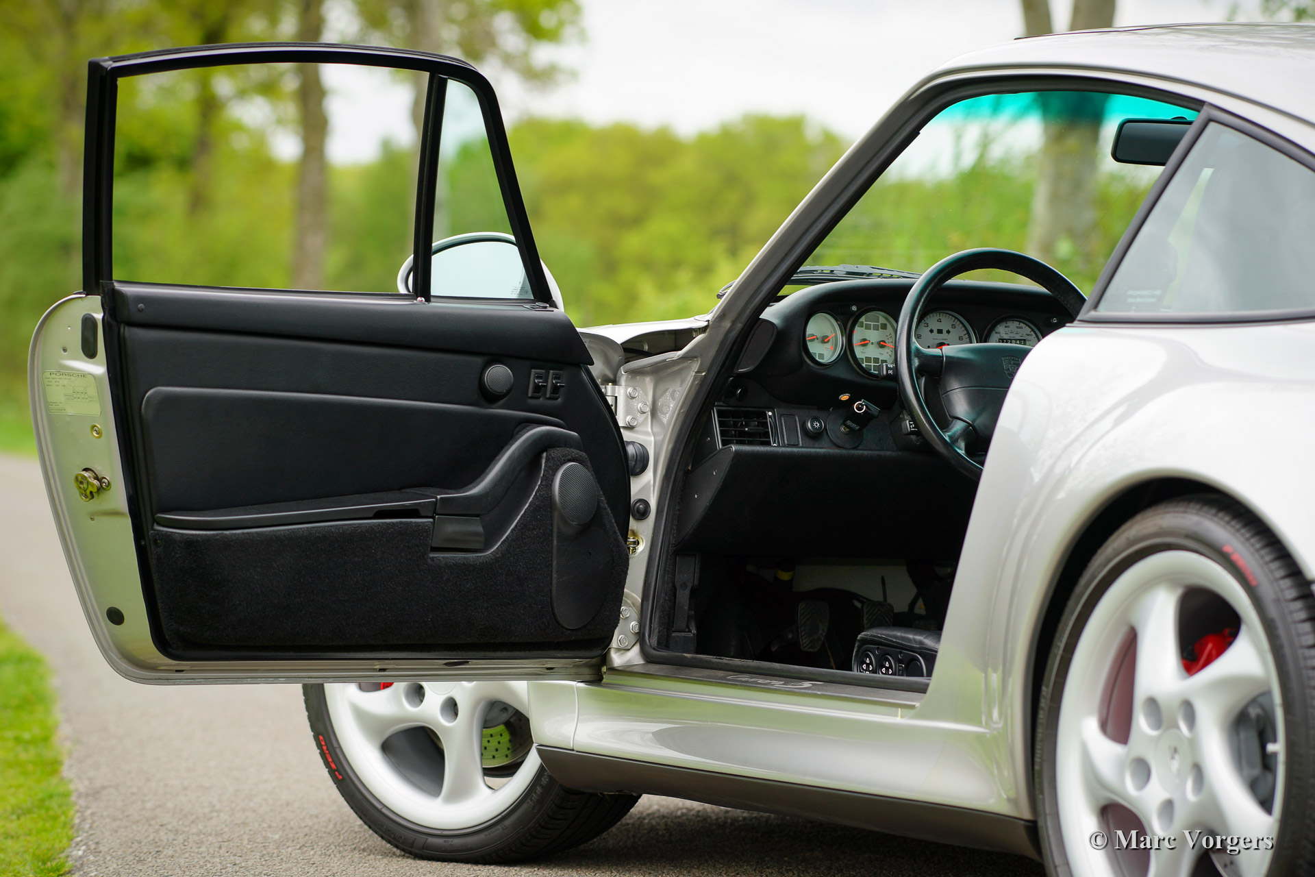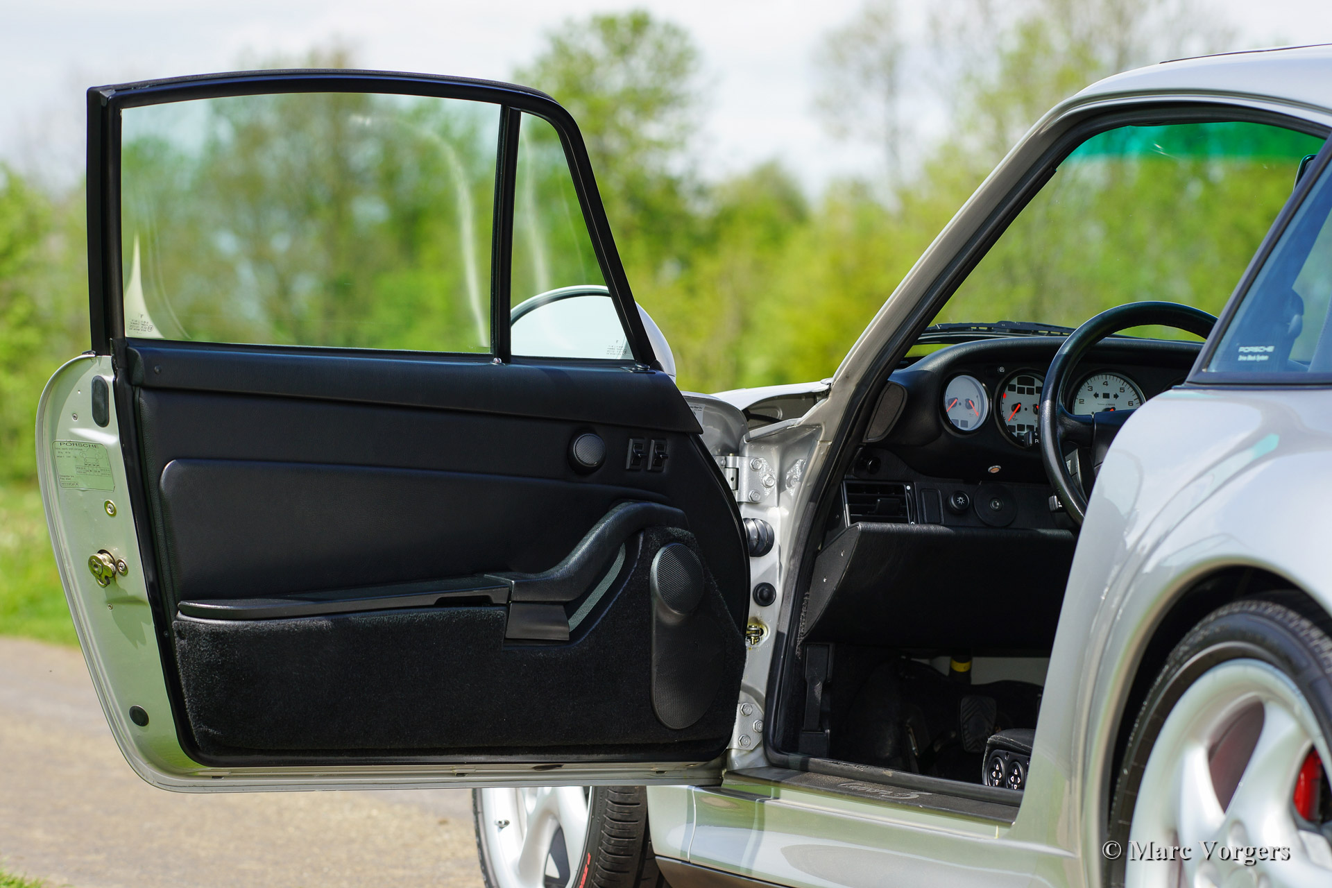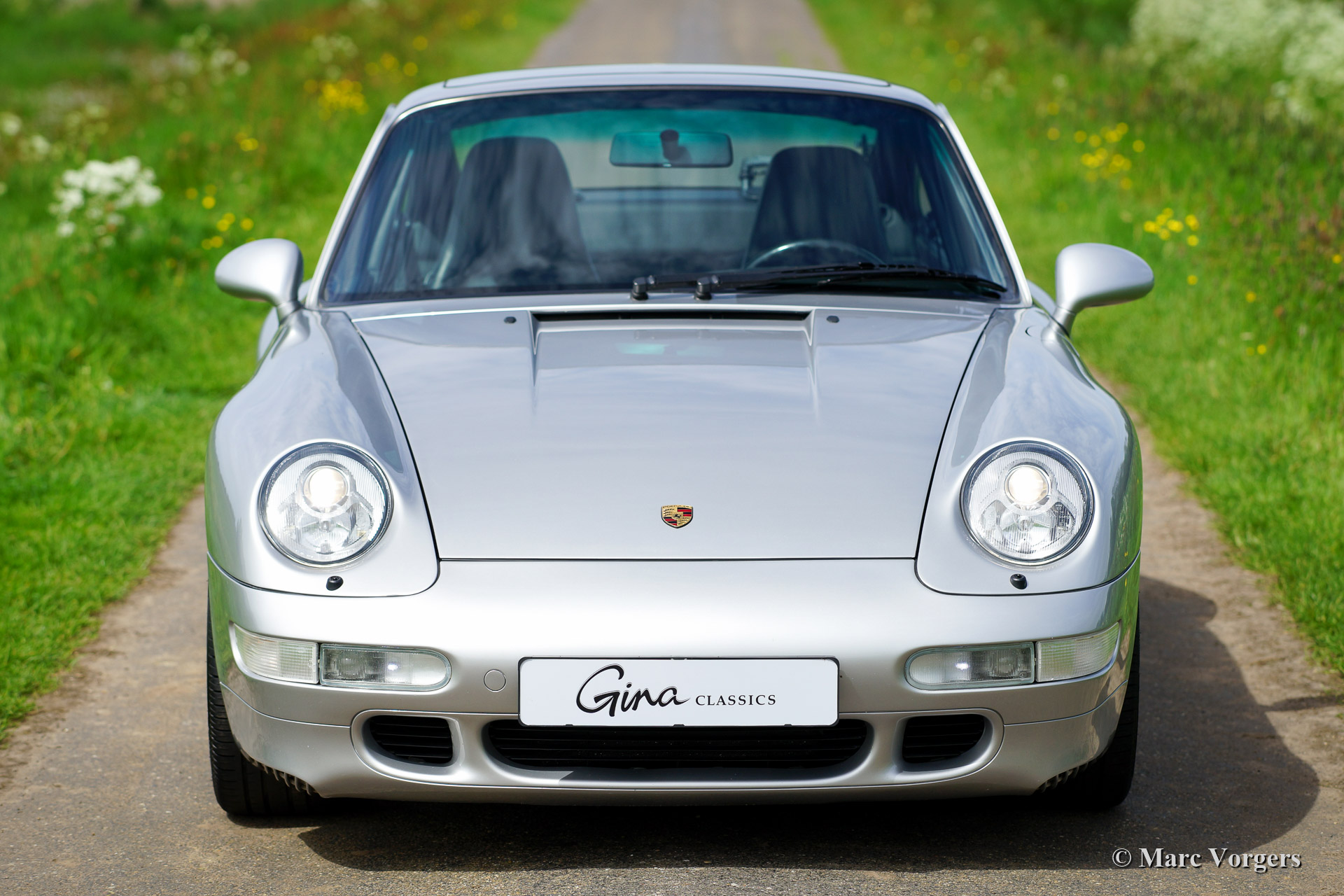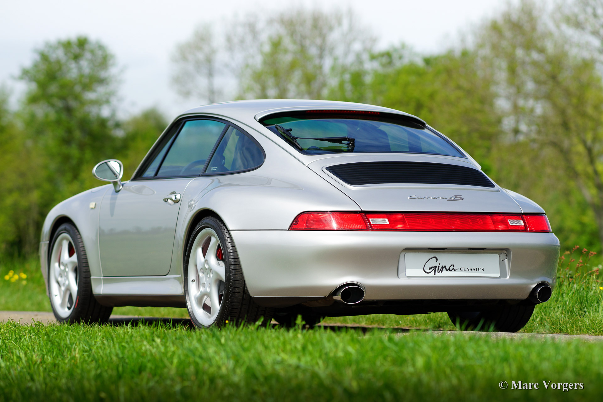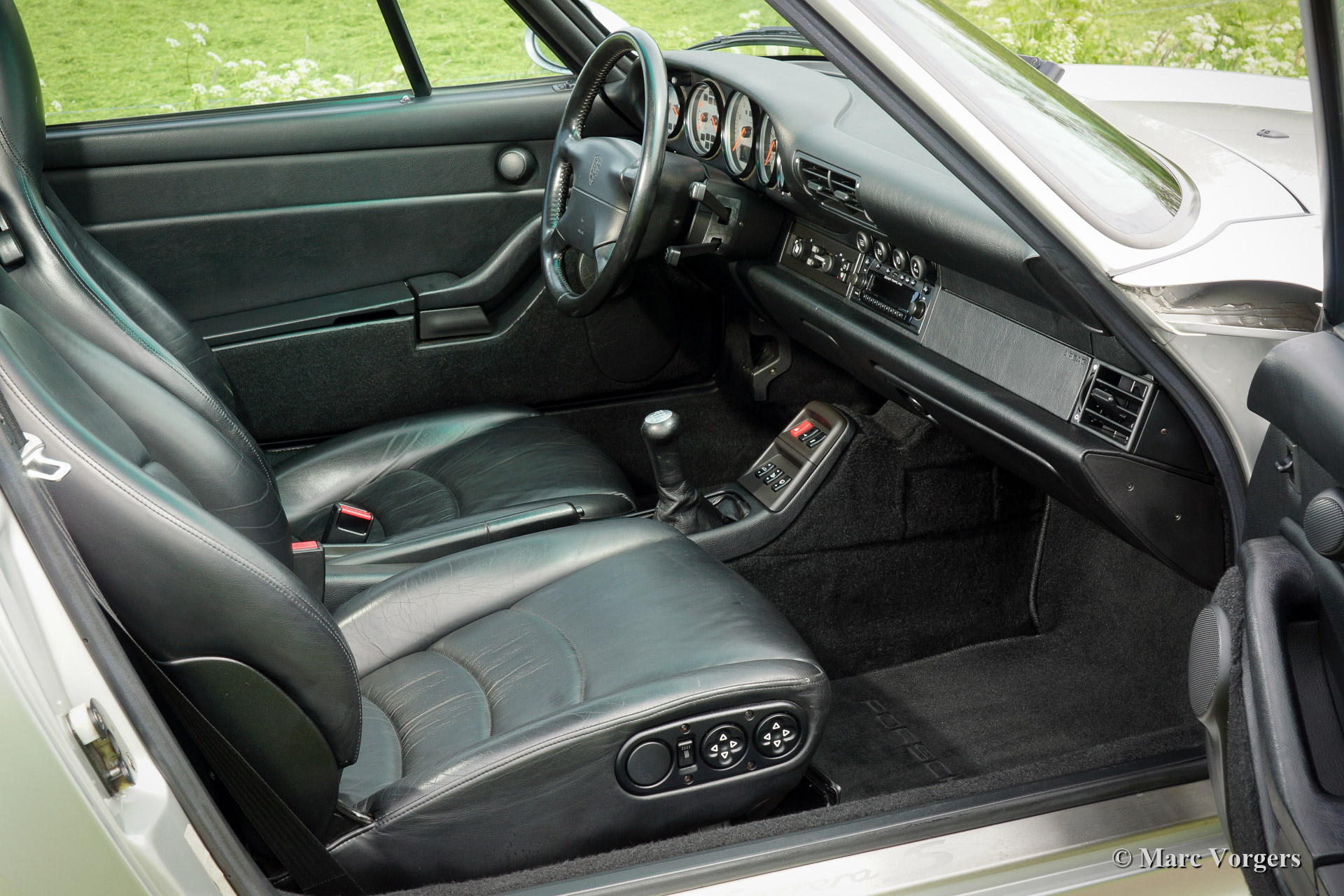 Porsche 911 (993) Carrera 4S, année 1998. Couleur argent métallique (Arctic Silver) avec un intérieur cuir noir et tapis noir.