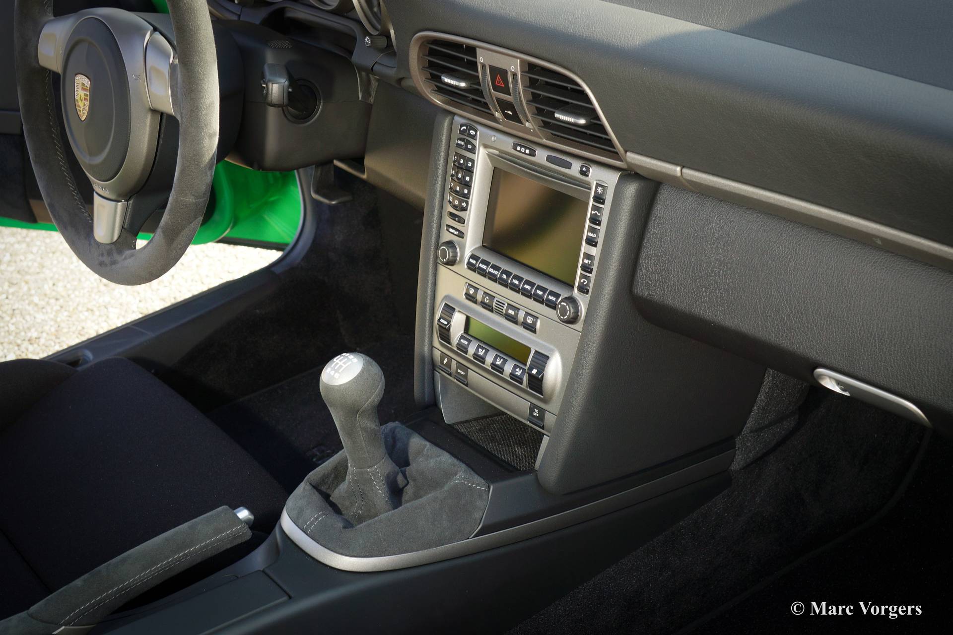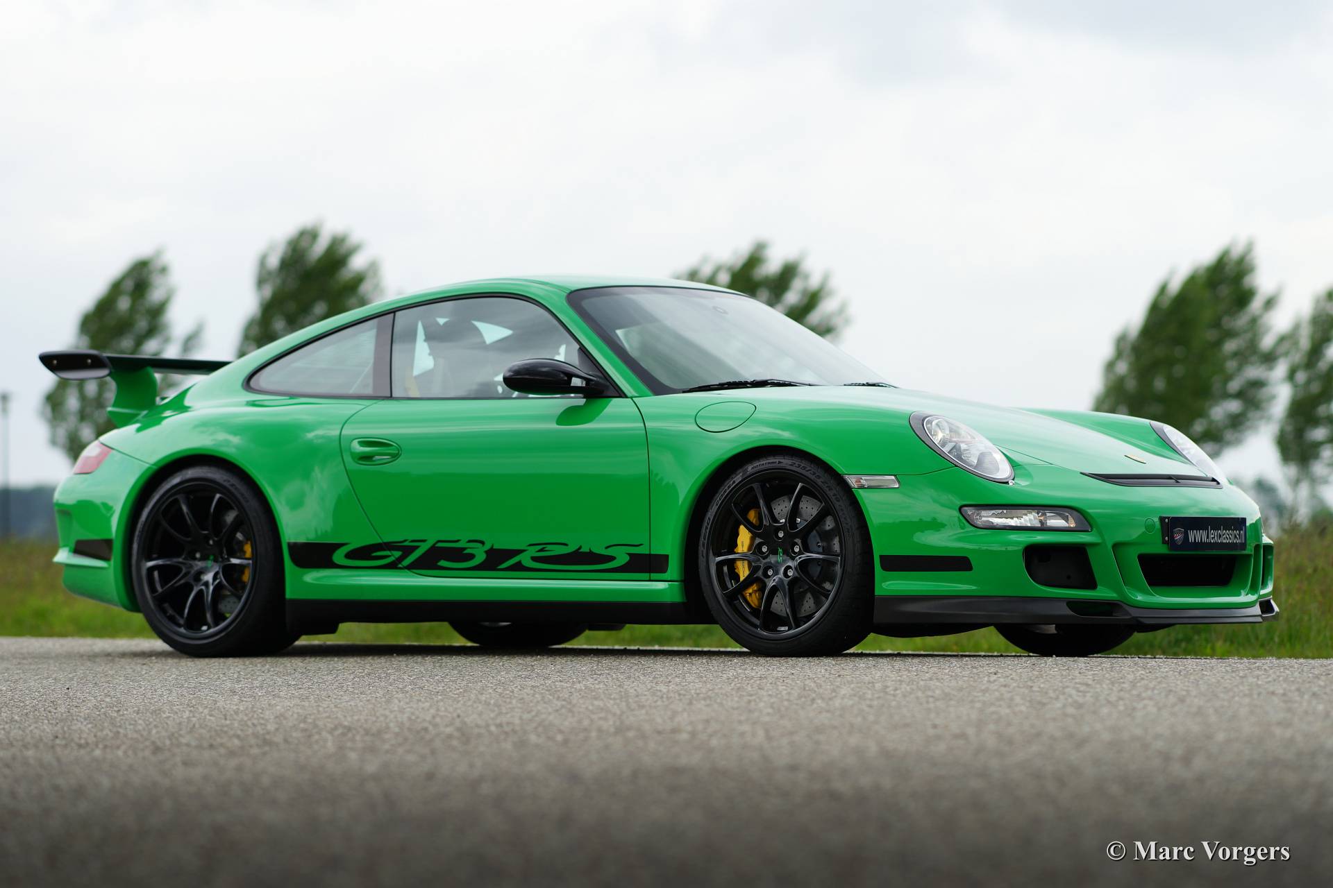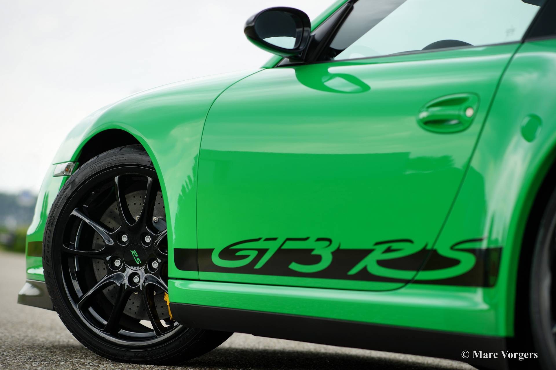 Porsche 911 GT3 RS, année 2007. Couleur verte avec lettrage noir GT3 et un intérieur noir. Seuls les 1909 Porsche 911 voitures de ce type ont été construits. Le jeu de couleurs est rare, 87 GT3 RS voitures ont été livrés dans cette couleur.