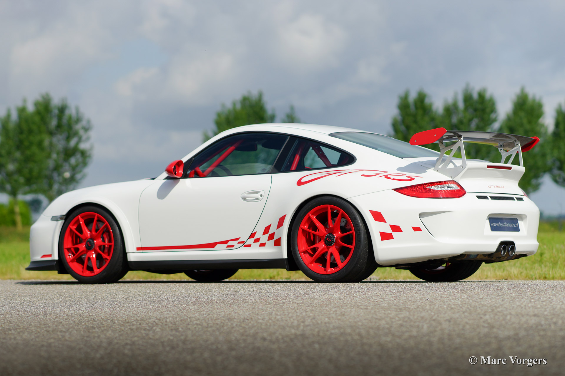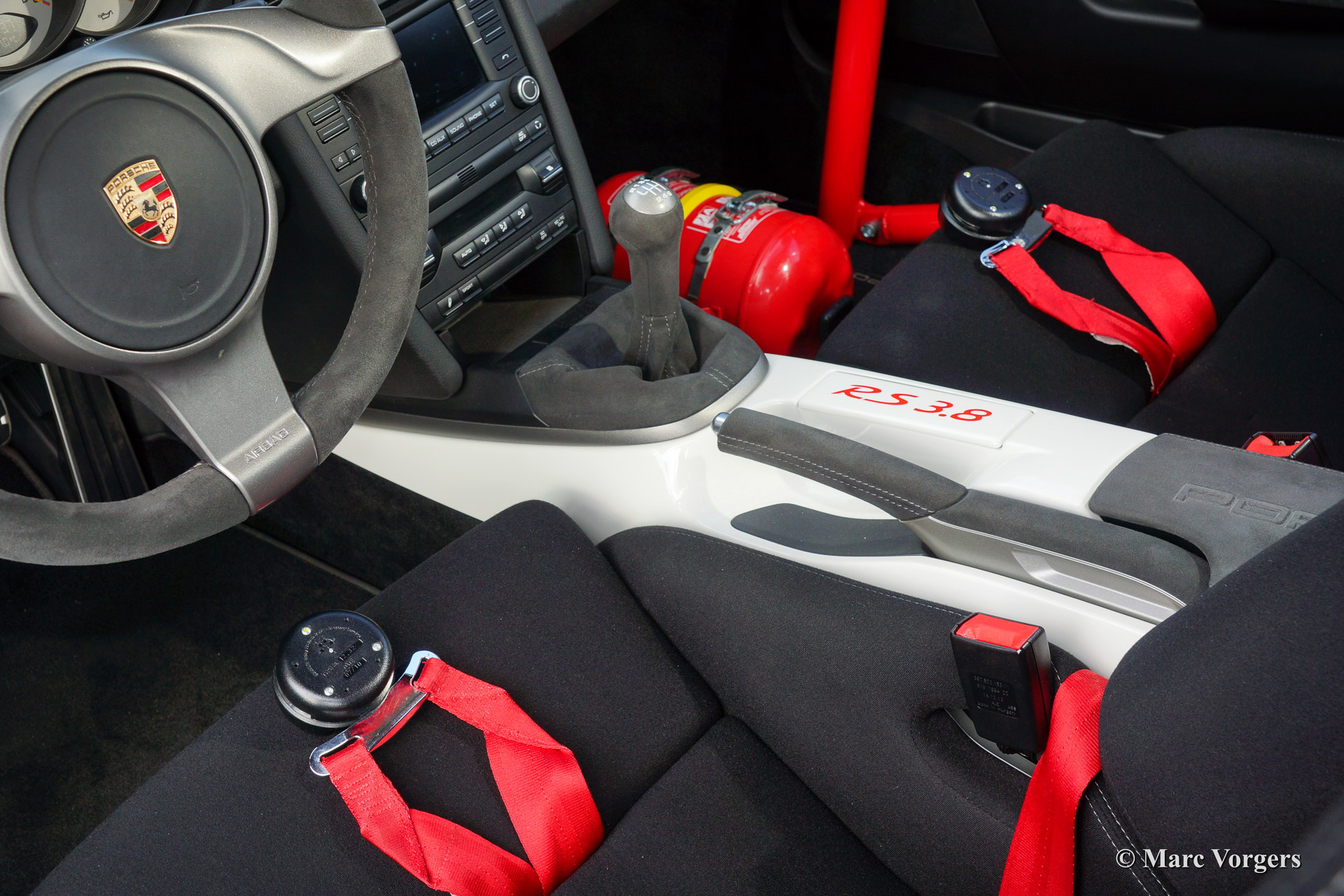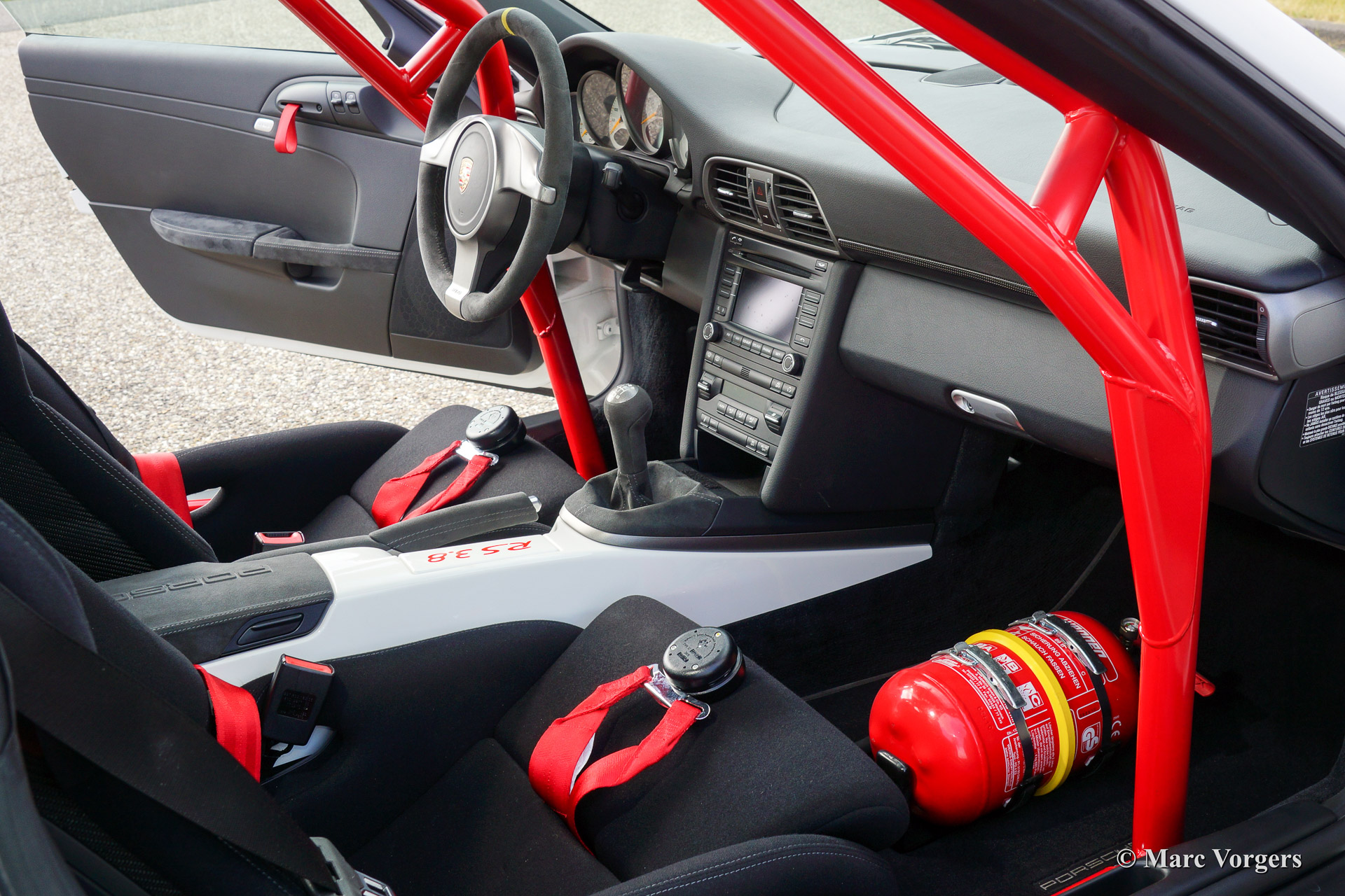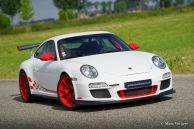 Porsche 911 GT3 RS 3.8, annee 2010. Couleur Carrera weiss et roues en couleur Indisch rot. Intérieur noir avec un roll-cage rouge. Cette formidable Porsche 911 GT3 RS (type 997) a été vendue neuve en France par Le Centre Porsche de Nantes.