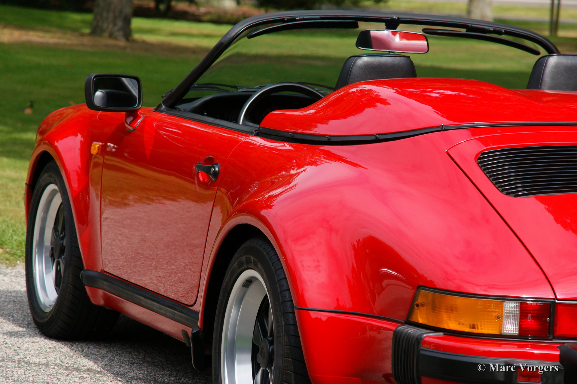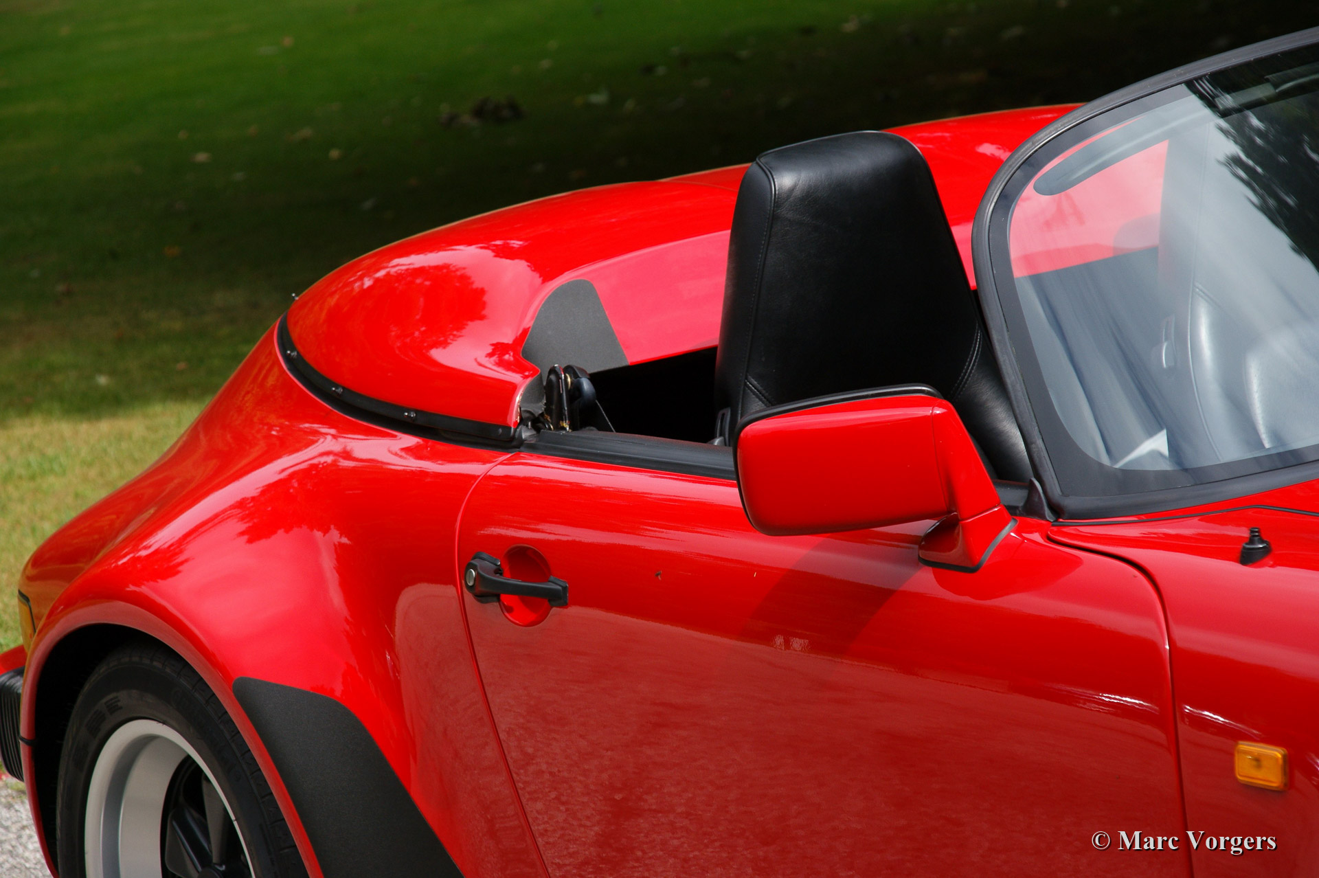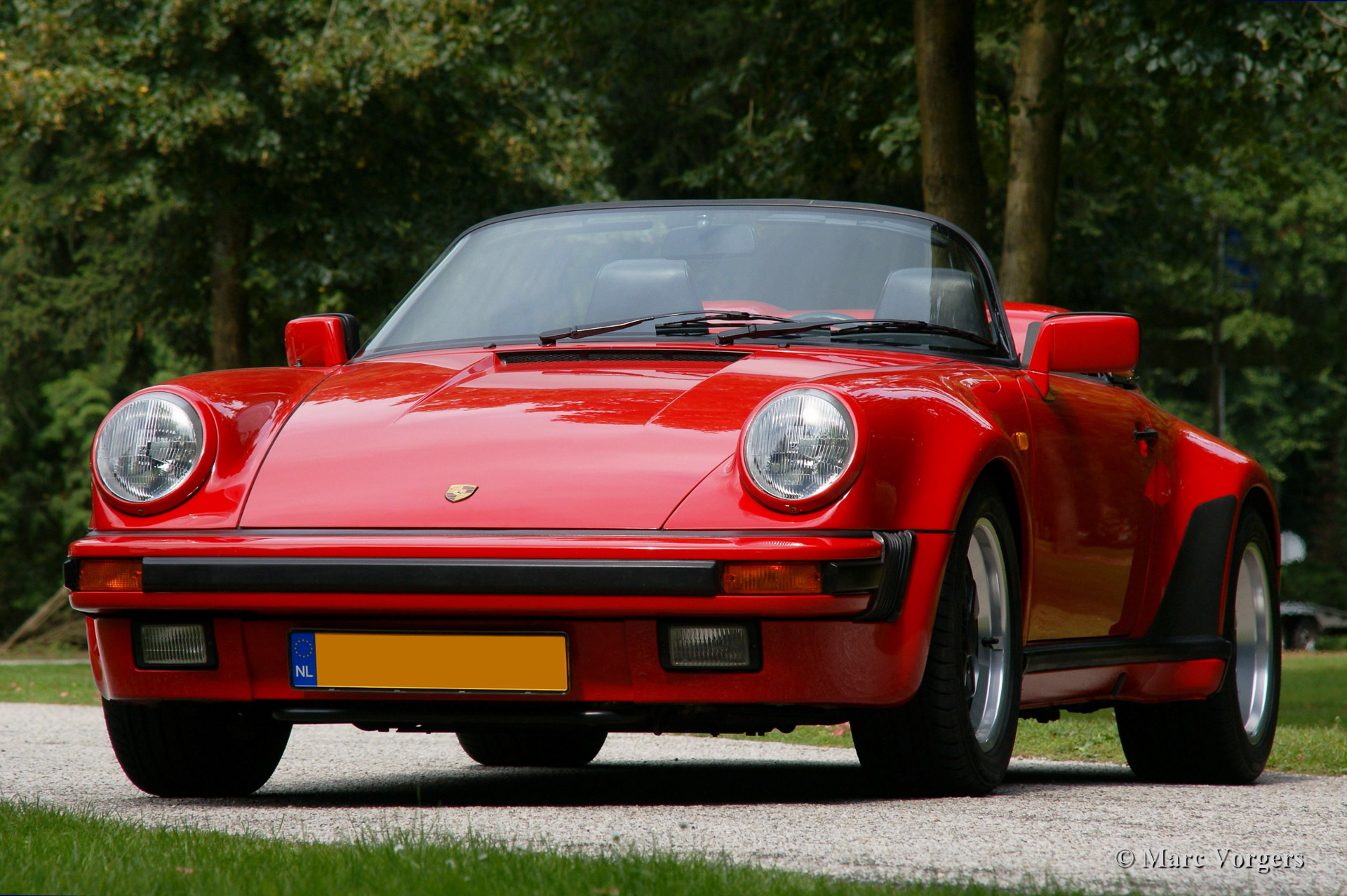 Porsche Carrera 3.2 Speedster, year 1989. Colour red with a black leather interior and a black soft top. This beautiful 911 Speedster was sold new in The Netherlands on February 28 1989. This Porsche 911 Carrera 3.2 Speedster is in brand new original condition (6390 km. from new.) A limited series of 2103 cars of this type have been built.