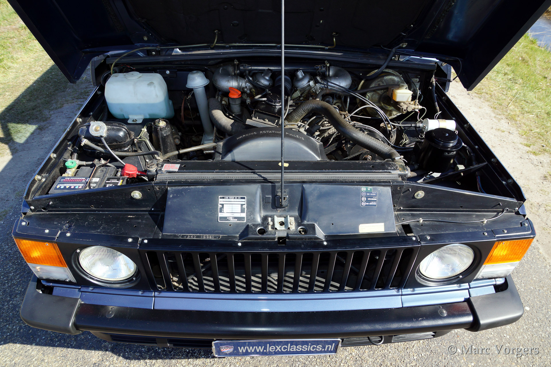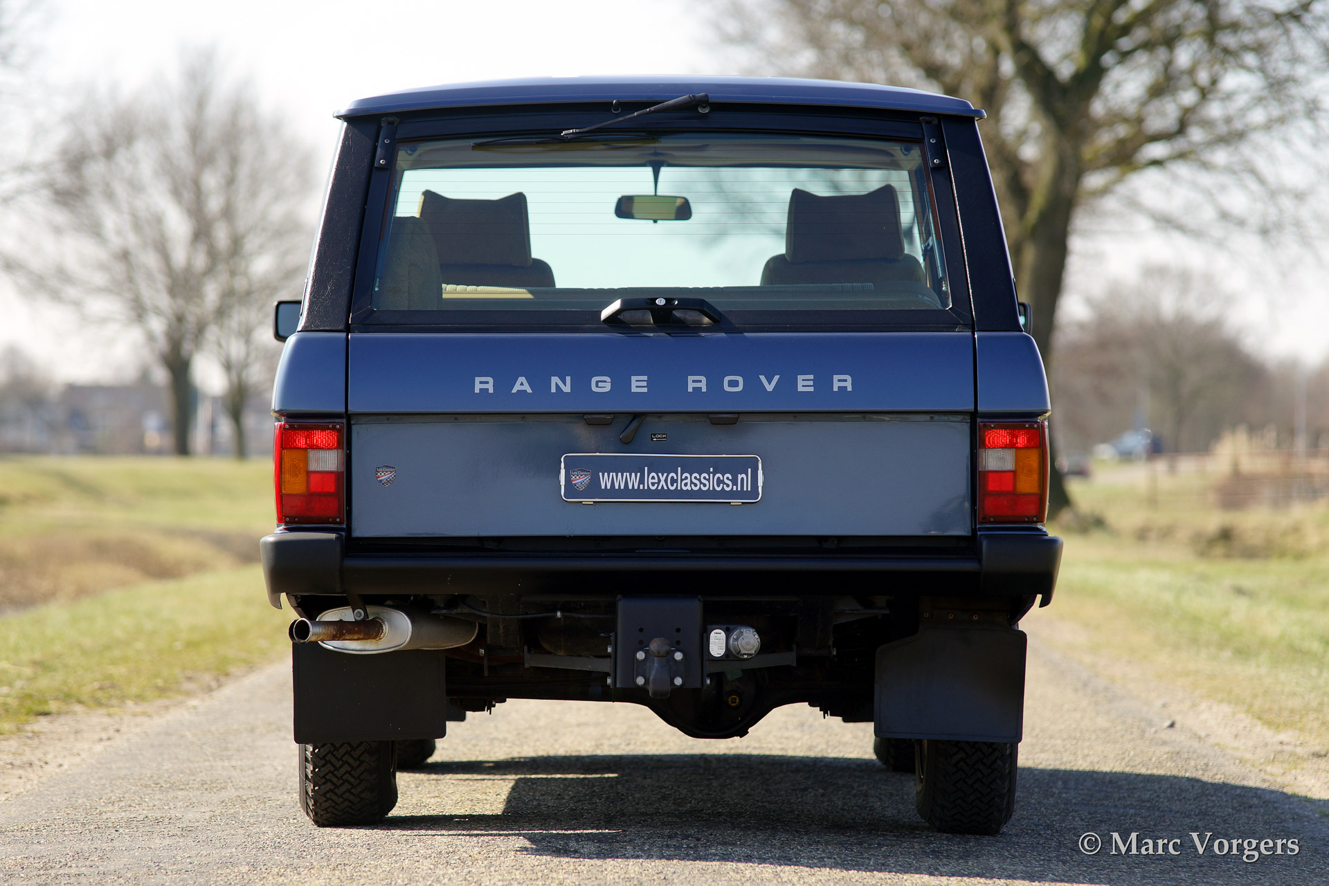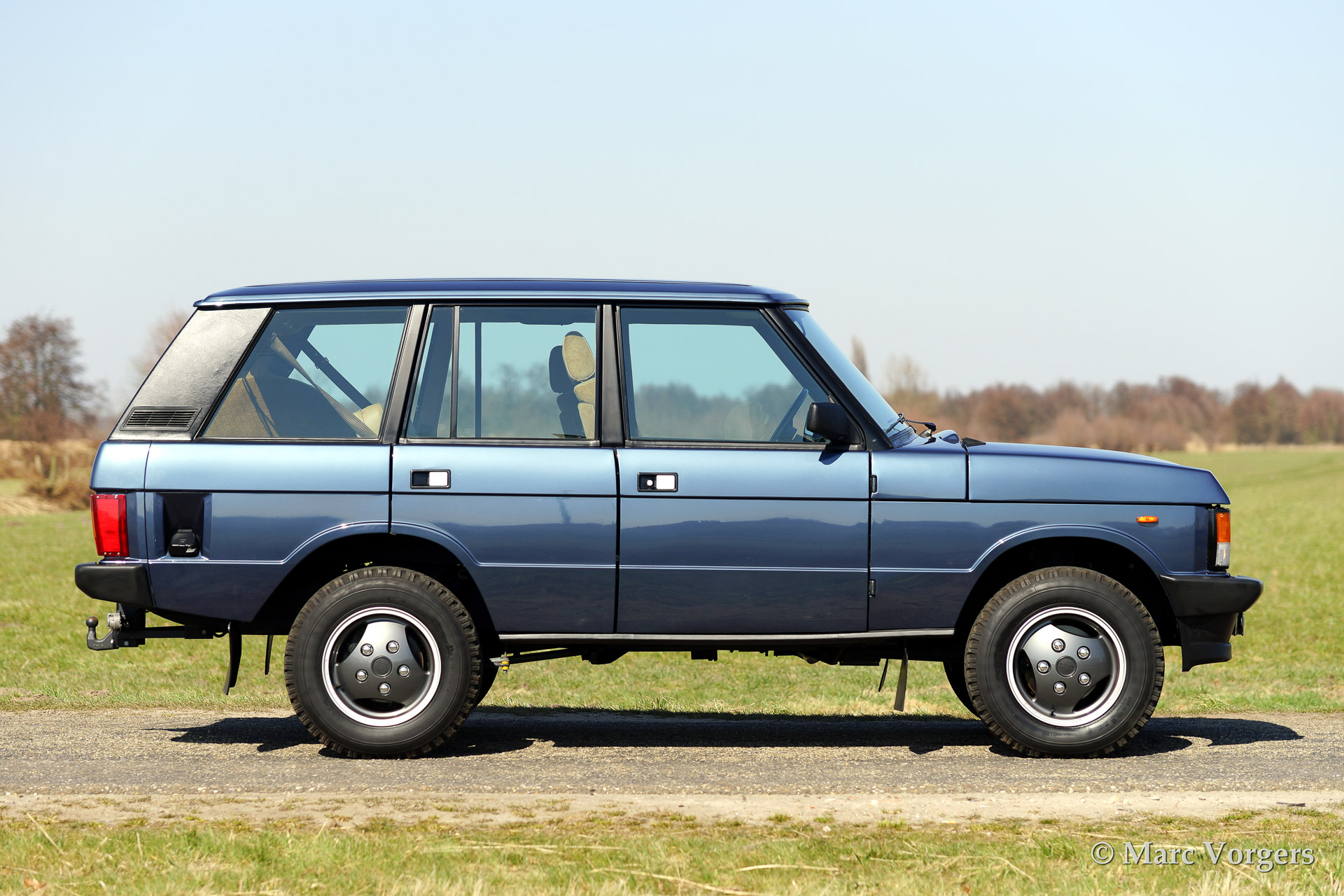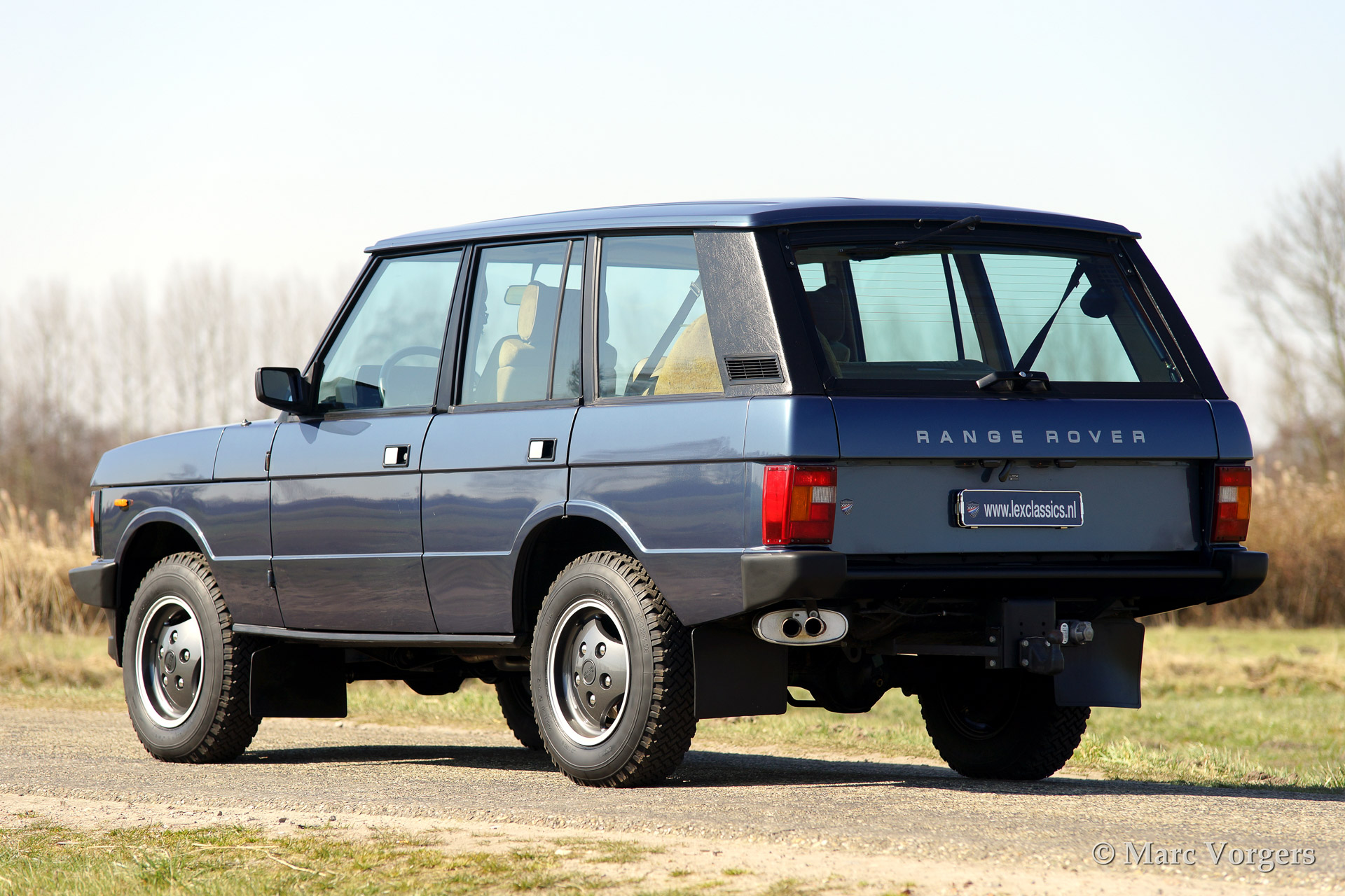 Range Rover classic, year 1988. Colour blue metallic with a beige (tan) 'broque' interior. The car features original Range rover alloy wheels in body colour.