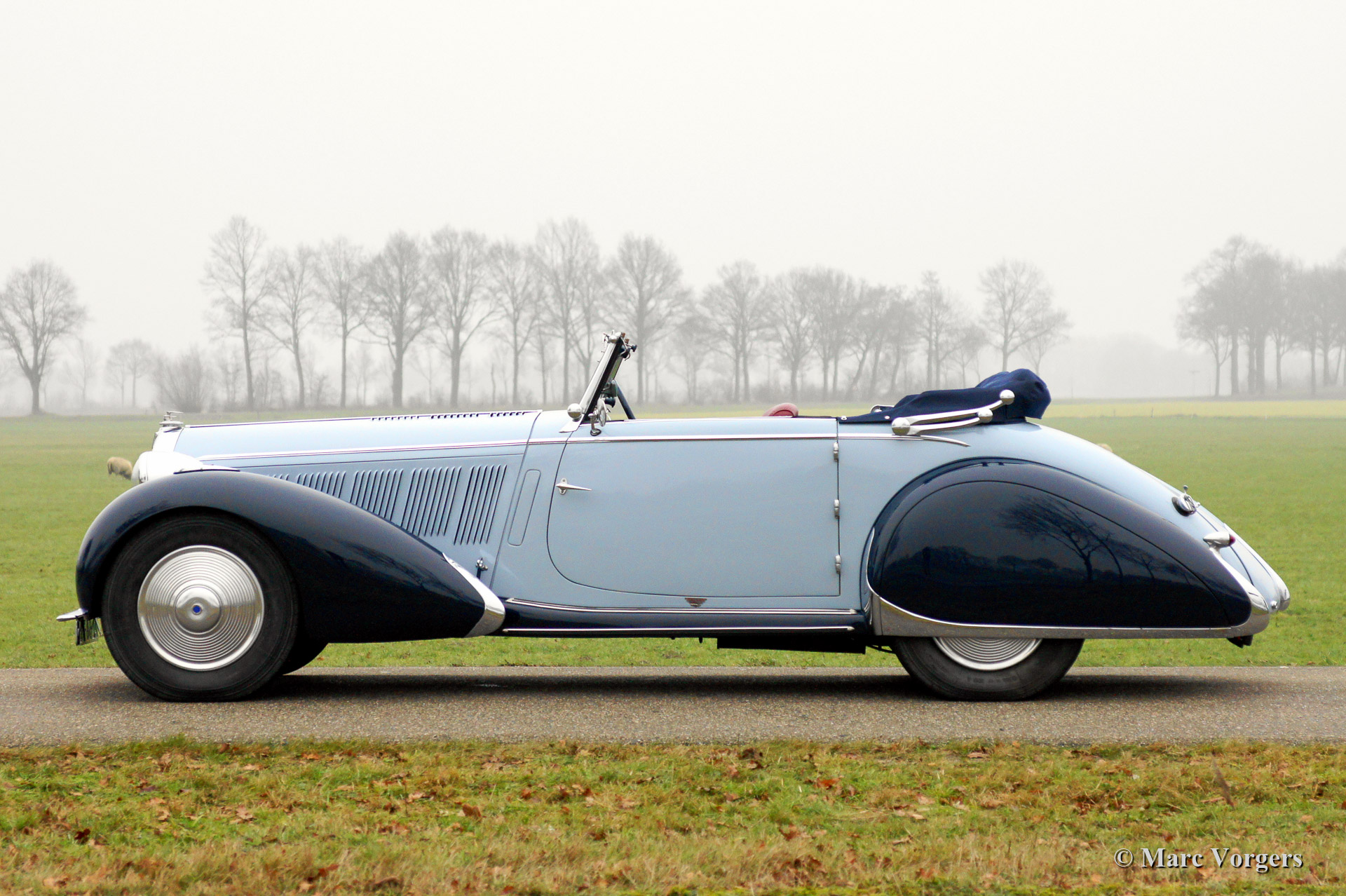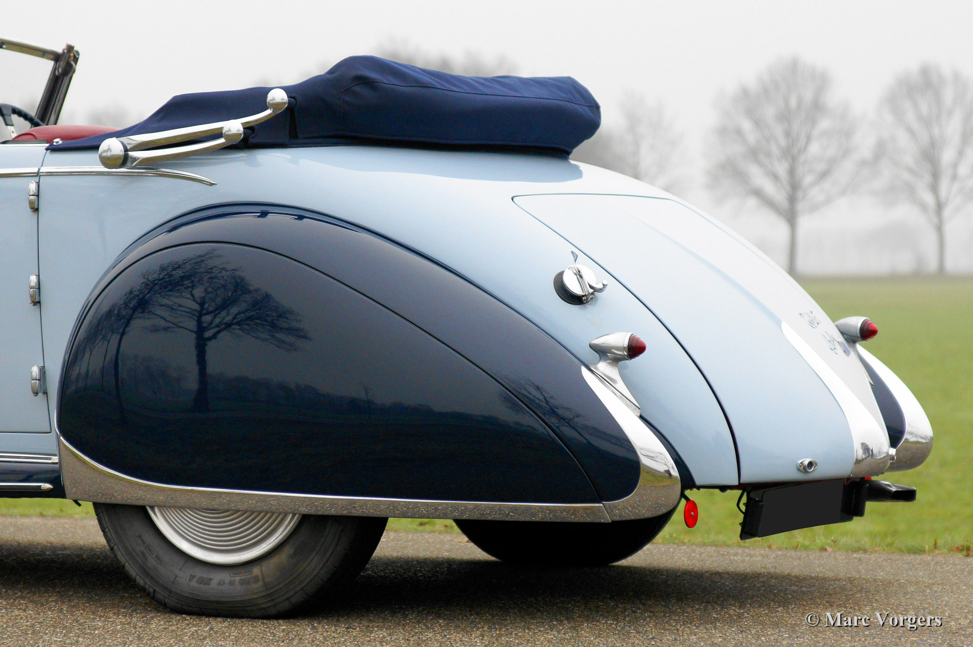 Talbot Lago T23 cabriolet, year 1938. Bodywork design by Figoni and built by Talbot Lago. Colour light blue over dark blue, dark red leather interior and a dark blue convertible hood. This extremely beautiful and scarce Talbot Lago T23 was frame off restored by a specialist over a period of twenty years. It is said that this car was delivered to the renowned French Grand Prix driver Louis Rosier in the year 1938.