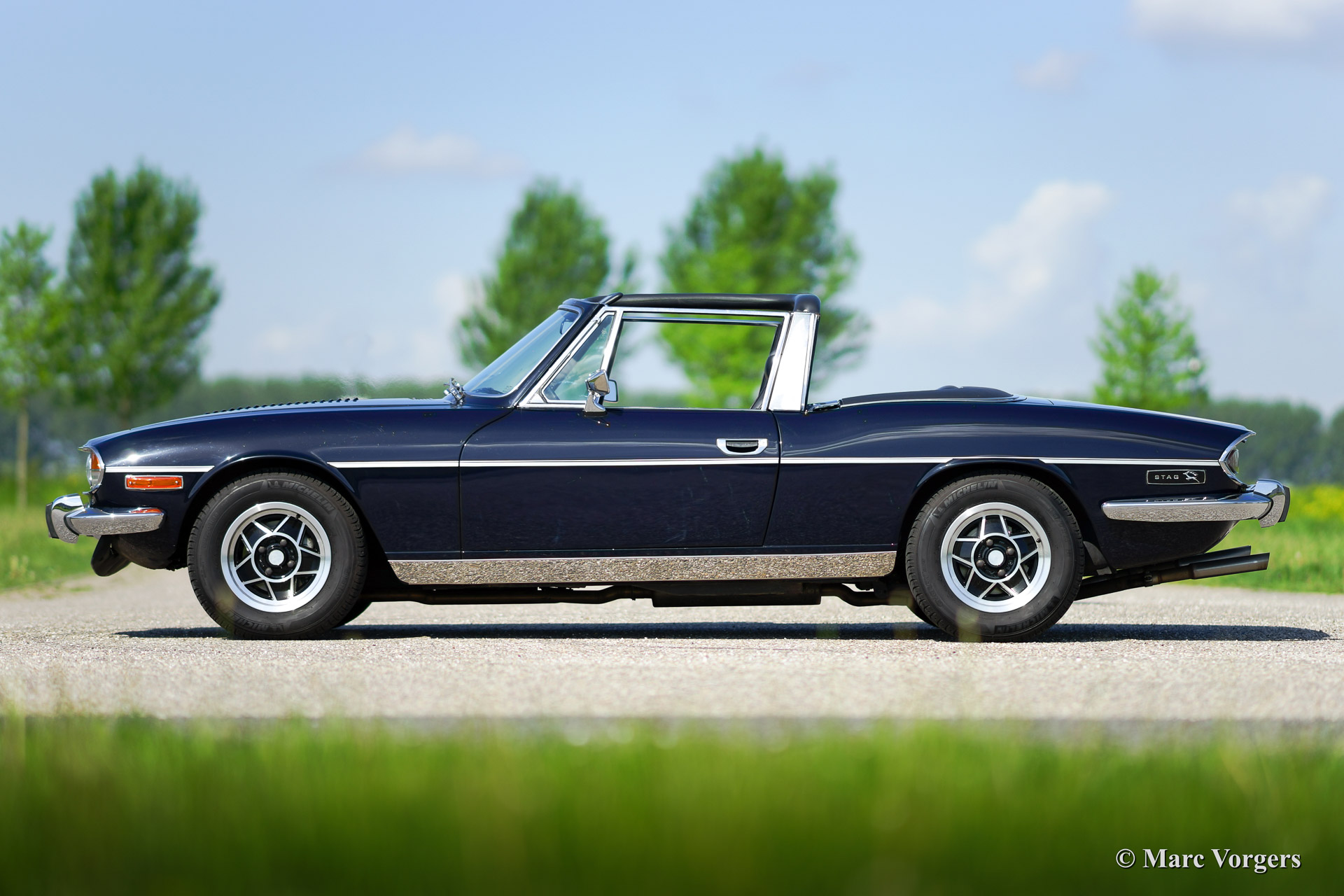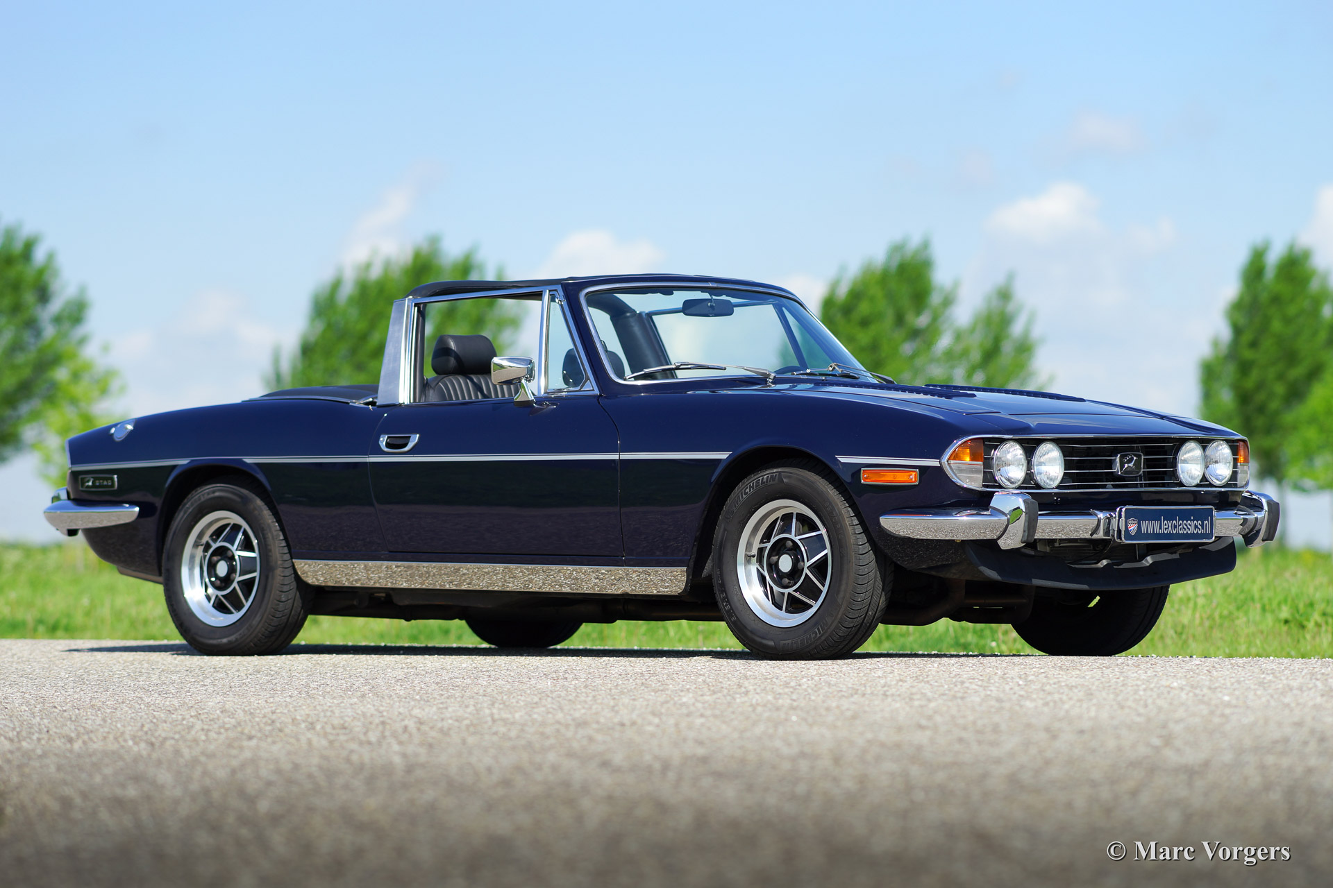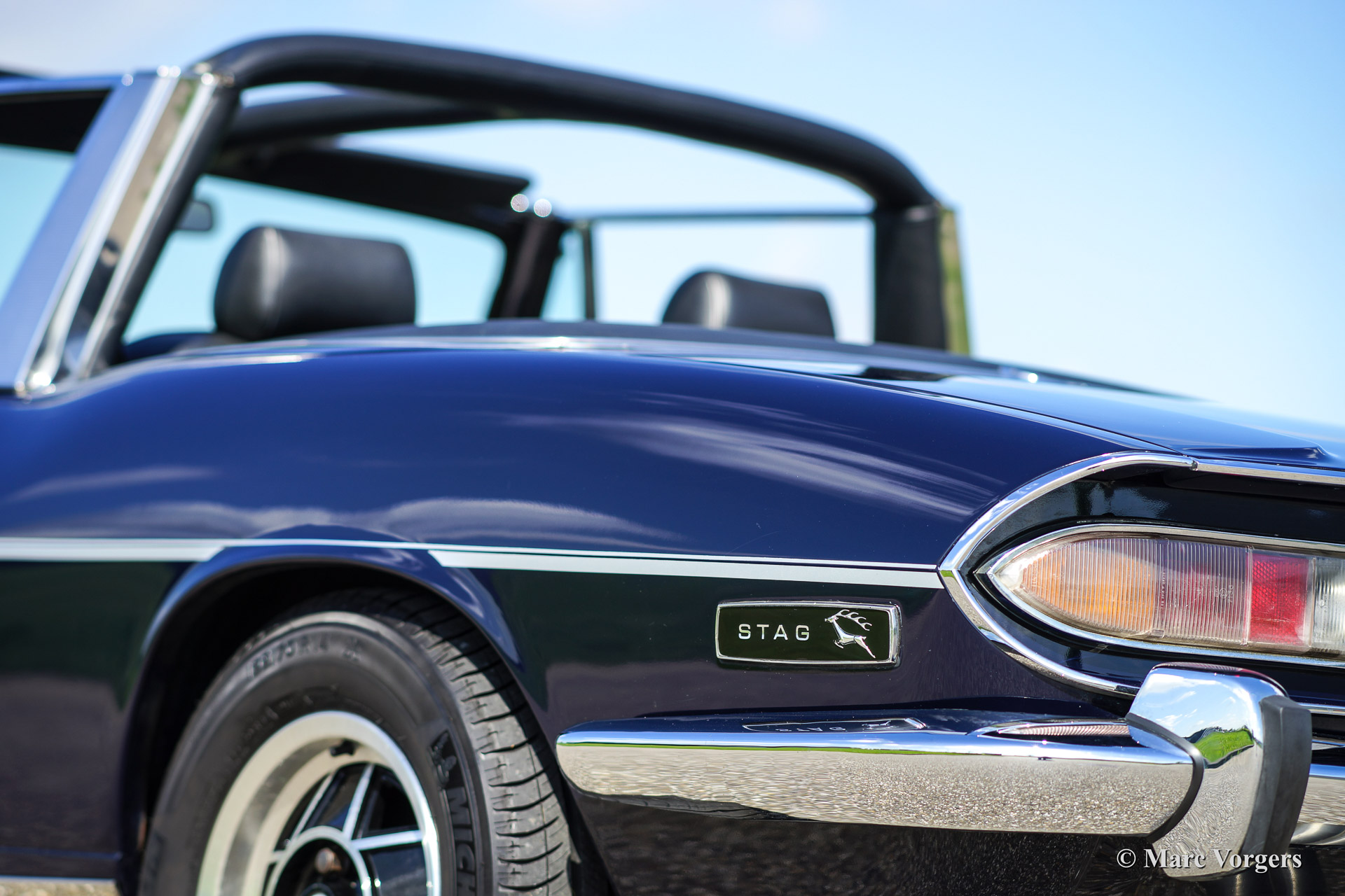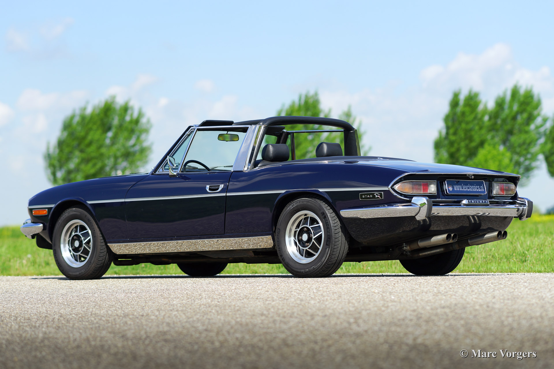The Triumph Stag was presented in the year 1970. The Stag was not the successor of the famous TR range but an entirely new development for the important American market. In the late 1960'ies the safety of convertible models was questioned. For a while it seemed that convertibles and roadster would be banned. The Triumph Stag was designed with a sturdy, T-shape, roll over bar and the Triumph TR 7 was presented as a closed coupe for this reason. Like the TR 4, the Spitfire and many other Triumph models, the Stag was designed by the Italian Michelotti. De Stag was designed as a spacious and luxurious 2+2 touring convertible with a comfortable interior and safety seats. That was not all, Triumph even developed a brand new 3 Litre V8 engine for the Stag! This was quite strange because their British Leyland 'partner' Rover had the ideal V8 engine which was used for the Rover P5B since 1967. The Triumph Stag featured independent suspension and disc brakes all round. Power steering was a standard item. In the USA most Stags were ordered with an automatic gearbox. The story goes that designer Michelotti was 'not very happy' with the safety roll over bar. In his opinion the Stag would have been much better looking without this item. For that Michelotti invested in the design of the steel hard top which compliments the design of the Stag for sure!