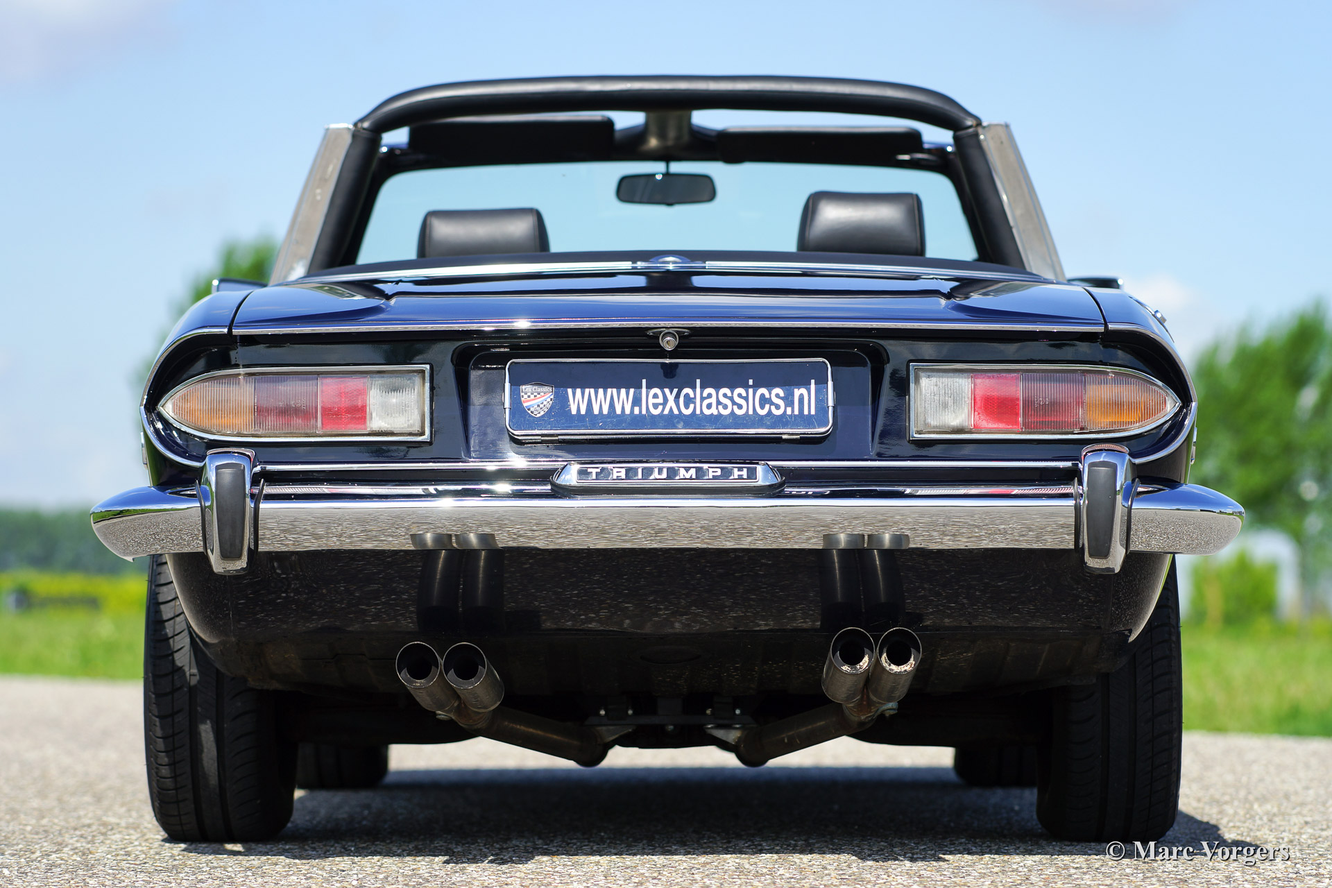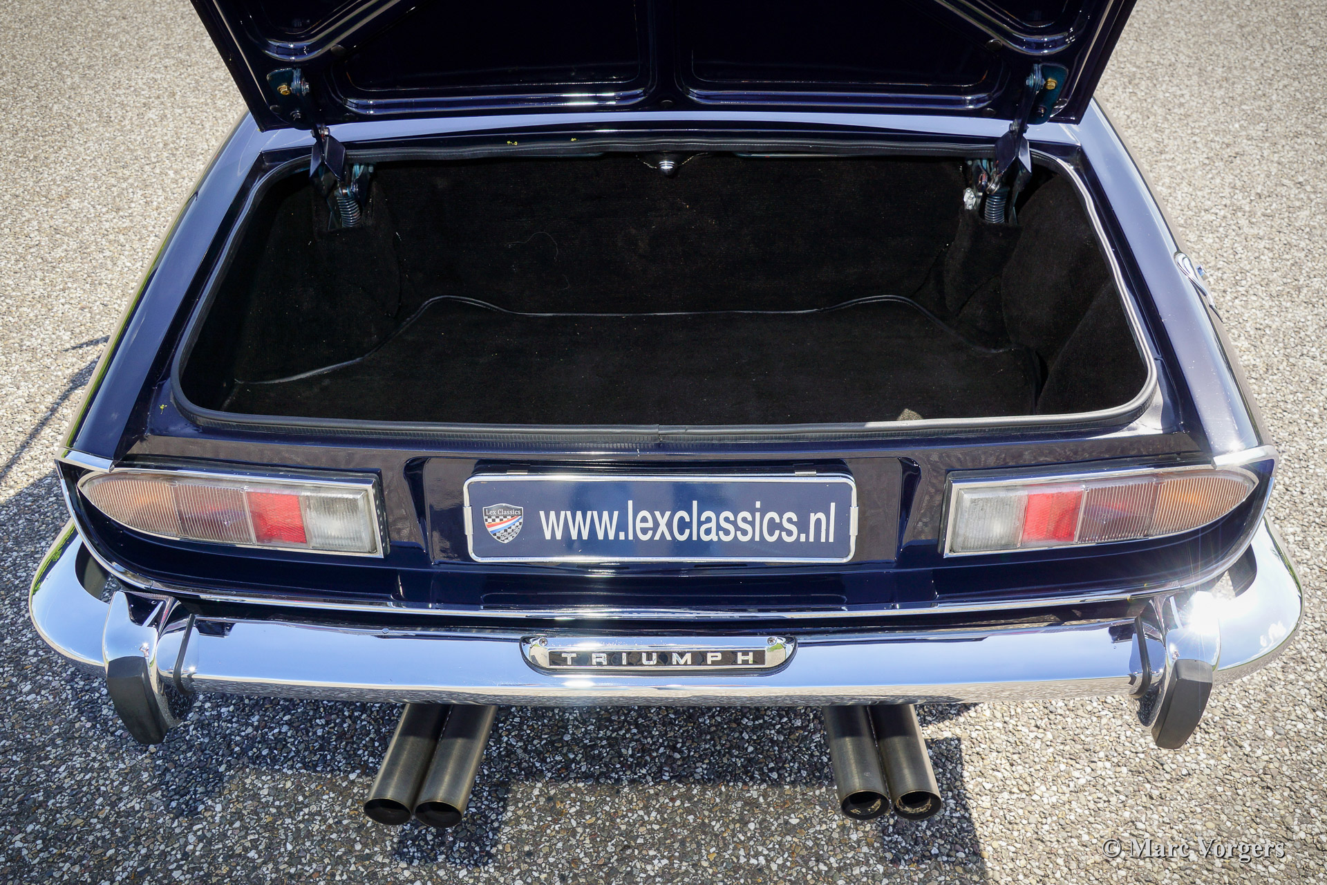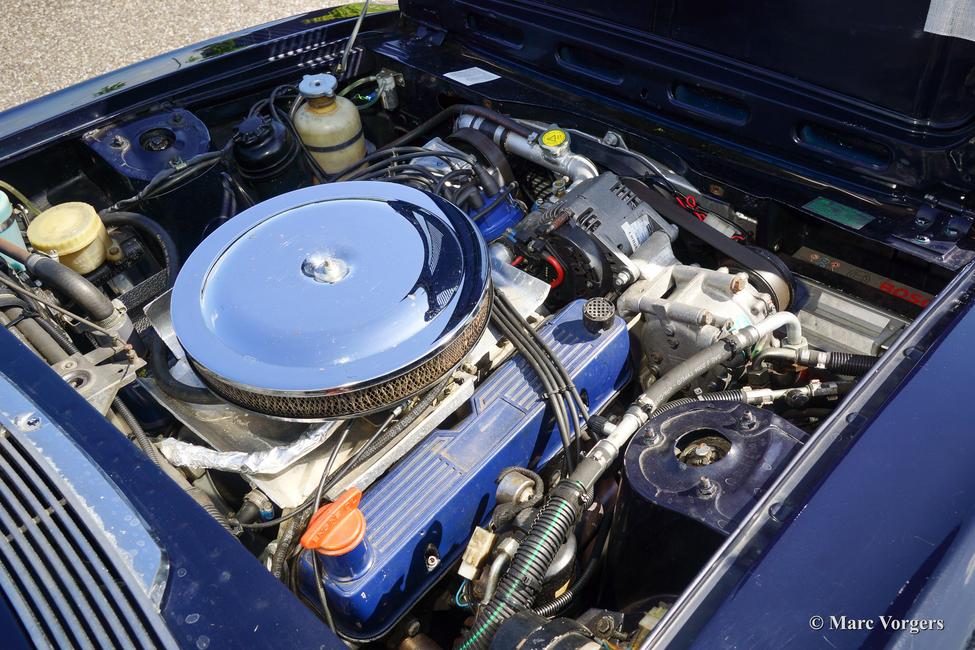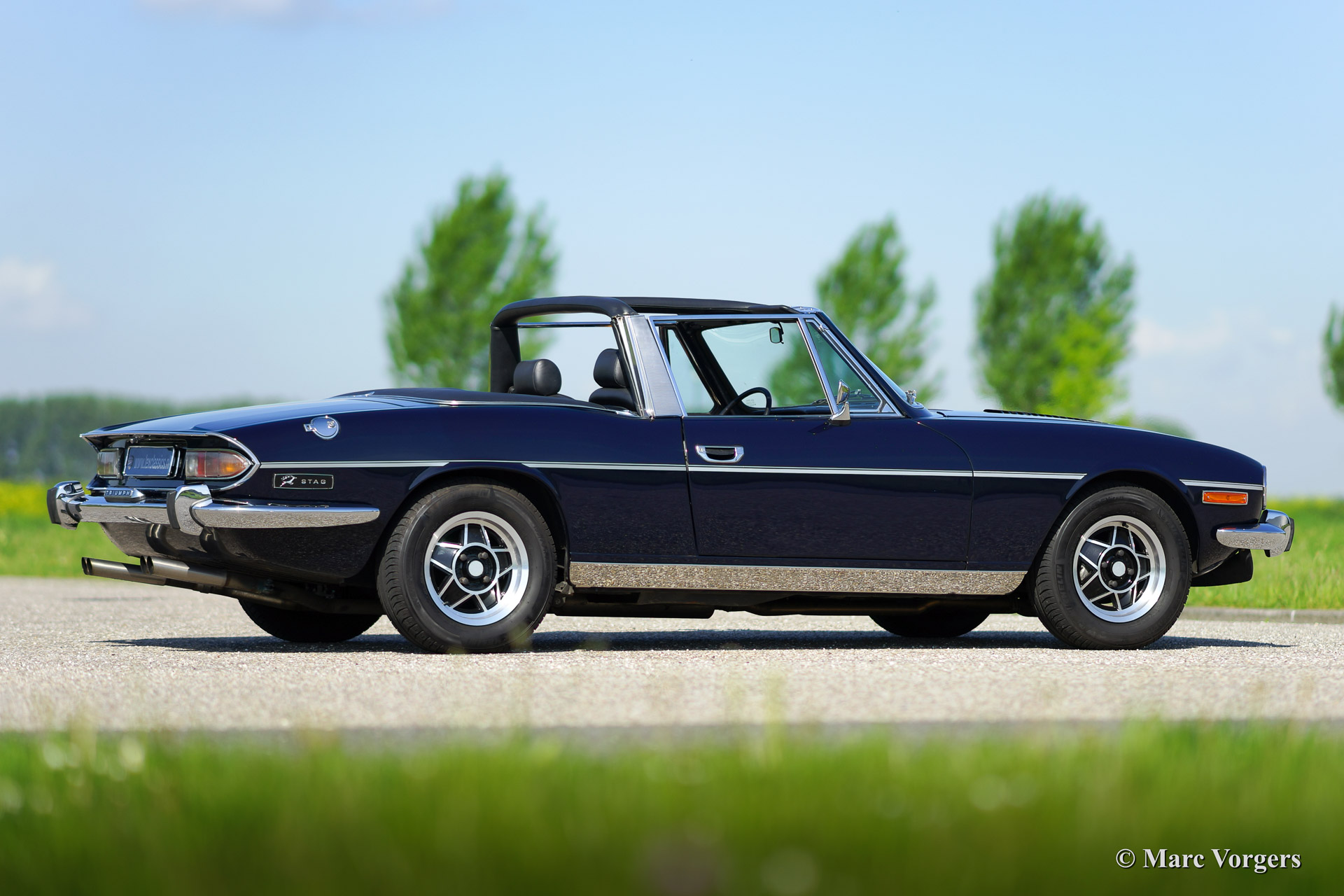The Triumph Stag was presented in the year 1970. The Stag was not the successor of the famous TR range but an entirely new development for the important American market. In the late 1960'ies the safety of convertible models was questioned. For a while it seemed that convertibles and roadster would be banned. The Triumph Stag was designed with a sturdy, T-shape, roll over bar and the Triumph TR 7 was presented as a closed coupe for this reason. Like the TR 4, the Spitfire and many other Triumph models, the Stag was designed by the Italian Michelotti. De Stag was designed as a spacious and luxurious 2+2 touring convertible with a comfortable interior and safety seats. That was not all, Triumph even developed a brand new 3 Litre V8 engine for the Stag! This was quite strange because their British Leyland 'partner' Rover had the ideal V8 engine which was used for the Rover P5B since 1967. The Triumph Stag featured independent suspension and disc brakes all round. Power steering was a standard item. In the USA most Stags were ordered with an automatic gearbox. The story goes that designer Michelotti was 'not very happy' with the safety roll over bar. In his opinion the Stag would have been much better looking without this item. For that Michelotti invested in the design of the steel hard top which compliments the design of the Stag for sure!