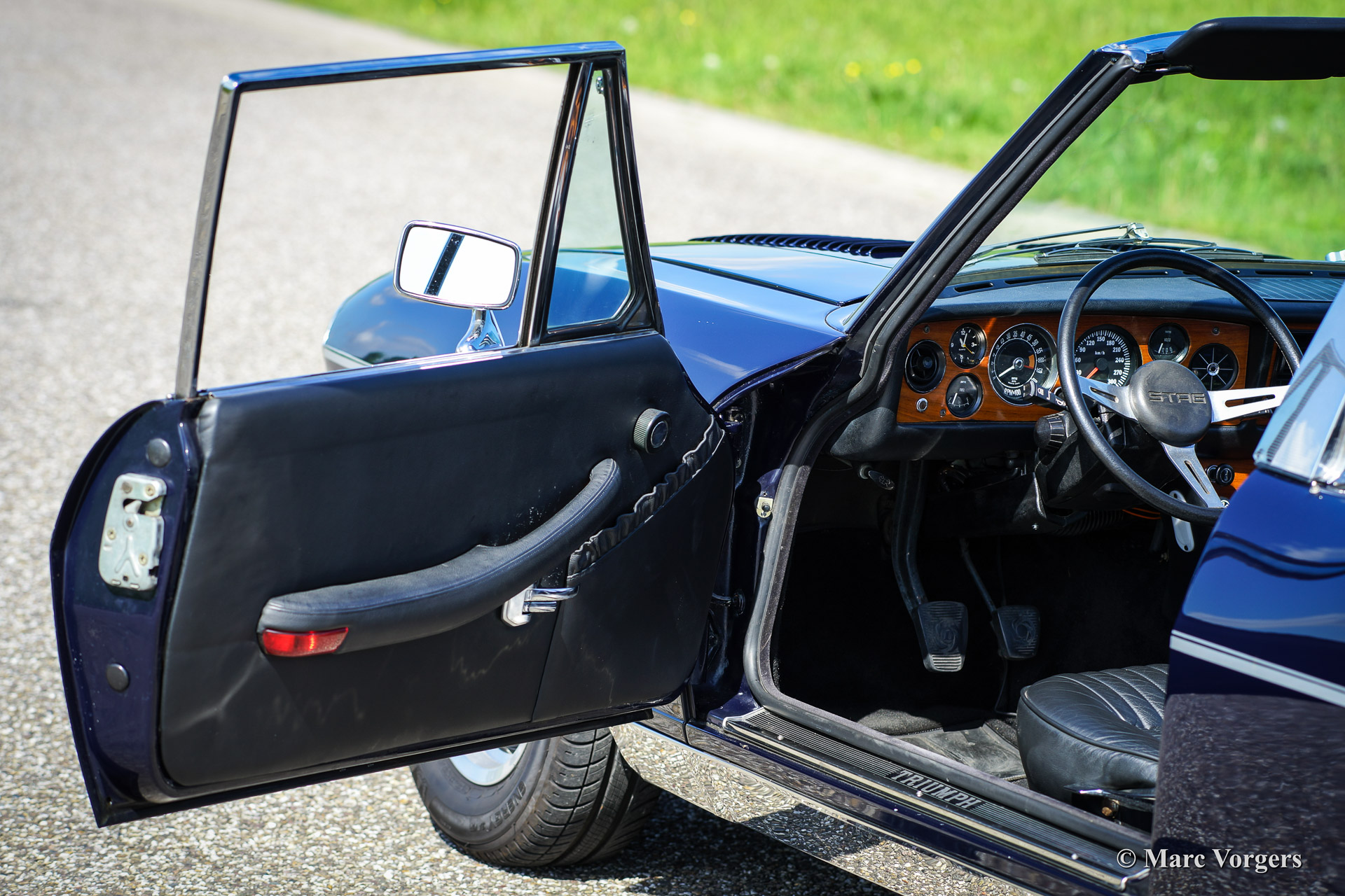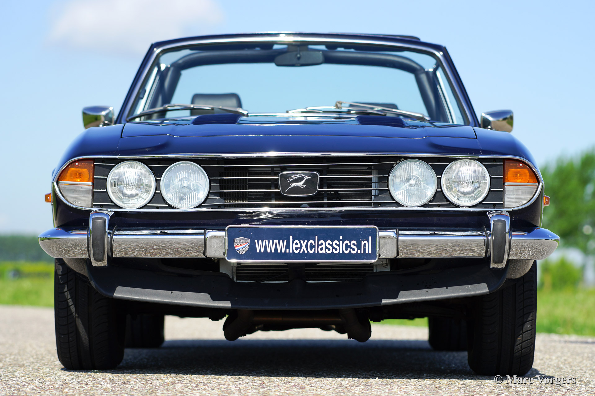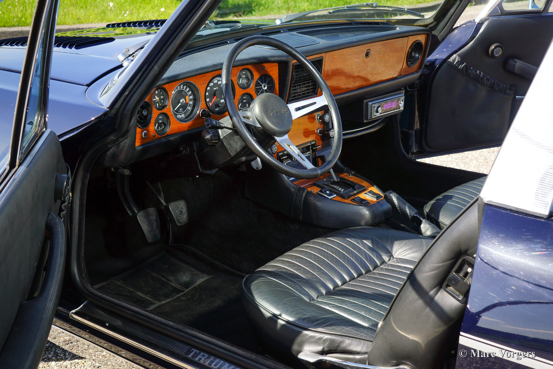 Triumph Stag, année 1971. Numéro de châssis LD916XXX. Couleur extérieure bleu foncé, intérieur en cuir noir avec tapis noir. Capote noire. Cette formidable Trumph Stag a été vendue neuve dans le Pays-Bas. L'automobile a été entretenu et maintenu magnifiquement et la voiture est en très bonne ou en excellente condition. La voiture roule superbement et la note d'échappement est vraiment addictif!