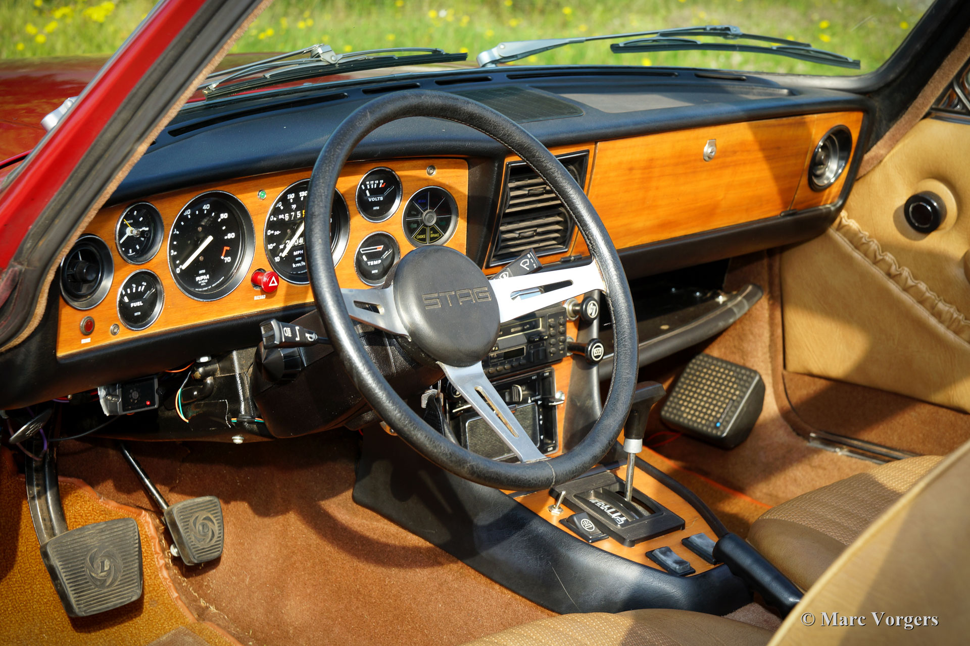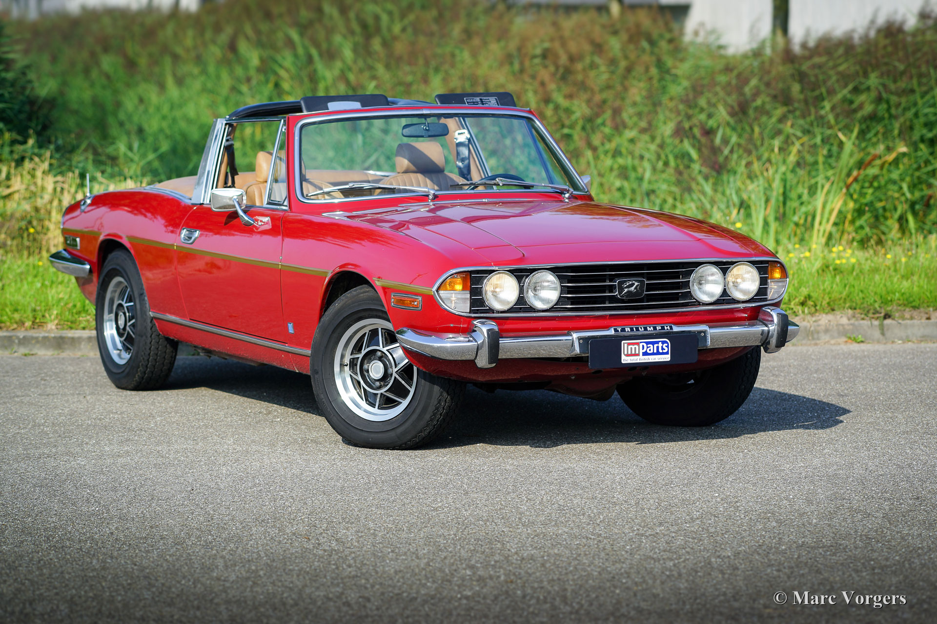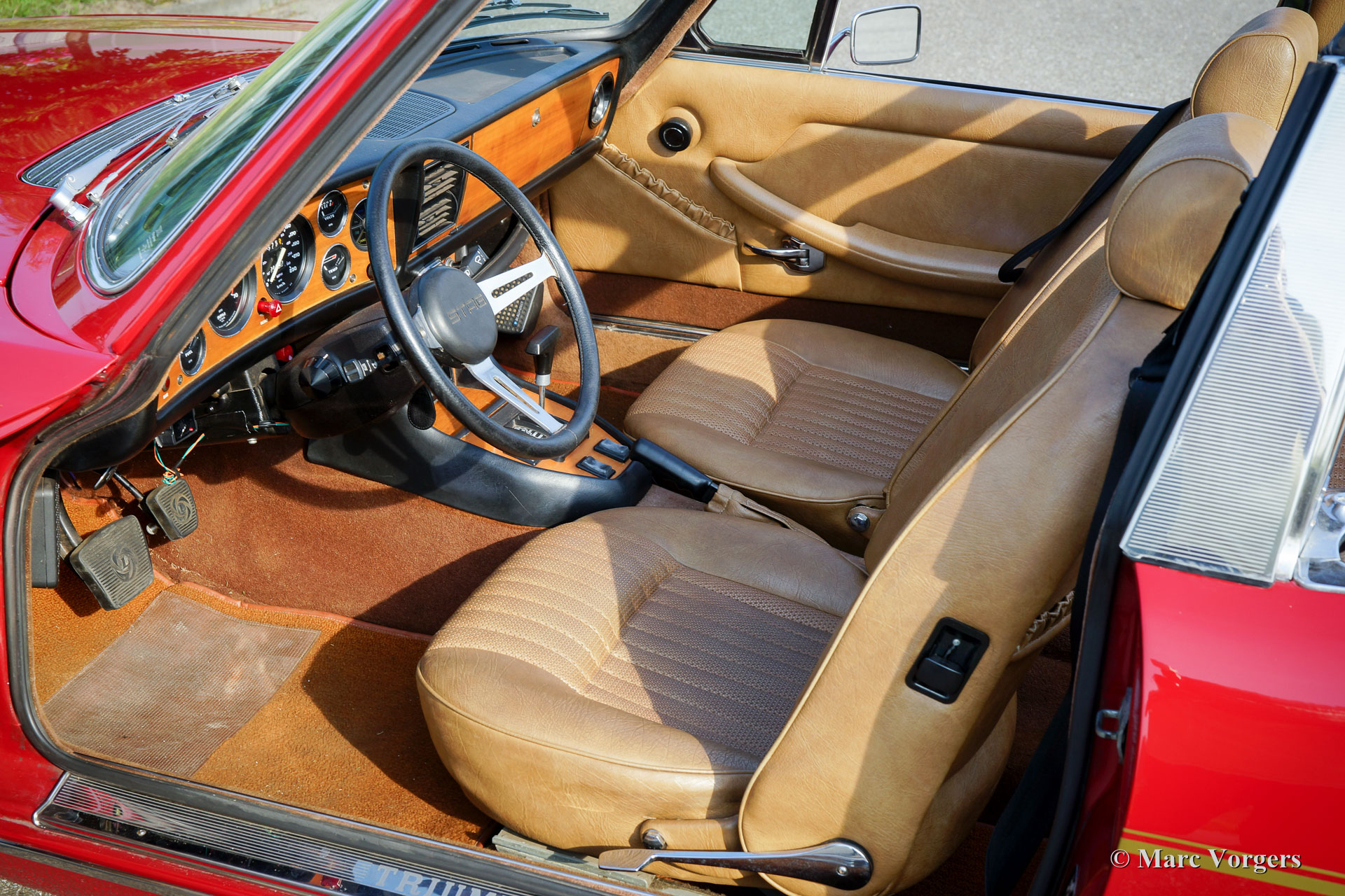 Triumph Stag, année 1975. Couleur rouge foncé (Carmine Red) avec un intérieur en cuir artificiel beige et un capot noir. Ce fantastique Triumph Stag est en très bon état et très original ! La voiture affiche tous les détails originaux. La carrosserie fut dotée d'une nouvelle peinture de la couleur d'origine il y a quelques années et l'intérieur est entièrement original et en parfait état ! Le moteur original Triumph V8 de 3 litres fut rajouté par l'installation d'un réservoir d’expansion pour le système de refroidissement, d'un ventilateur de refroidissement électrique supplémentaire, d'un refroidisseur d'huile et d'un manomètre à huile. La voiture est équipée en usine de la direction assistée, des freins asservis, des fenêtres commandées électrique et d'une boîte de vitesses automatique. En outre, sont équipés d'un échappement en acier inoxydable et des arbres de transmission des liaisons homocinétiques (durabilité améliorée). L'intérieur 2 + 2 est assez spacieux et offre suffisamment de place pour une famille avec deux grands enfants ou jeunes adultes. Récemment, quatre nouvelles roues ont été montées et équipées de pneus Vredestein (185-14). C'est un cabriolet anglais spacieux, pratique et confortable en très bon état et avec une très belle note d'échappement !