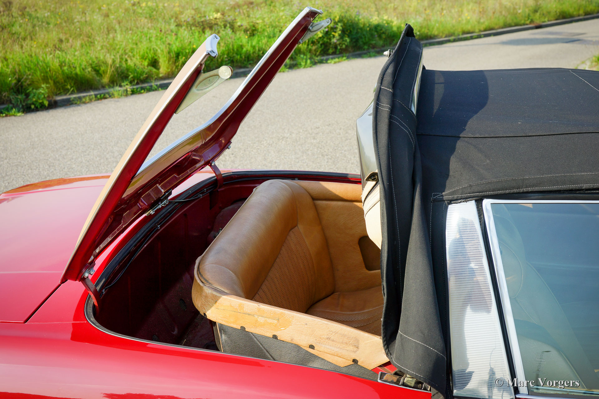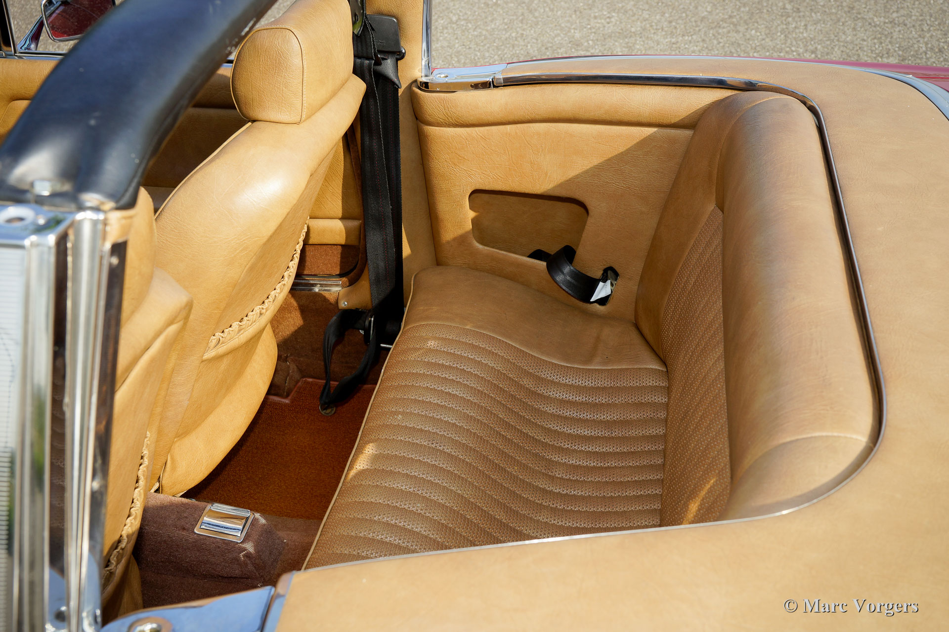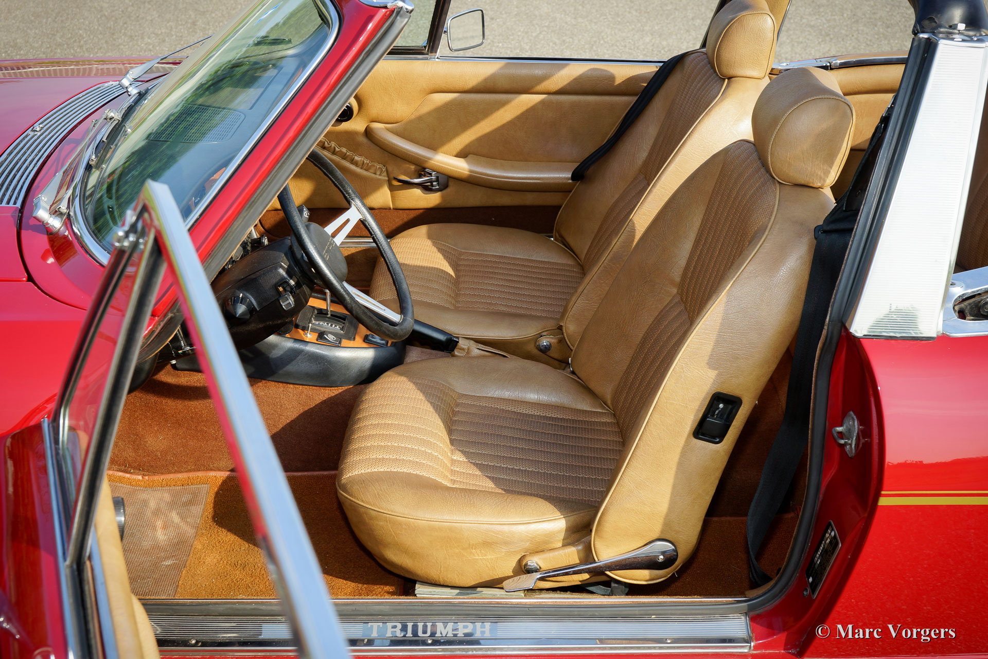 Triumph Stag, année 1975. Couleur rouge foncé (Carmine Red) avec un intérieur en cuir artificiel beige et un capot noir. Ce fantastique Triumph Stag est en très bon état et très original ! La voiture affiche tous les détails originaux. La carrosserie fut dotée d'une nouvelle peinture de la couleur d'origine il y a quelques années et l'intérieur est entièrement original et en parfait état ! Le moteur original Triumph V8 de 3 litres fut rajouté par l'installation d'un réservoir d’expansion pour le système de refroidissement, d'un ventilateur de refroidissement électrique supplémentaire, d'un refroidisseur d'huile et d'un manomètre à huile. La voiture est équipée en usine de la direction assistée, des freins asservis, des fenêtres commandées électrique et d'une boîte de vitesses automatique. En outre, sont équipés d'un échappement en acier inoxydable et des arbres de transmission des liaisons homocinétiques (durabilité améliorée). L'intérieur 2 + 2 est assez spacieux et offre suffisamment de place pour une famille avec deux grands enfants ou jeunes adultes. Récemment, quatre nouvelles roues ont été montées et équipées de pneus Vredestein (185-14). C'est un cabriolet anglais spacieux, pratique et confortable en très bon état et avec une très belle note d'échappement !