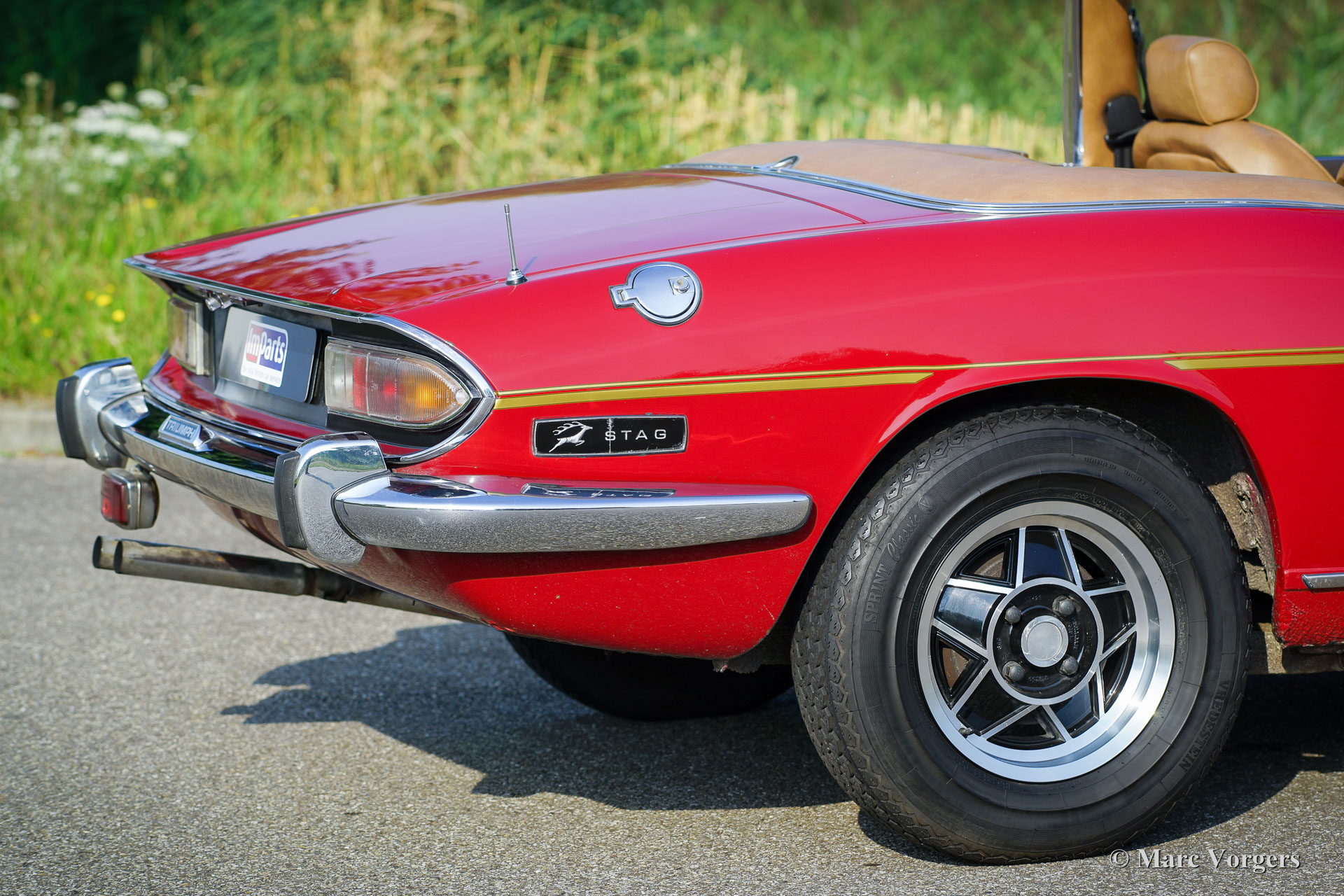 The Triumph Stag was presented in the year 1970. The Stag was not the successor of the famous TR range but an entirely new development for the important American market. In the late 1960'ies the safety of convertible models was questioned. For a while it seemed that convertibles and roadster would be banned. The Triumph Stag was designed with a sturdy, T-shape, roll over bar and the Triumph TR 7 was presented as a closed coupe for this reason. Like the TR 4, the Spitfire and many other Triumph models, the Stag was designed by the Italian Michelotti. De Stag was designed as a spacious and luxurious 2+2 touring convertible with a comfortable interior and safety seats. That was not all, Triumph even developed a brand new 3 Litre V8 engine for the Stag! This was quite strange because their British Leyland 'partner' Rover had the ideal V8 engine which was used for the Rover P5B since 1967. The Triumph Stag featured independent suspension and disc brakes all round. Power steering was a standard item. In the USA most Stags were ordered with an automatic gearbox. The story goes that designer Michelotti was 'not very happy' with the safety roll over bar. In his opinion the Stag would have been much better looking without this item. For that Michelotti invested in the design of the steel hard top which compliments the design of the Stag for sure!