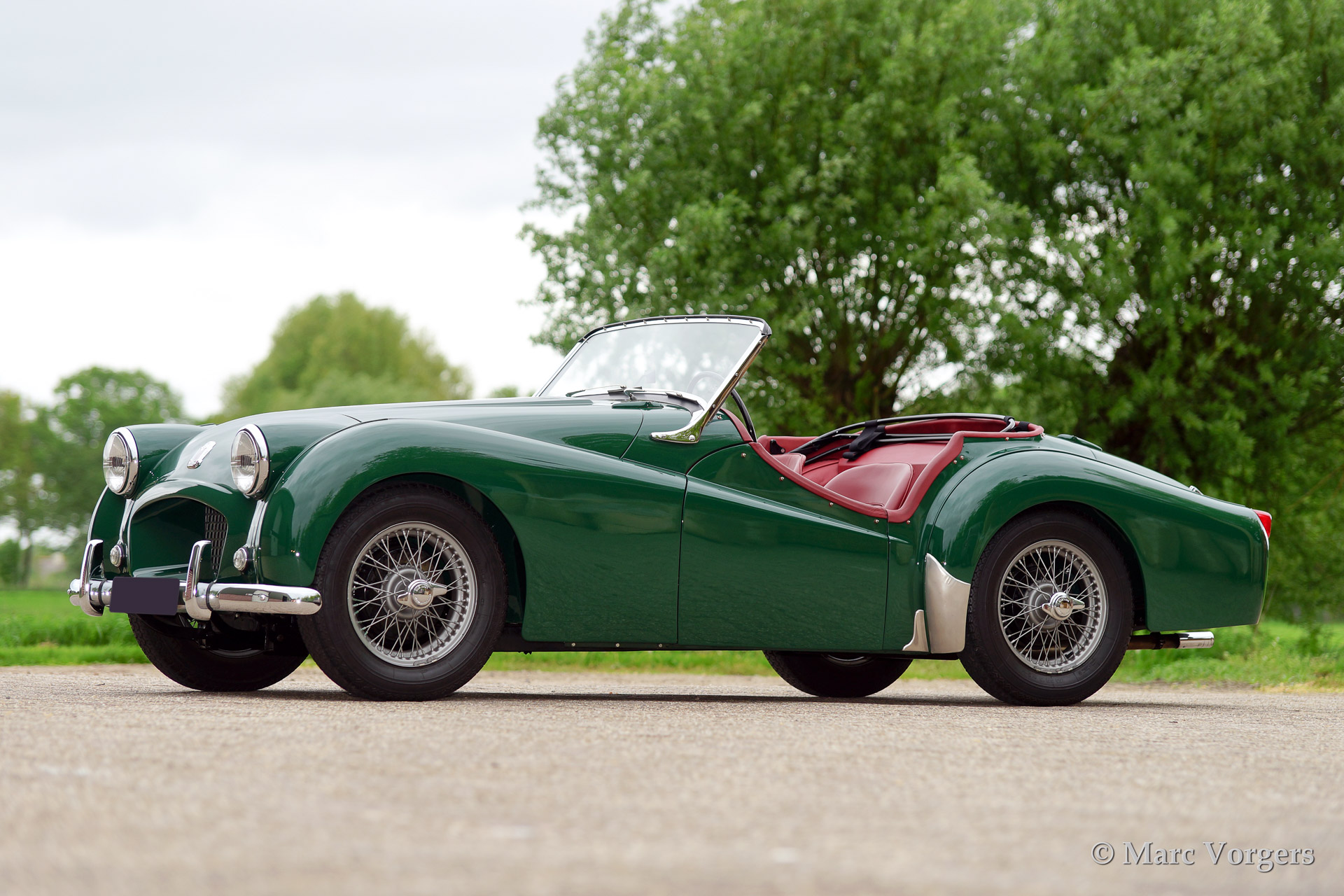 Triumph TR 2 'long door', year 1954. Colour green with a red leather interior. Black hood and side screens. This fantastic Triumph TR 2 was extensively and beautifully restored to original specifications, concours! This is an early and rare TR 2 'long door' model.