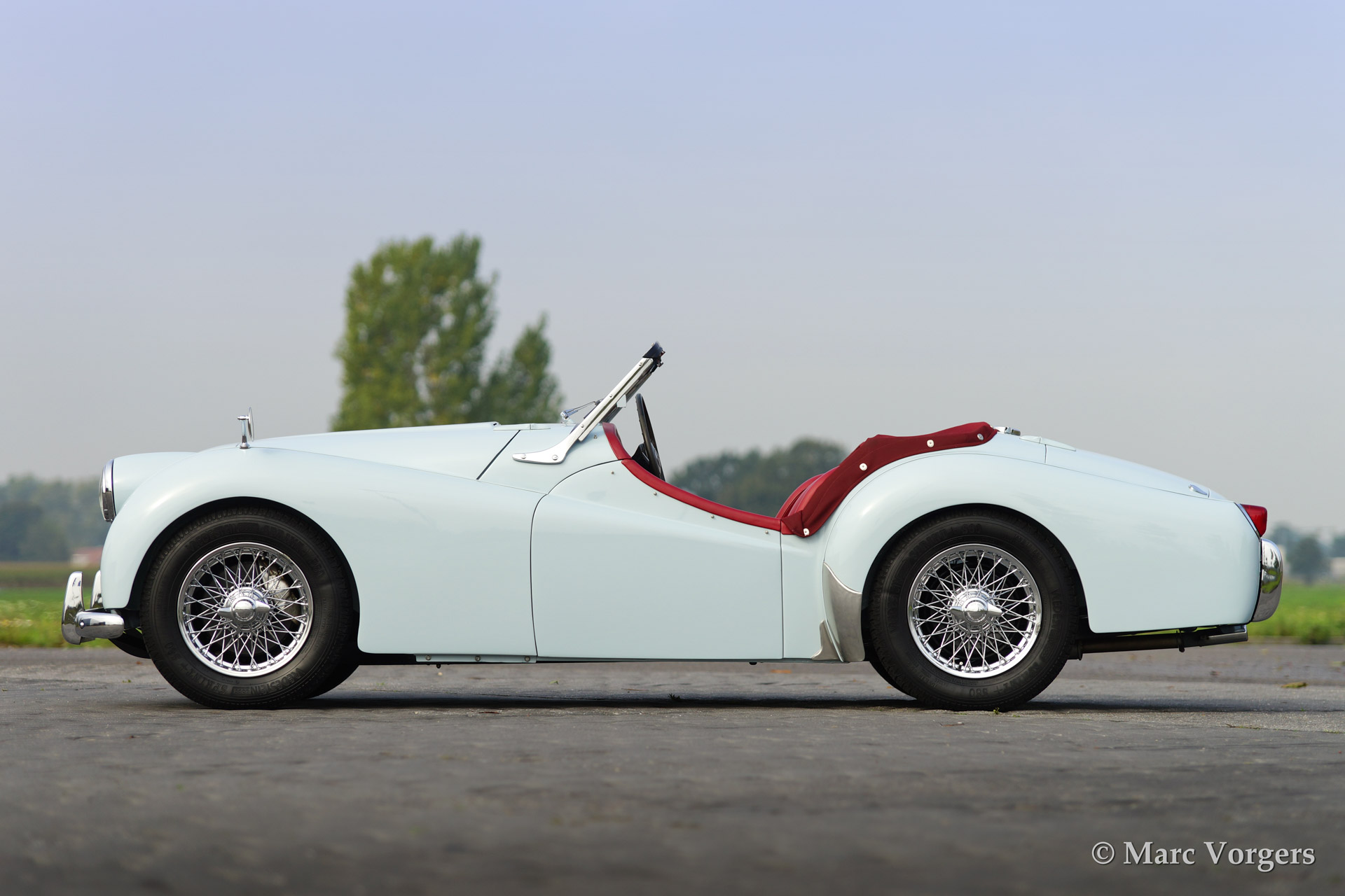 Triumph TR 2 'long door', year 1954. Colour Ice Blue with a red leather interior. Dark red hood and side screens. This tremendous Triumph TR 2 was extensively and beautifully restored to original specifications. The automobile is in concours (show) condition. The 'long door' model is the first ever produced TR 2 model. This very fine TR 2 features chrome wire wheels, tonneau cover and overdrive.