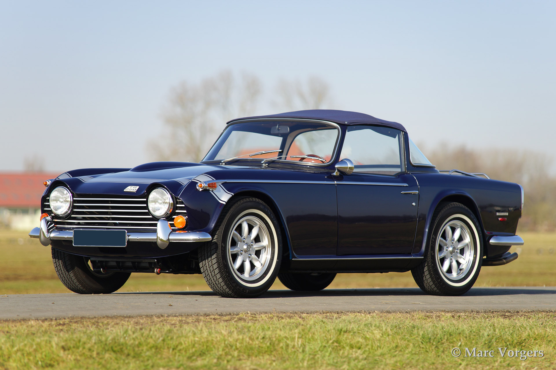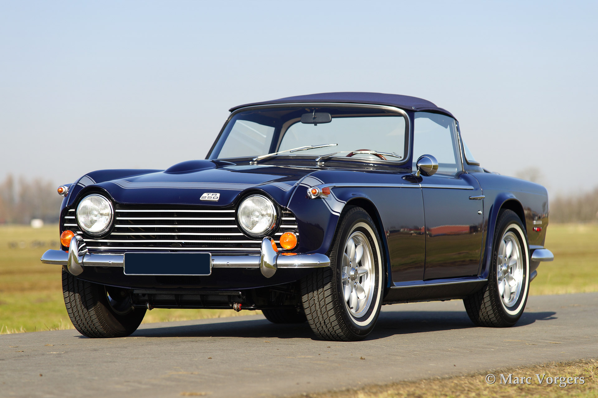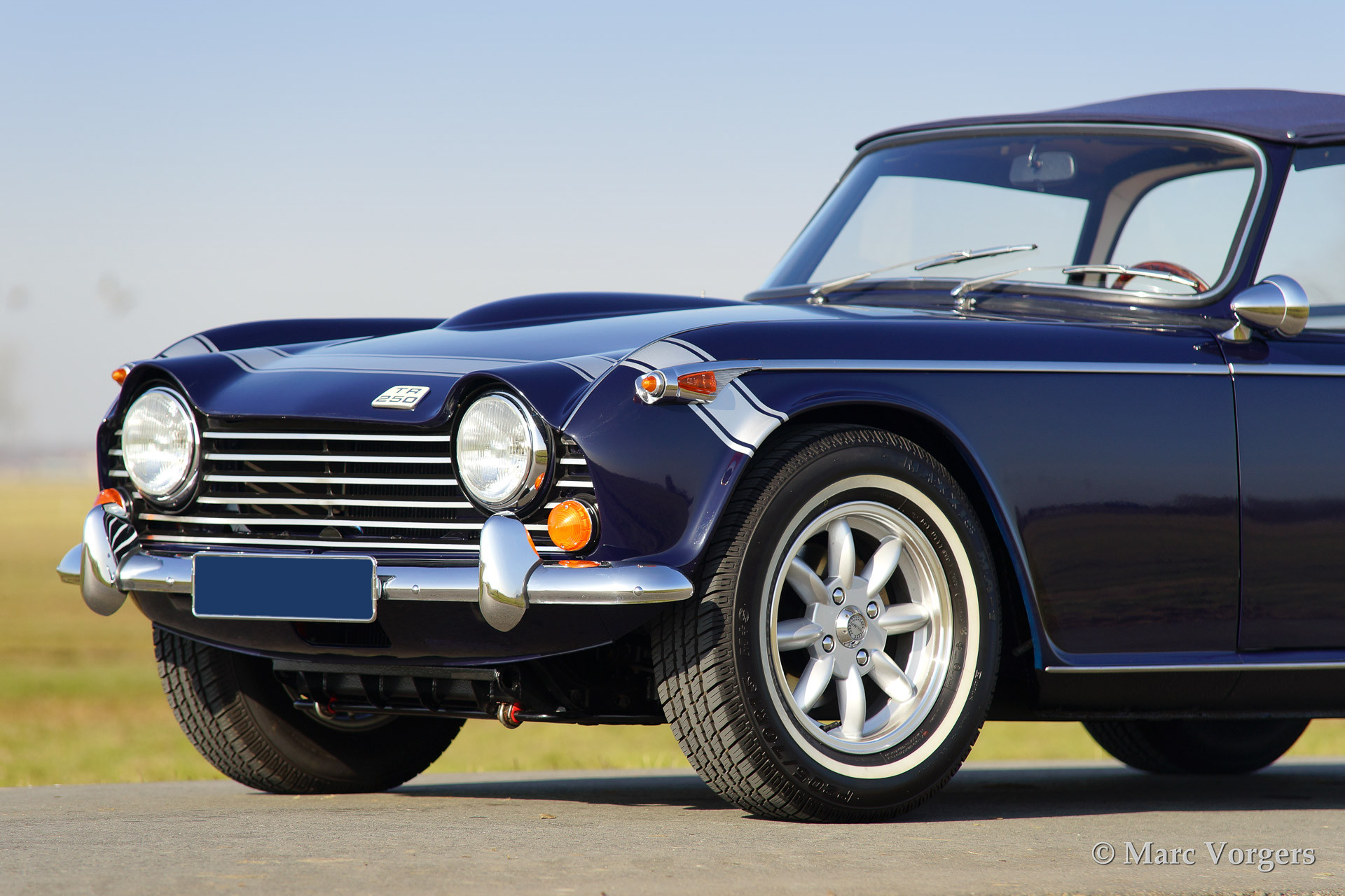 Triumph TR 250, year 1968. Colour dark blue with silver striping on the bonnet (original option). Biege leather interior and a blue Surrey top with blue mohair folding roof. Silver Minilite style wheels with 'knock off' wheel nuts.