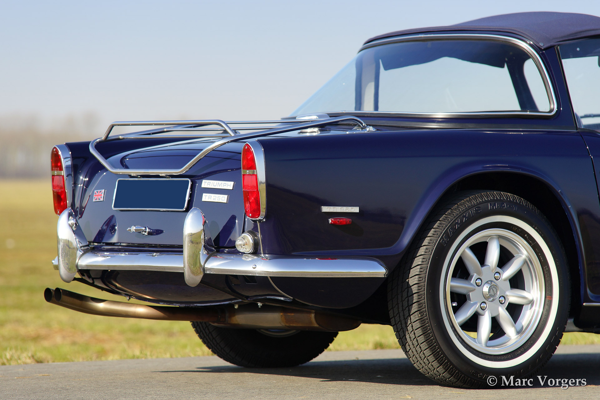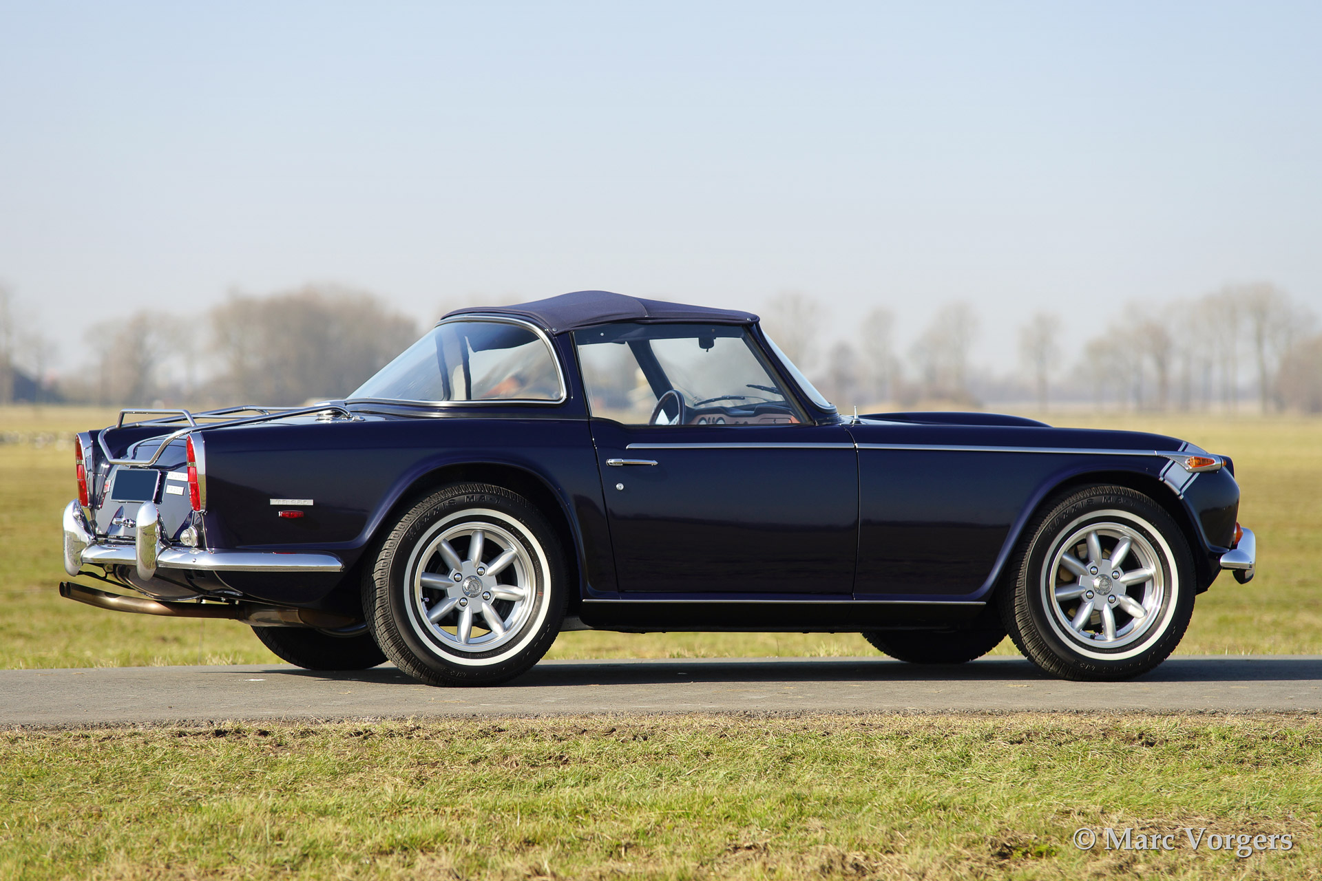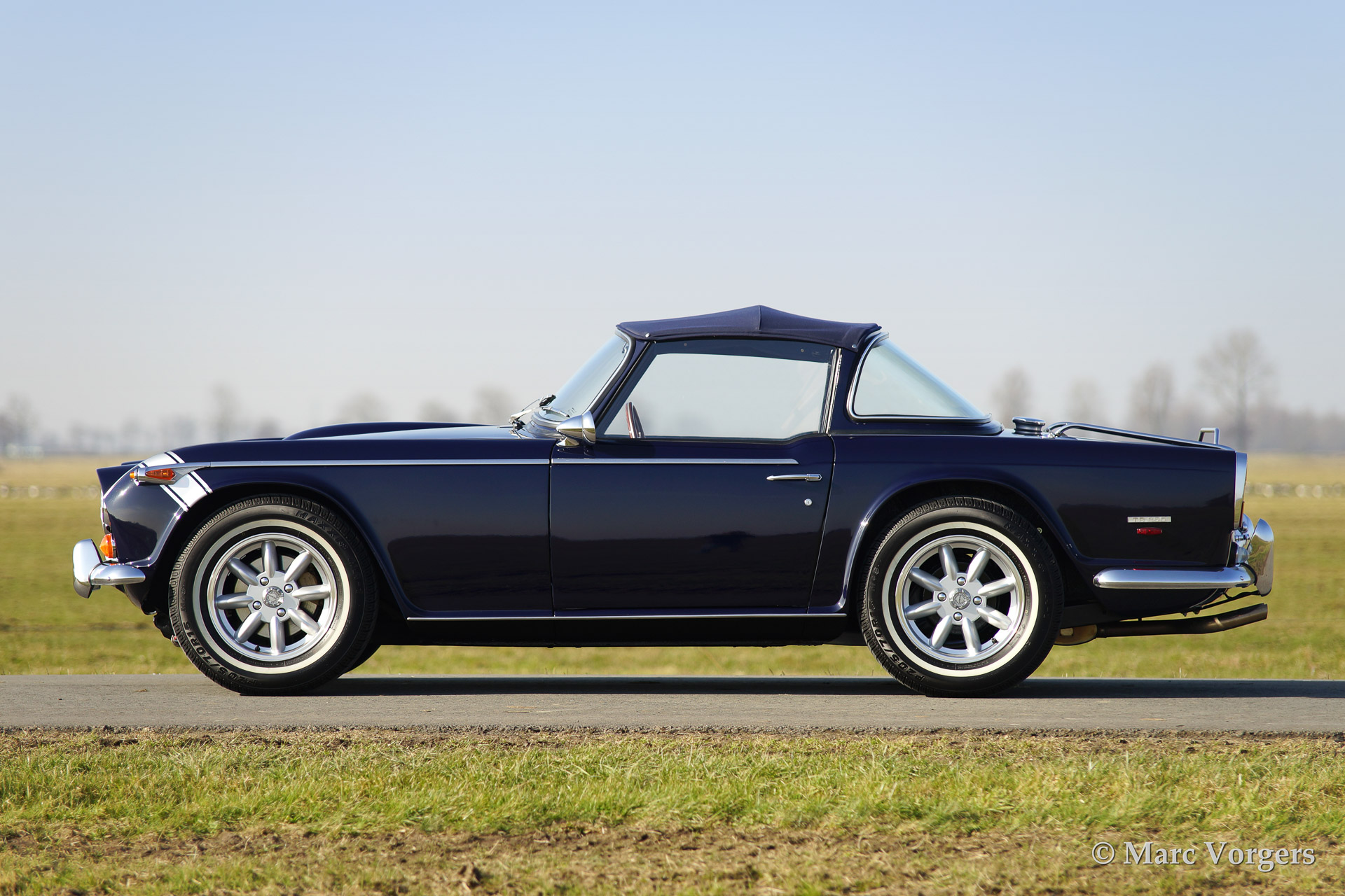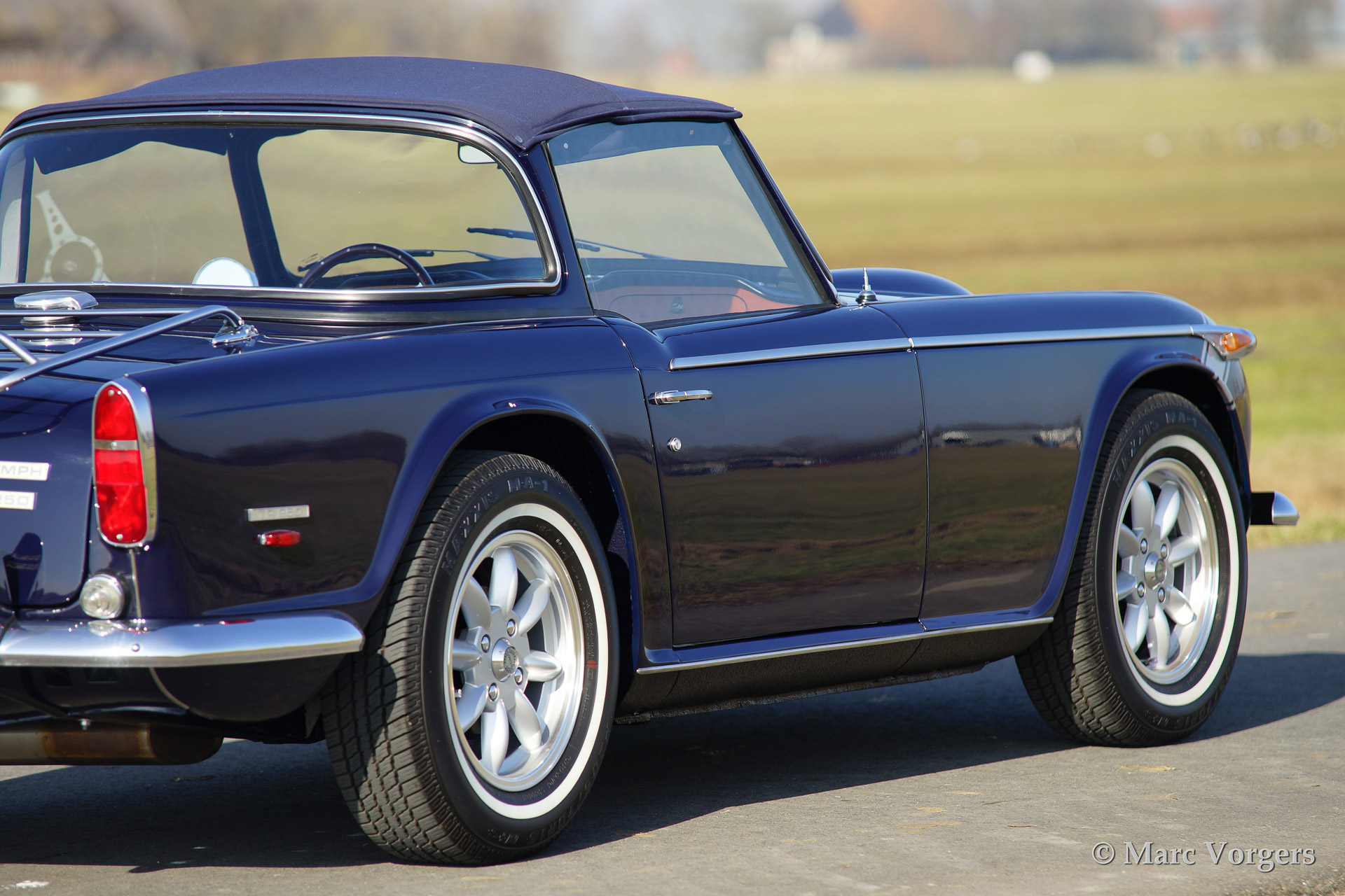 Triumph TR 250, year 1968. Colour dark blue with silver striping on the bonnet (original option). Biege leather interior and a blue Surrey top with blue mohair folding roof. Silver Minilite style wheels with 'knock off' wheel nuts.