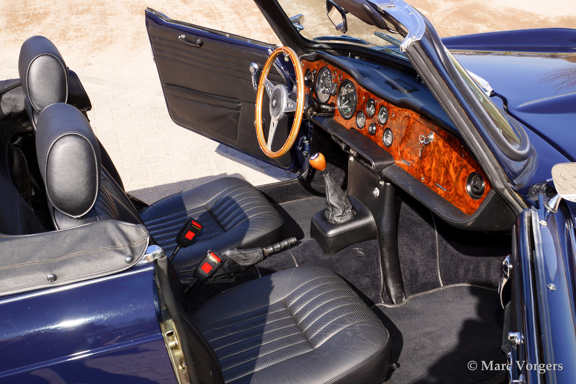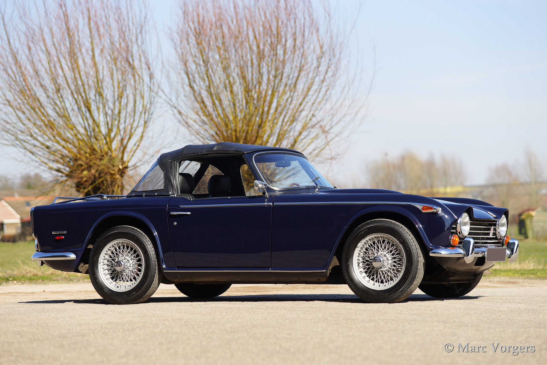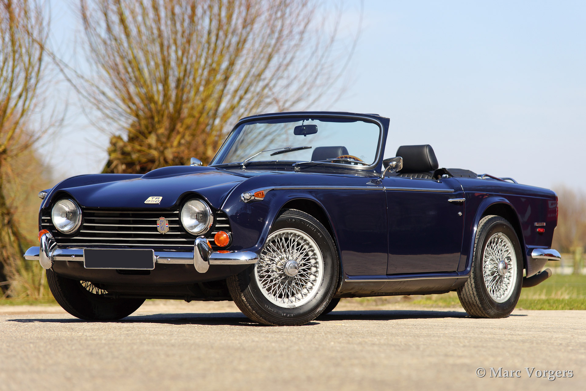 Triumph TR 250, year 1968. Colour dark blue with a black leather interior and black carpet. Black soft top and hood cover. This car features overdrive, special comfortable leather seats (mounted further backwards to create additional knee space for taller drivers), walnut dashboard, steering wheel with wooden rim, wire wheels, chrome luggage rack, aluminium rocker cover, a Stainless Steel exhaust and K&N sports air-filters.