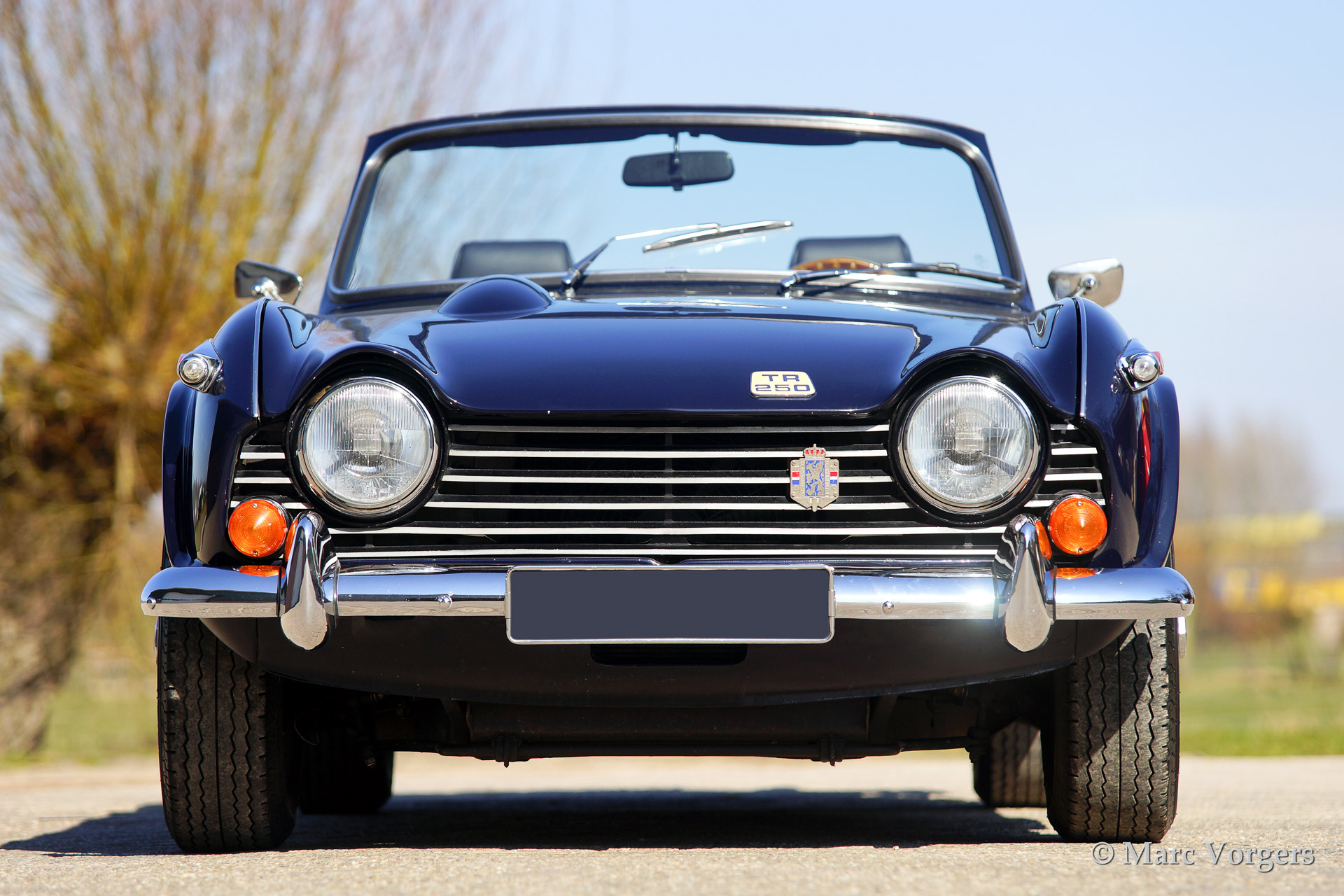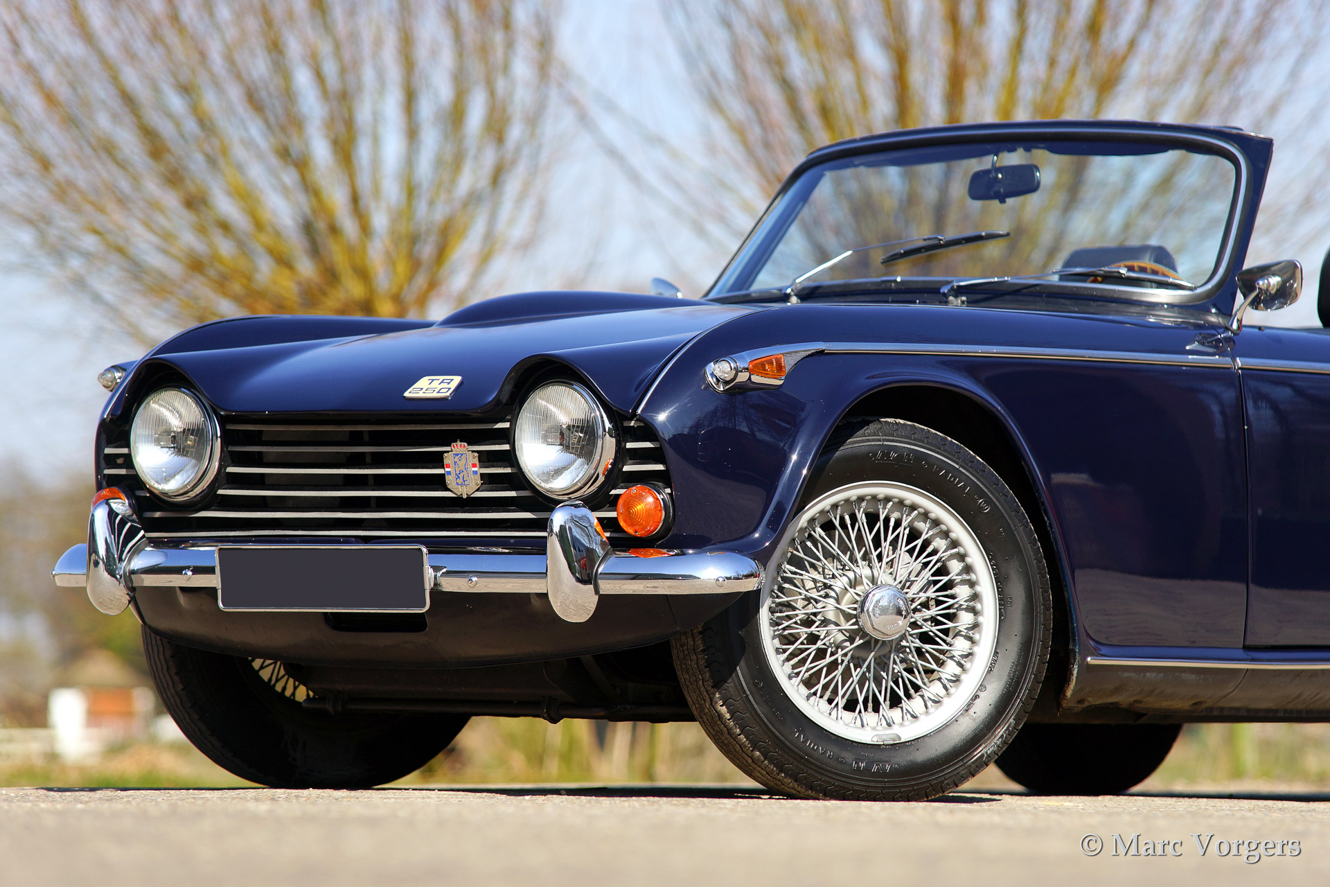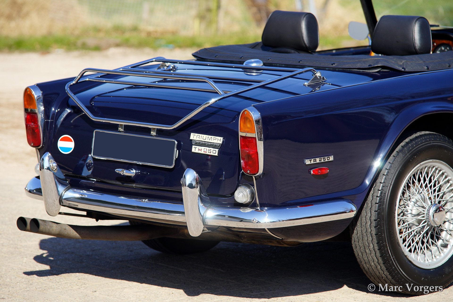 Triumph TR 250, year 1968. Colour dark blue with a black leather interior and black carpet. Black soft top and hood cover. This car features overdrive, special comfortable leather seats (mounted further backwards to create additional knee space for taller drivers), walnut dashboard, steering wheel with wooden rim, wire wheels, chrome luggage rack, aluminium rocker cover, a Stainless Steel exhaust and K&N sports air-filters.