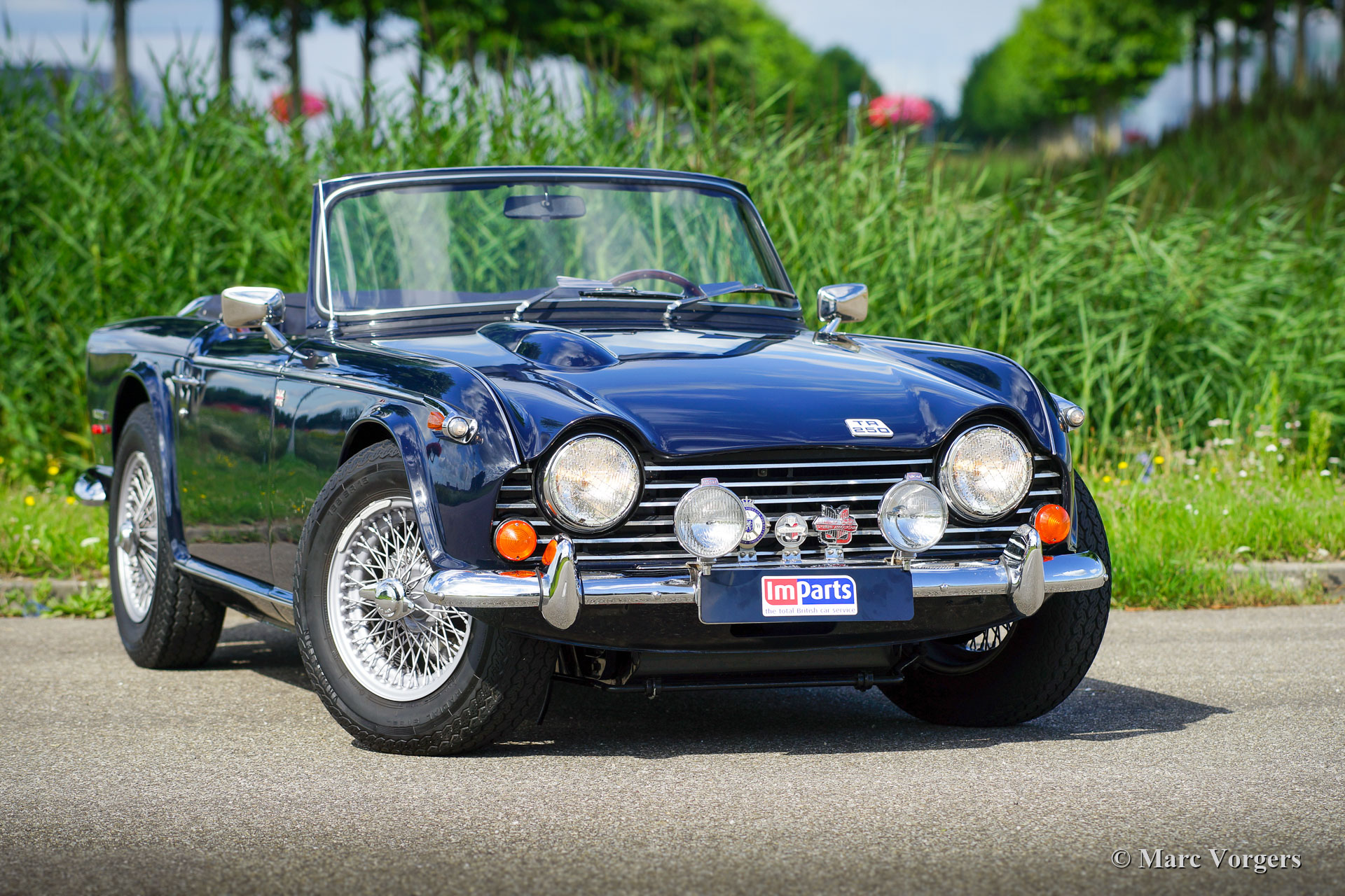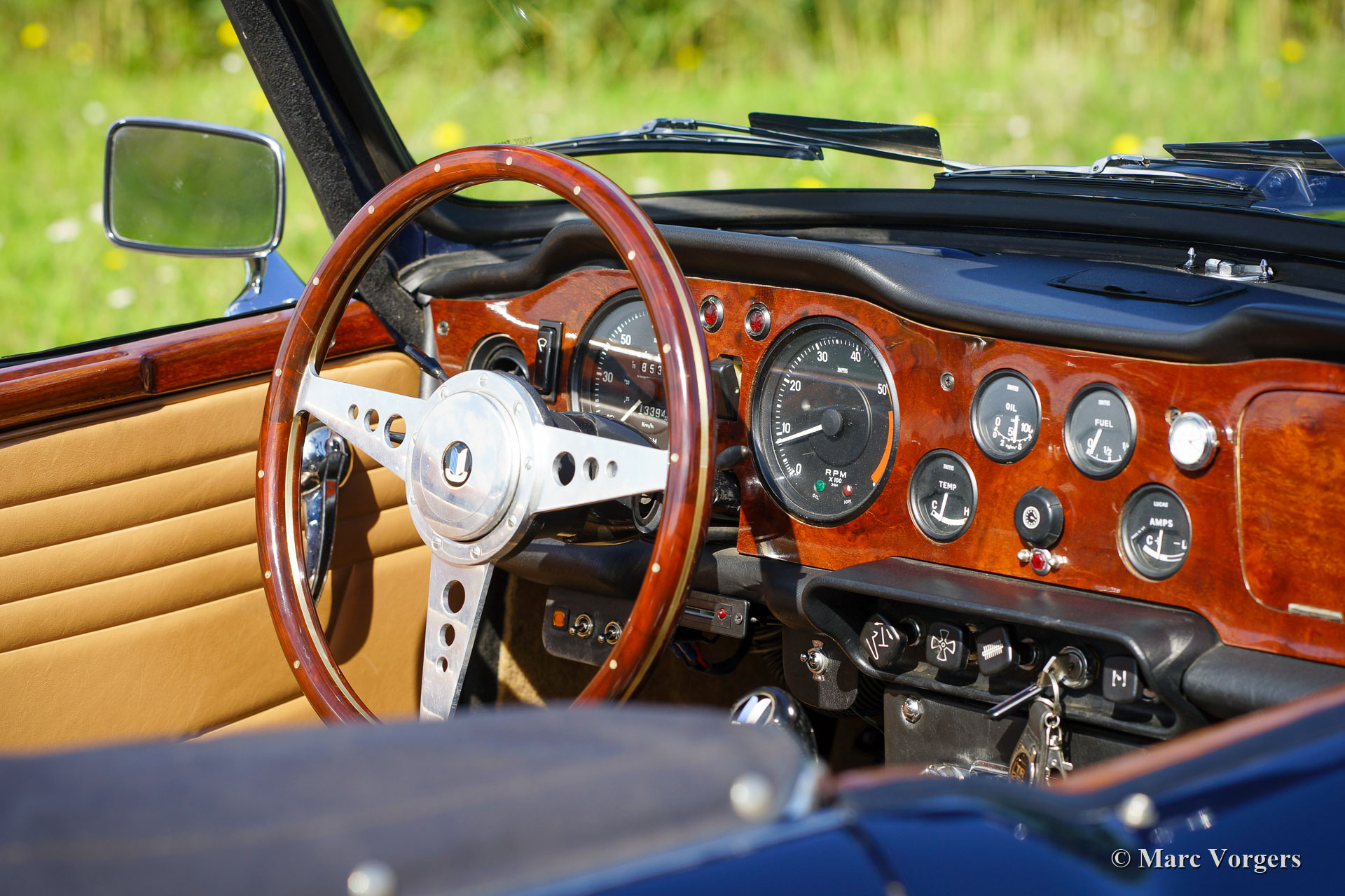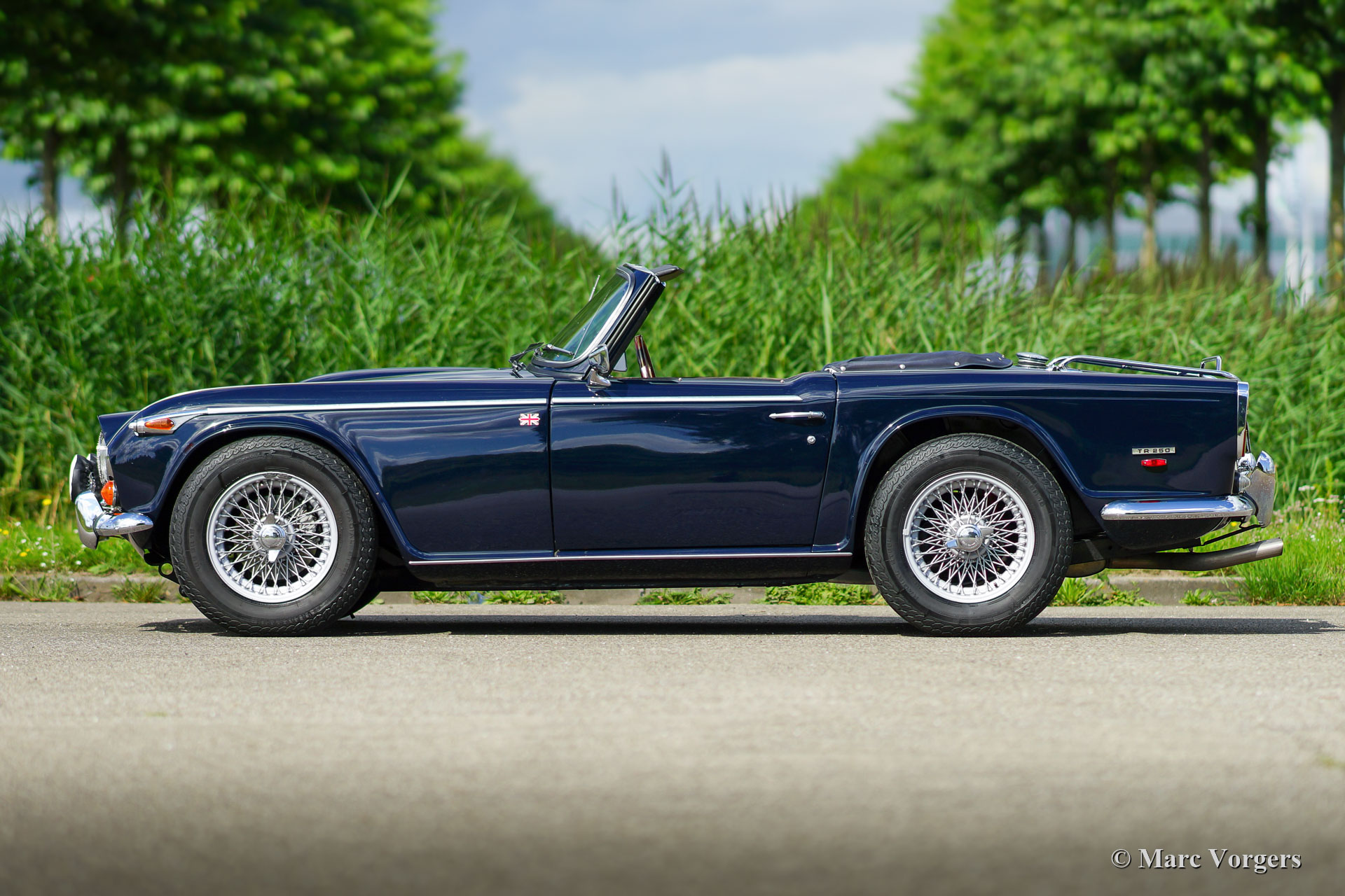 Triumph TR250, année 1968. Couleur bleu foncé (Royal Blue) combinée avec un intérieur en cuir beige et un tapis beige. Capote et capuchon en mohair bleu foncé. Cette belle Triumph TR250 a été importée des États-Unis par le propriétaire néerlandais actuel en 1997. Dans les premières années de possession, la voiture fut restaurée détaillée en parfait état. Le moteur a été révisé et équipé d'une paire de S.U. carburateurs. La voiture fut magnifiquement entretenue, la voiture est en très bon à excellent état, ne montrant que de légères traces d'utilisation. Le moteur six cylindres de 2,5 litres a un son fantastique et la voiture roule et pilote parfaitement. La voiture dispose de nombreuses options souhaitables: Overdrive, roues métalliques peintes en argent, phares Lucas / antibrouillard, une barre de badges avec badges, un échappement en acier inoxydable, une radio Triumph classique, un porte-bagages chromé, un allumage électronique, un refroidissement électrique ventilateur, pneus Vredestein 185-15 et ceintures de sécurité classiques à 2 points. C'est une Triumph TR250 magnifique et très complète.