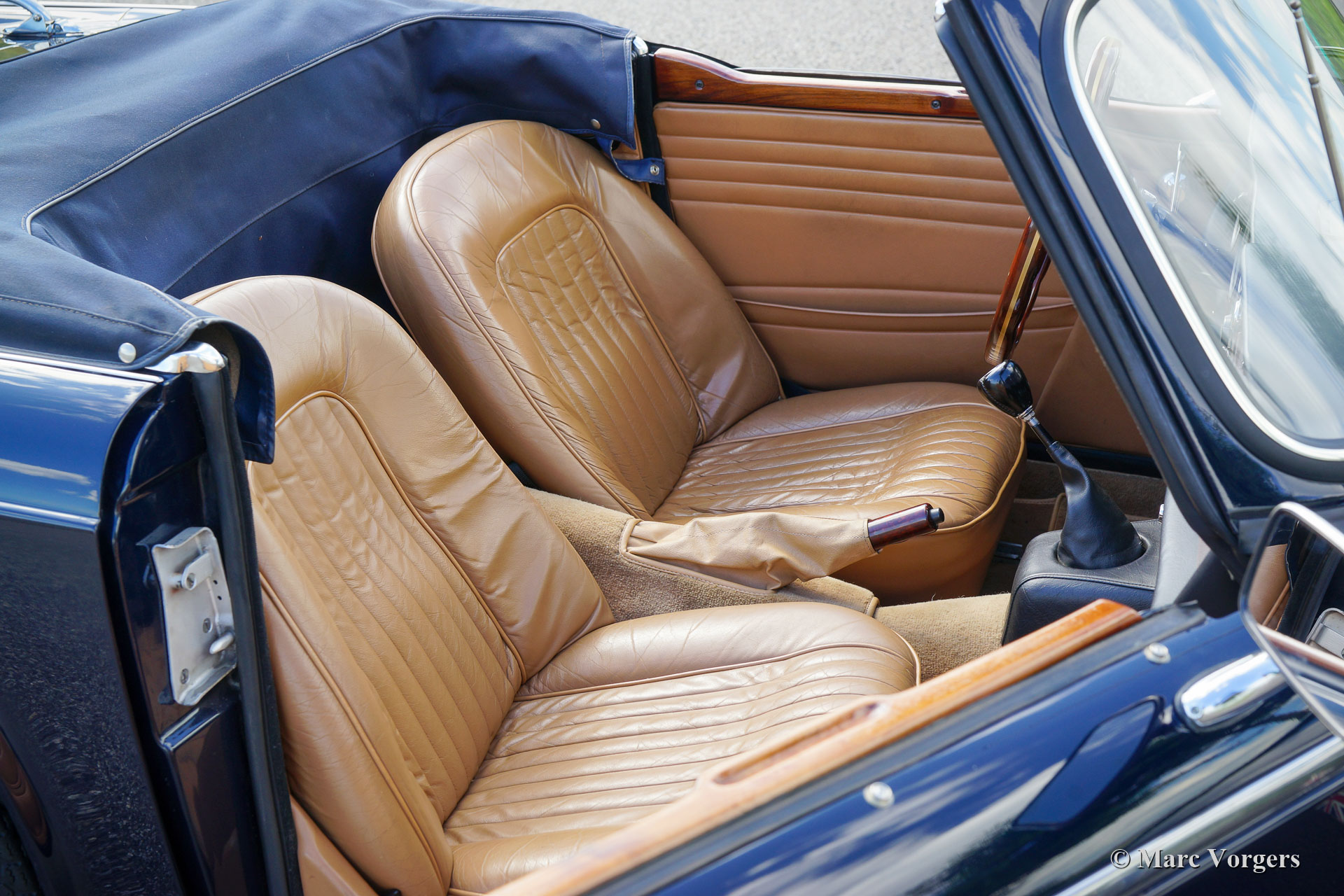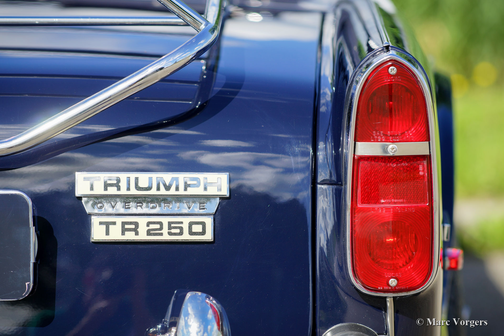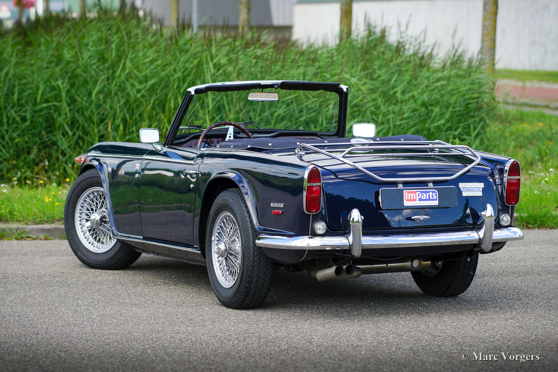 Triumph TR250, année 1968. Couleur bleu foncé (Royal Blue) combinée avec un intérieur en cuir beige et un tapis beige. Capote et capuchon en mohair bleu foncé. Cette belle Triumph TR250 a été importée des États-Unis par le propriétaire néerlandais actuel en 1997. Dans les premières années de possession, la voiture fut restaurée détaillée en parfait état. Le moteur a été révisé et équipé d'une paire de S.U. carburateurs. La voiture fut magnifiquement entretenue, la voiture est en très bon à excellent état, ne montrant que de légères traces d'utilisation. Le moteur six cylindres de 2,5 litres a un son fantastique et la voiture roule et pilote parfaitement. La voiture dispose de nombreuses options souhaitables: Overdrive, roues métalliques peintes en argent, phares Lucas / antibrouillard, une barre de badges avec badges, un échappement en acier inoxydable, une radio Triumph classique, un porte-bagages chromé, un allumage électronique, un refroidissement électrique ventilateur, pneus Vredestein 185-15 et ceintures de sécurité classiques à 2 points. C'est une Triumph TR250 magnifique et très complète.