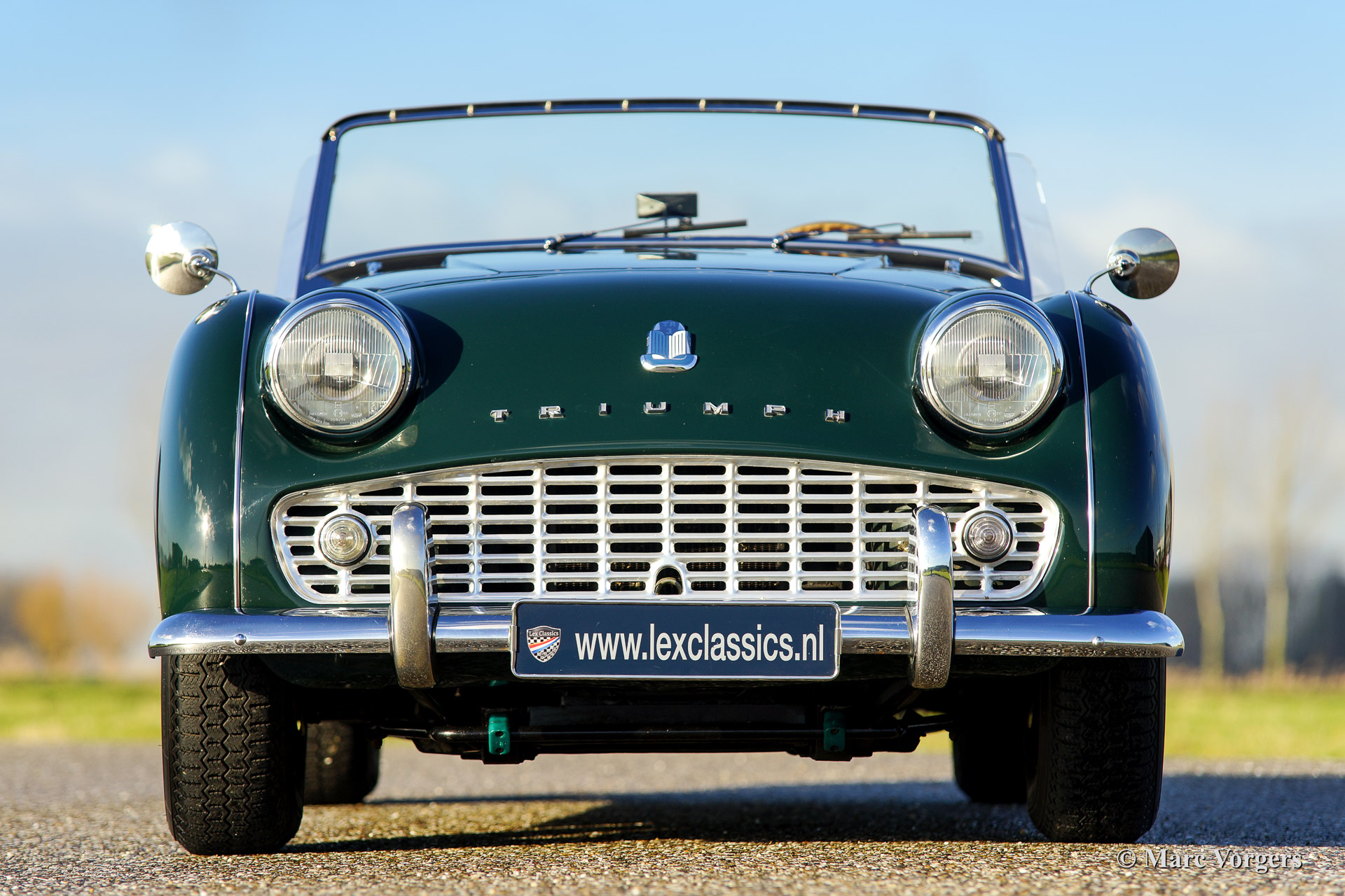 The Triumph TR 3 was uprated twice during the entire production period. In 1957 the car became a wider grille, door handles on the outside and slightly recessed headlamps and was named TR 3a then. In 1960-61 the cylinder capacity was enlarged to 2138 cc. giving a capacity of 104 bhp. and extra torque. Also the fully synchronized TR4 gearbox was incorporated. The car was then named TR 3b. The TR 3 is a pure two-person roadster, a classic generously giving you the fifties British sports car feeling, rough but honest. It comes with a simple soft-top for weather protection. Separate clip-on side screens can additionally be attached to the doors.