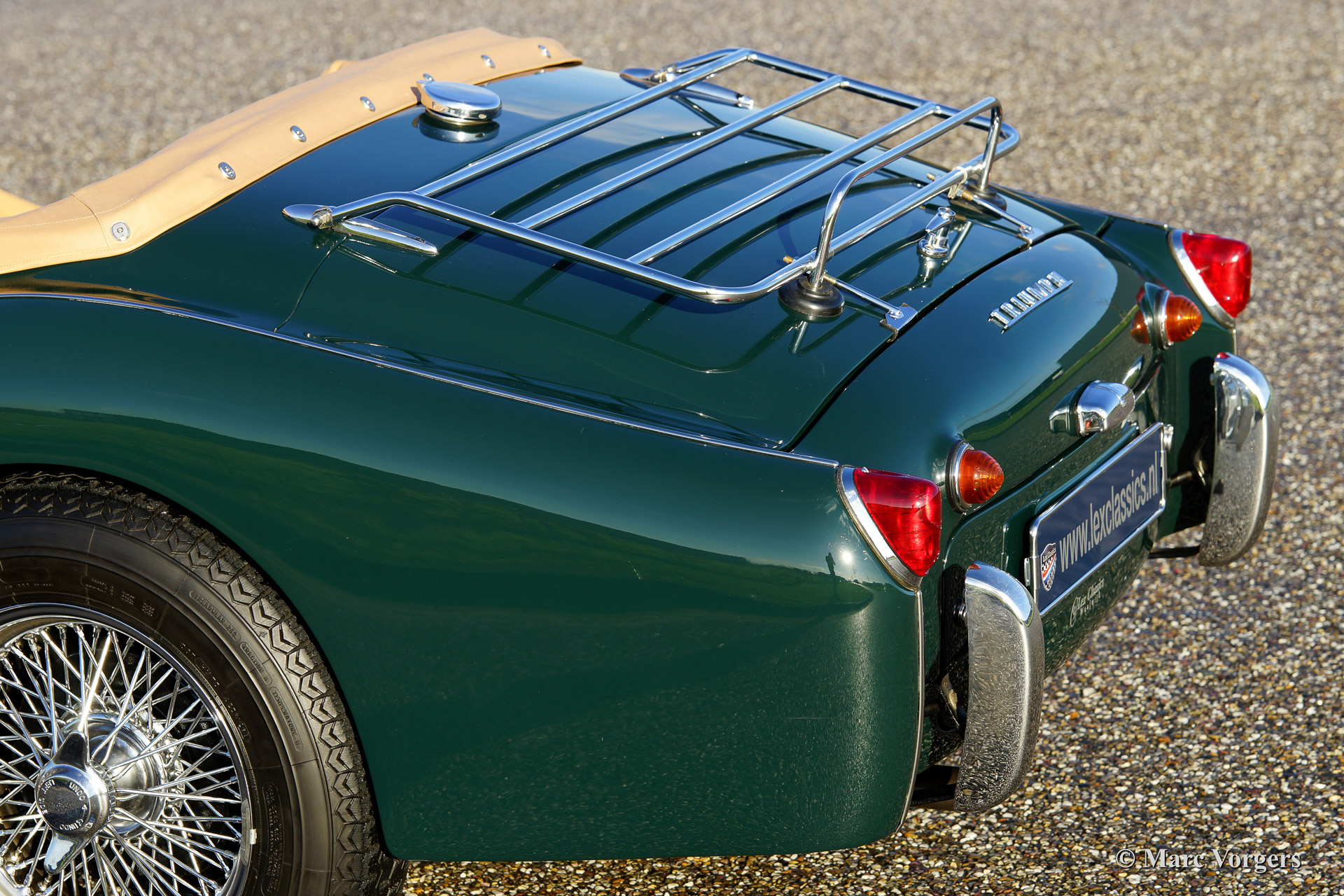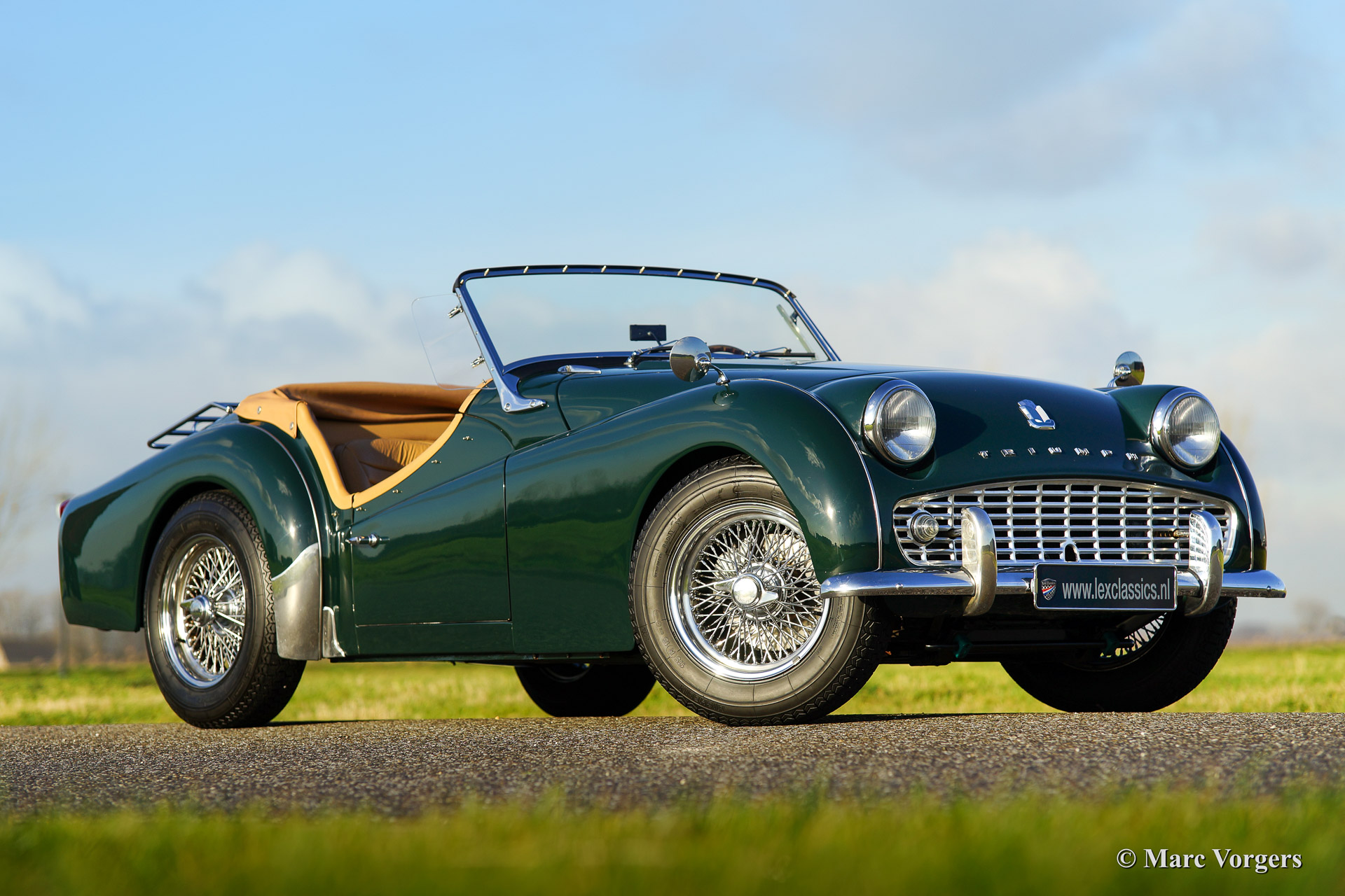Triumph TR 3a, year 1958. Colour British Racing Green with a tan (beige) leather interior. Beige vinyl soft top, beige side screens, hood cover and a tonneau cover. This magnificent Triumph TR 3a was imported from the USA in the year 2001. The automobile was beautifully 'body off' restored in the Netherlands. Since the restoration the car has driven 9.187 miles. The car is in concour condition. This TR 3a sports wide chrome wire wheels, chrome 'eared' wheelnuts, sports steering wheel with wooden rim and a chrome luggage rack. A very beautiful and delightful driving Triumph TR!