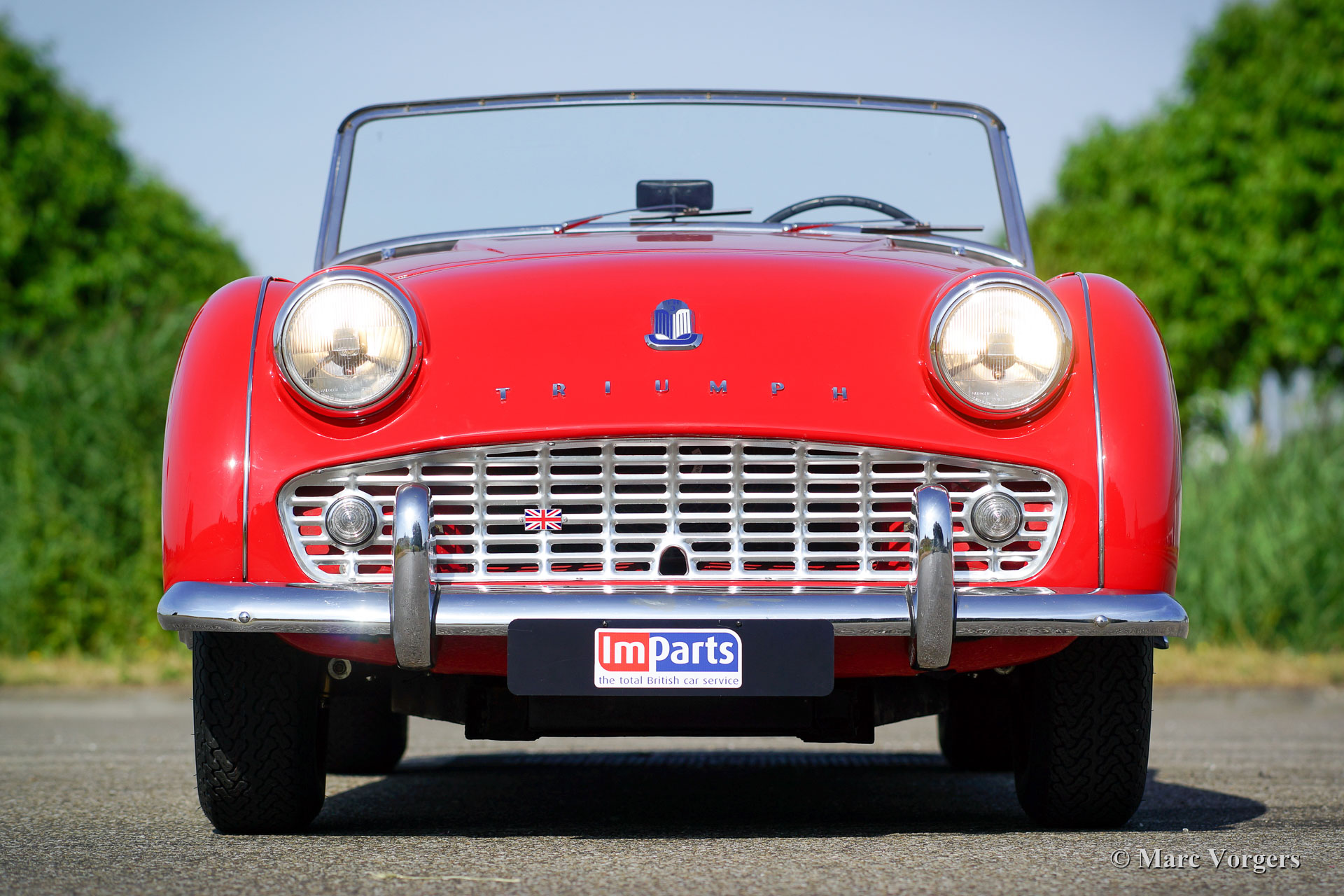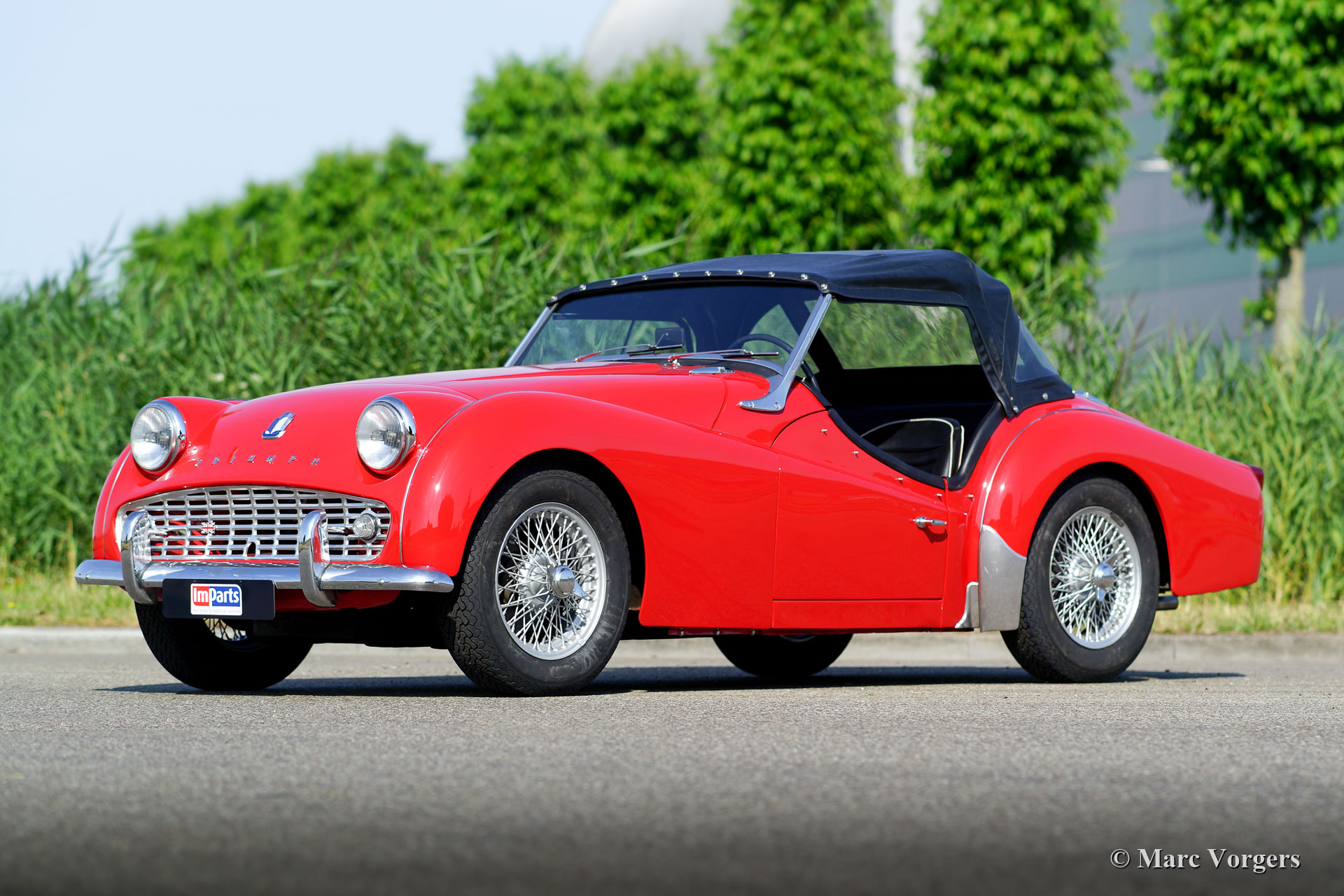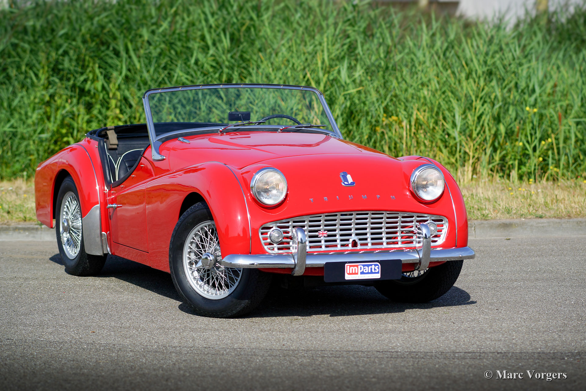 Triumph TR 3A, année 1959. Couleur rouge avec un intérieur en similicuir noir et tapis noir. Soft-top et écrans latéraux en vinyle noir. Ce magnifique Triumph TR 3A est en excellent état. La voiture fut entretenue superbe à travers les années. Récemment, un échappement en acier inoxydable fut monté et les roues furent chaussées de nouveaux pneus Blockley. Ce TR 3A montre tous les détails d'origine et il est équipé d'un bouton de changement de bois et d'un ventilateur de refroidissement électrique. Ce Triumph TR 3A est actuellement enregistré en Belgique. Un exemple souhaitable !